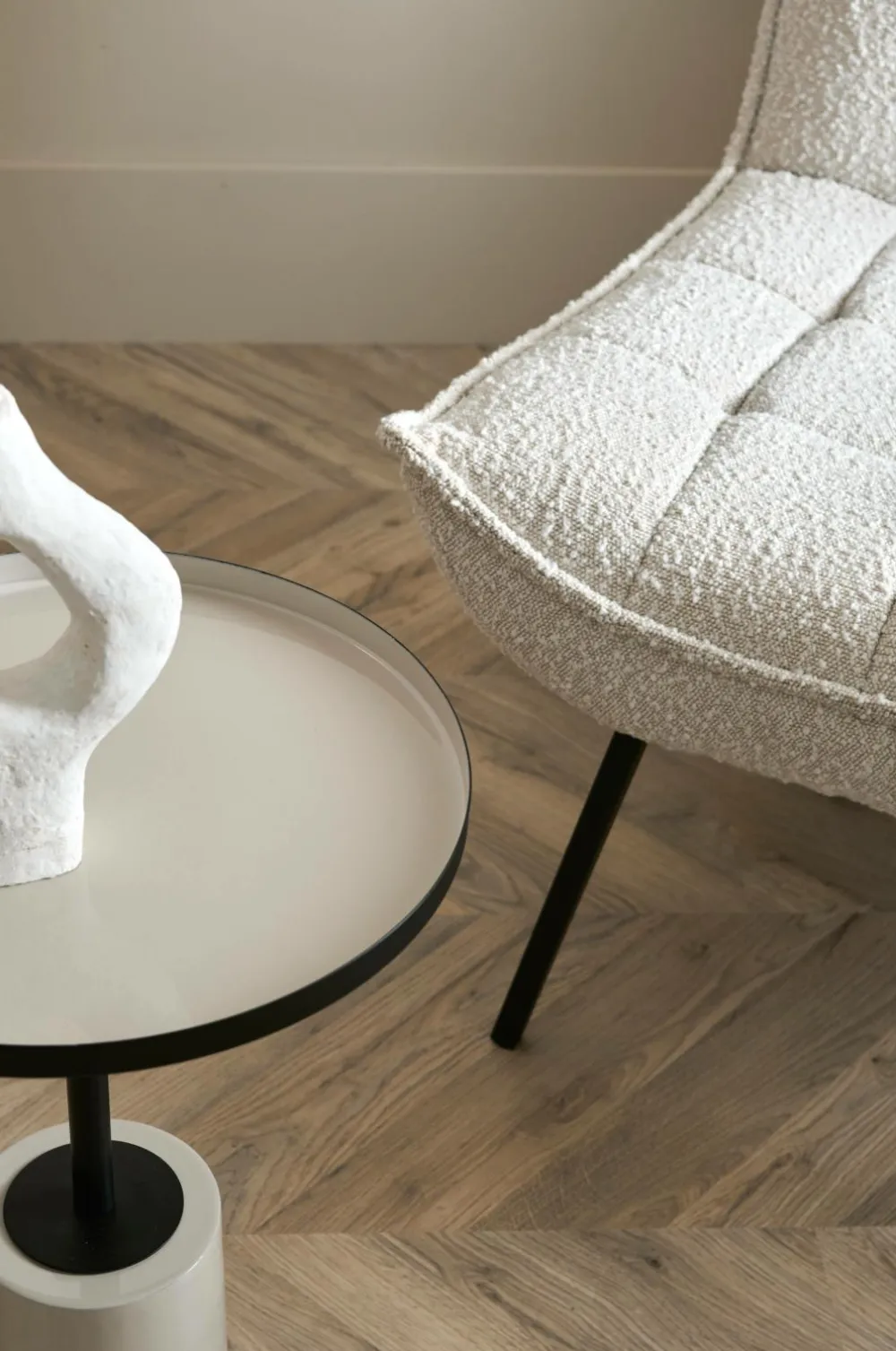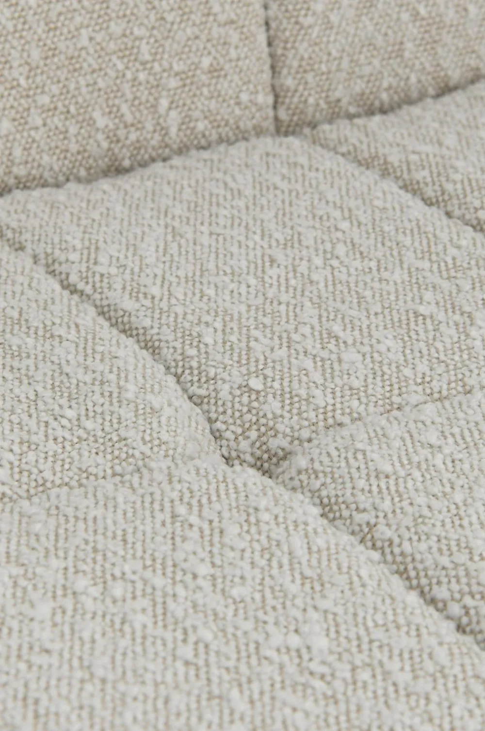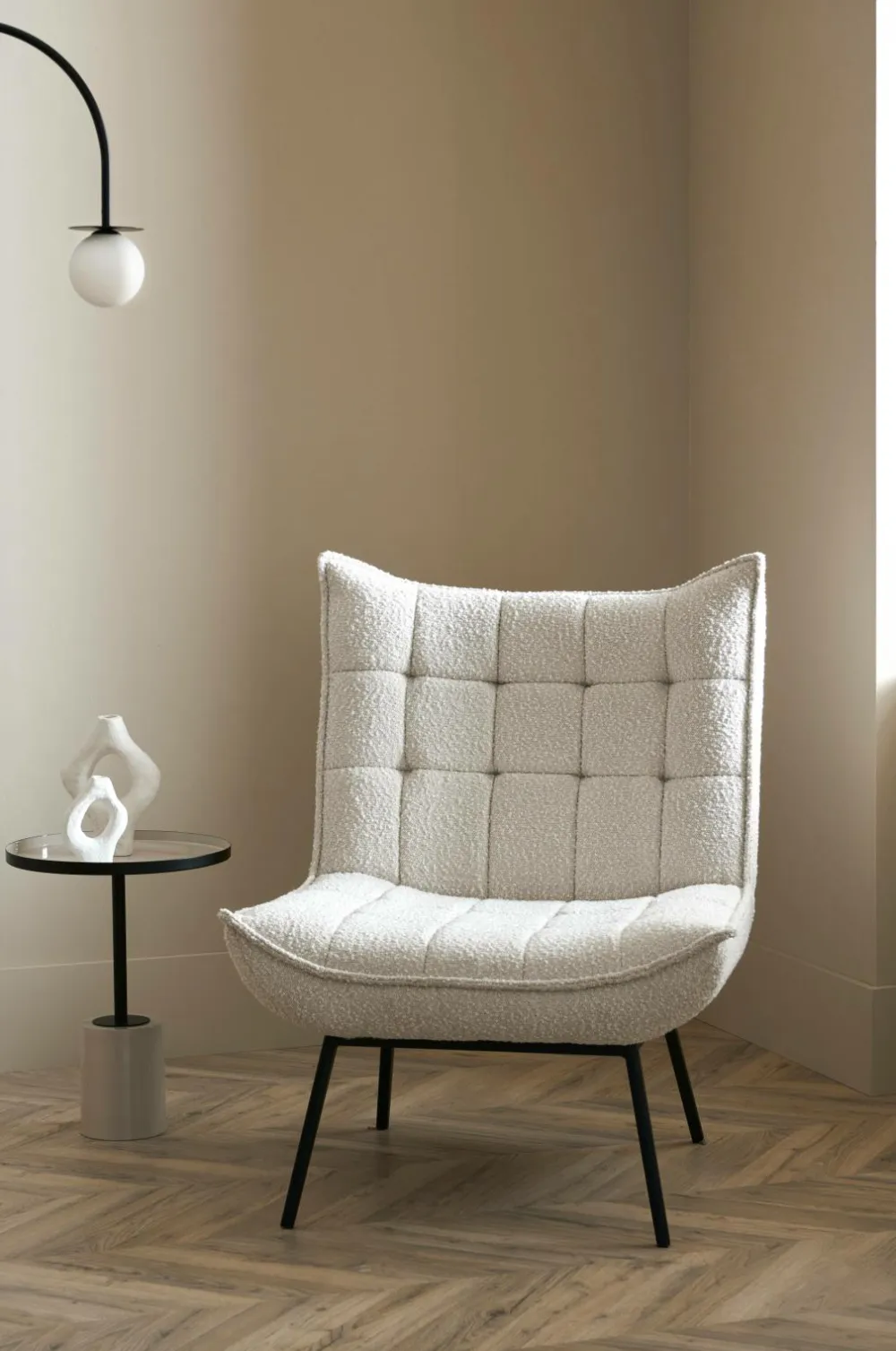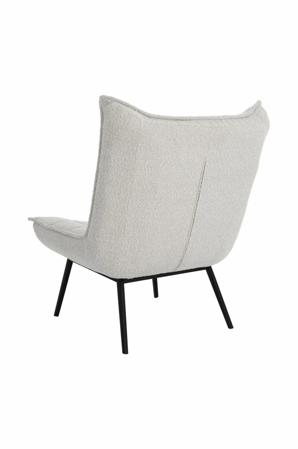 Lænestol med paspoleret kant rundt om. Betræk i bouclé med indfældninger, der danner et dekorativt ternet mønster. Skumfyld. Ben af metal. Lettere samling.