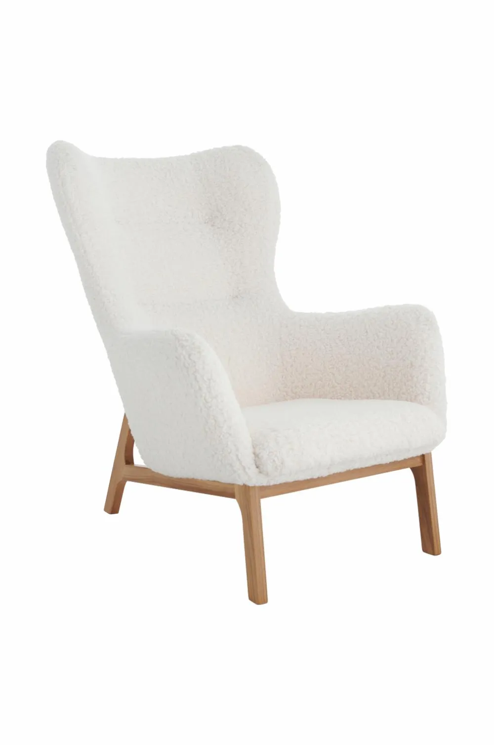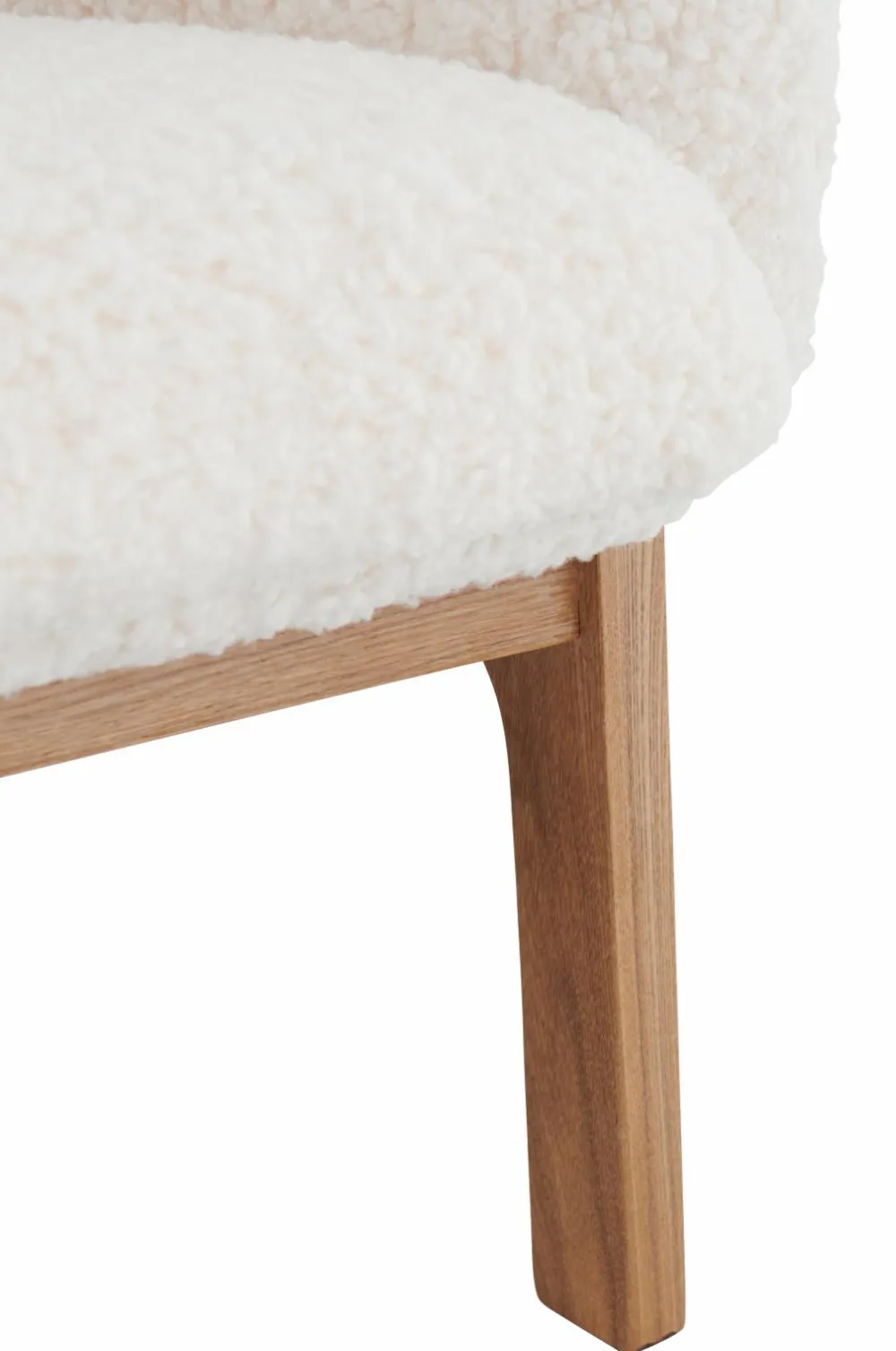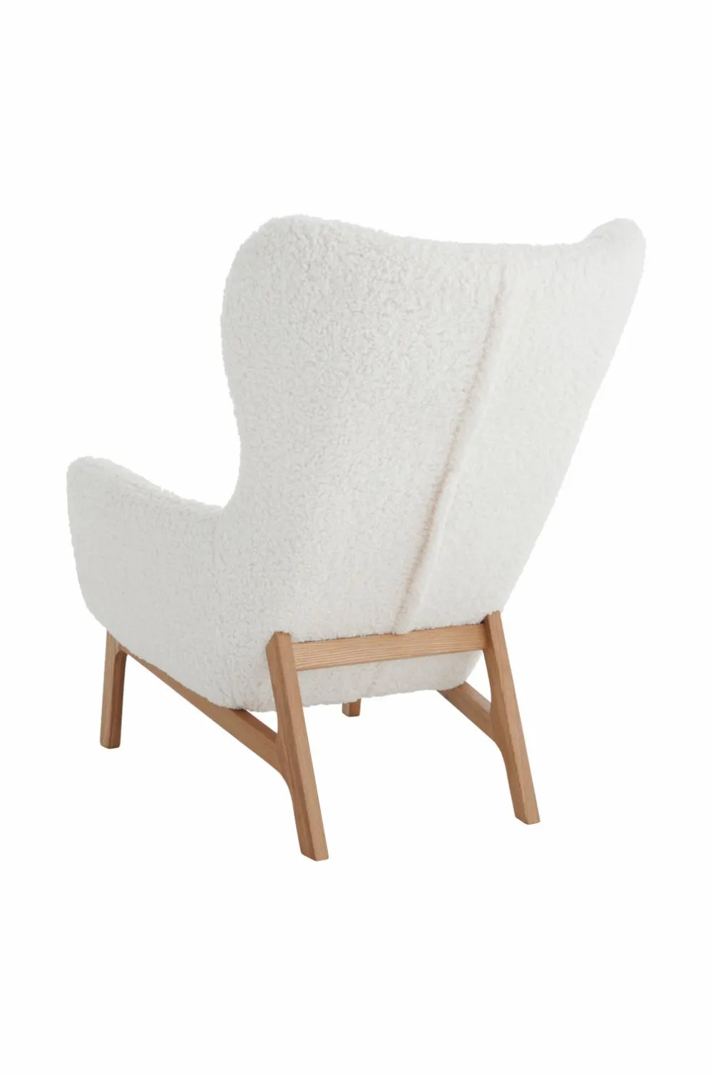 Lænestol med stel i massiv ask og yderstof i imiteret fåreskind af polyester.