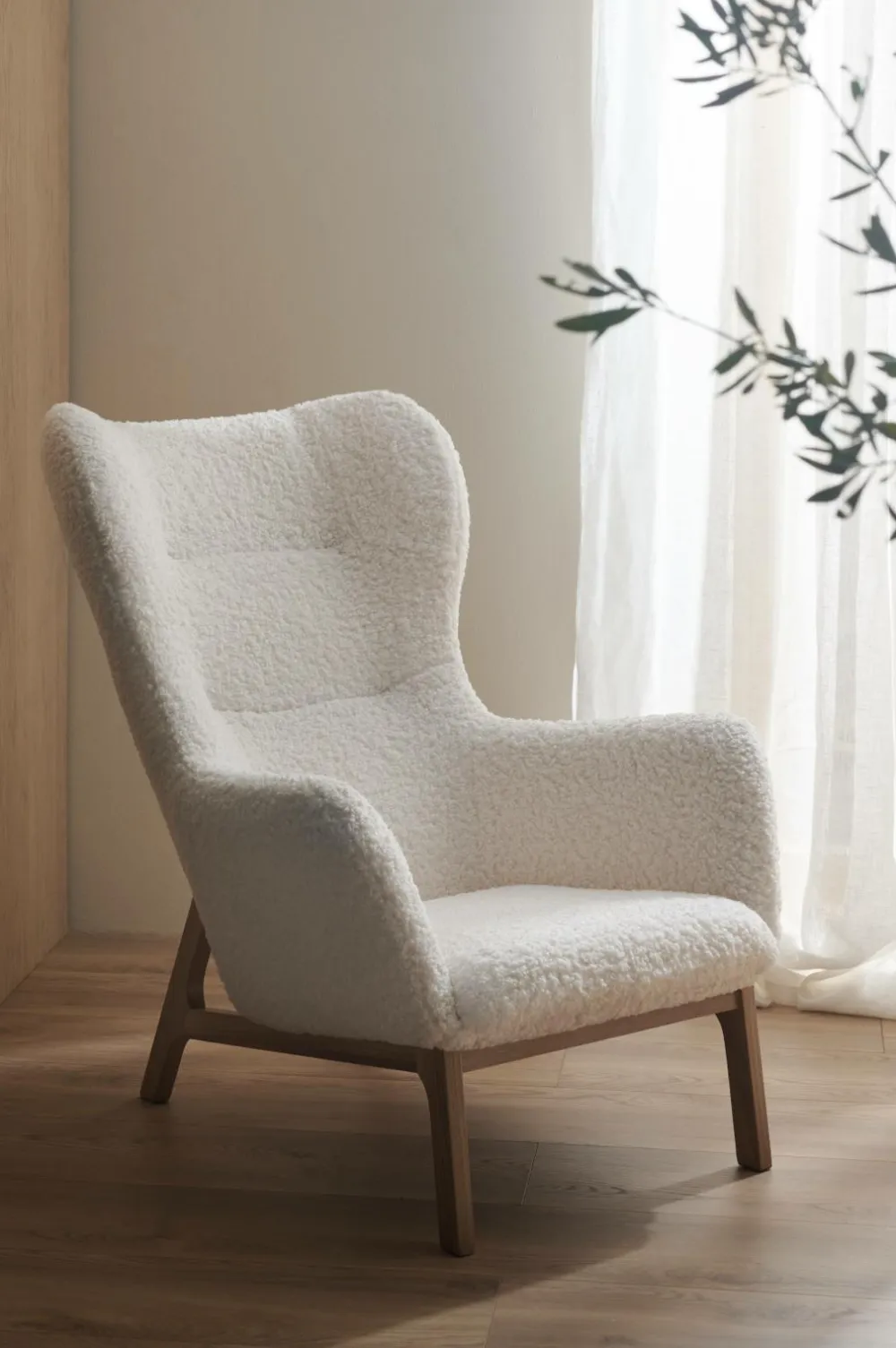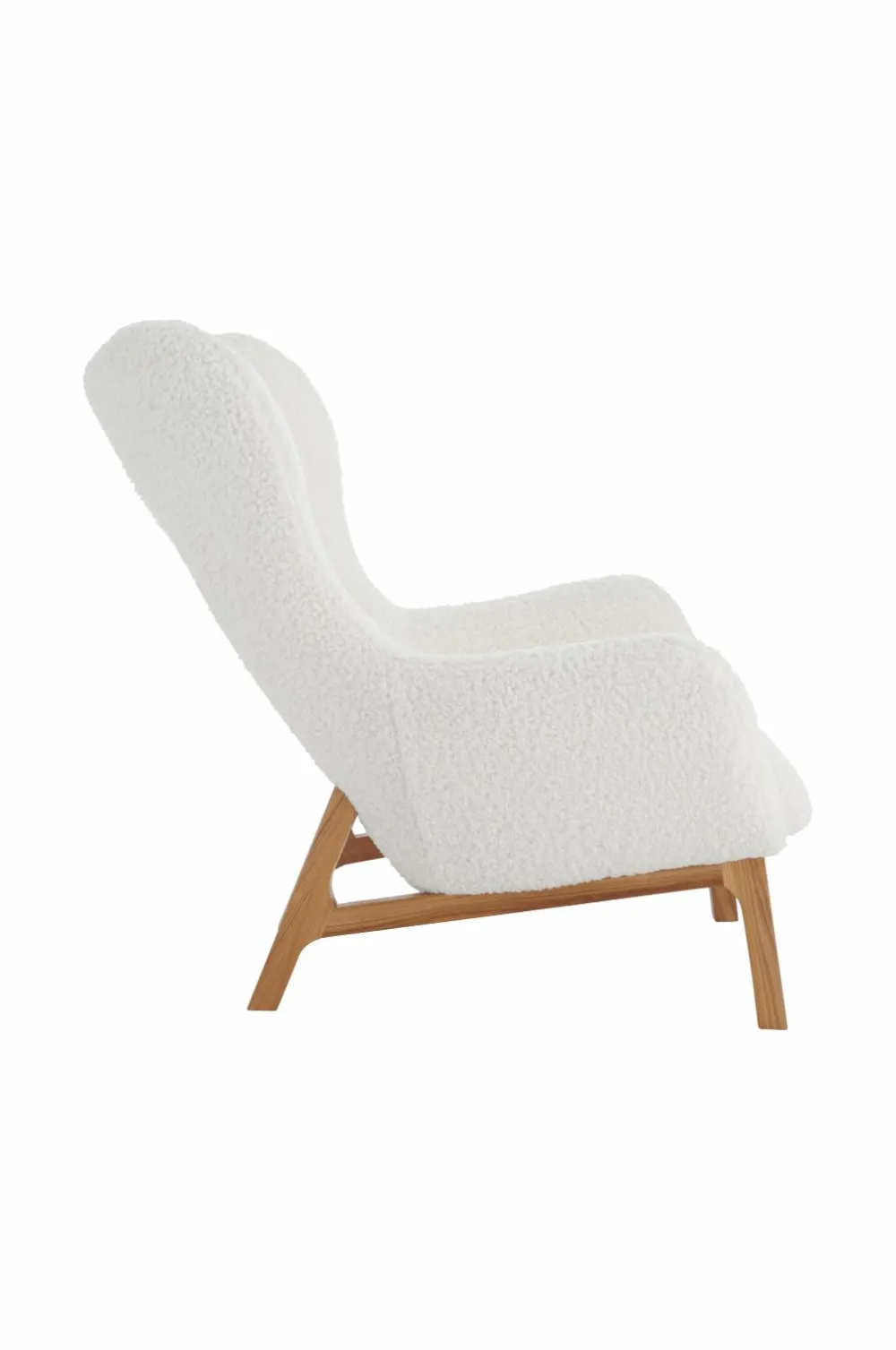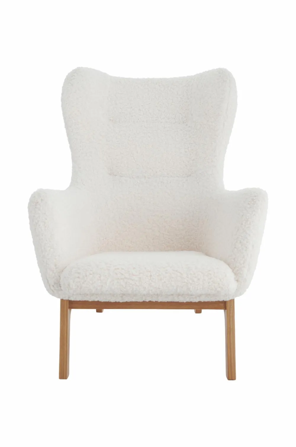 Lænestol med stel i massiv ask og yderstof i imiteret fåreskind af polyester.