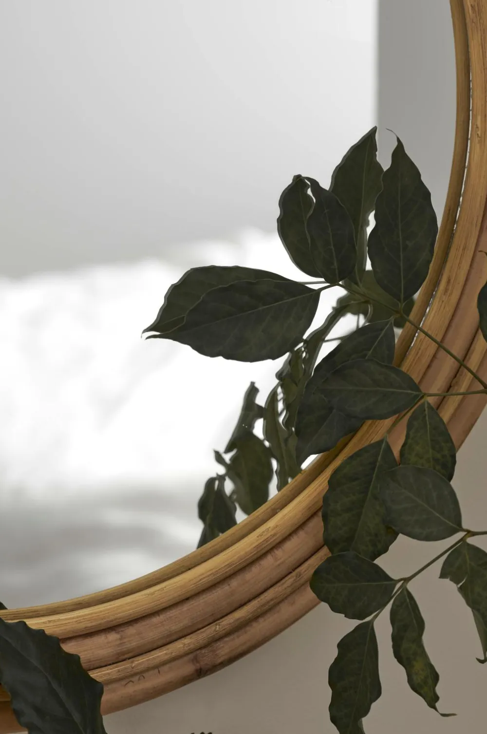 Spejl med ramme og ophæng i rotting. Samlet mål: Højde inkl. ophæng 73 cm, dybde 2,5 cm, Ø 60 cm. Spejlglasset er Ø 47 cm.