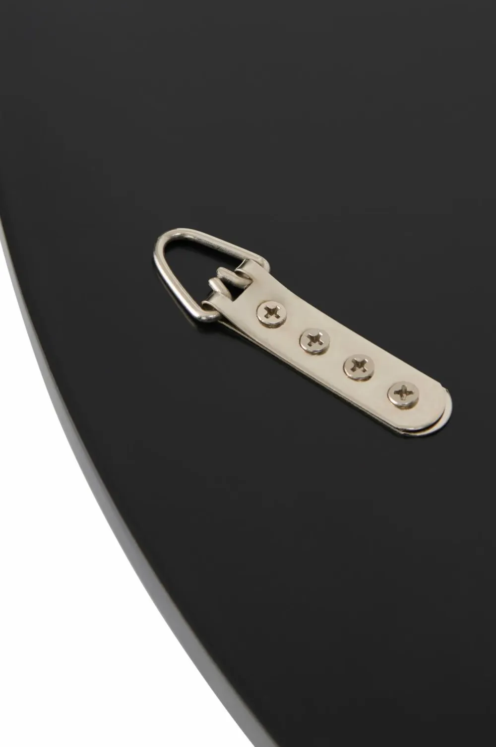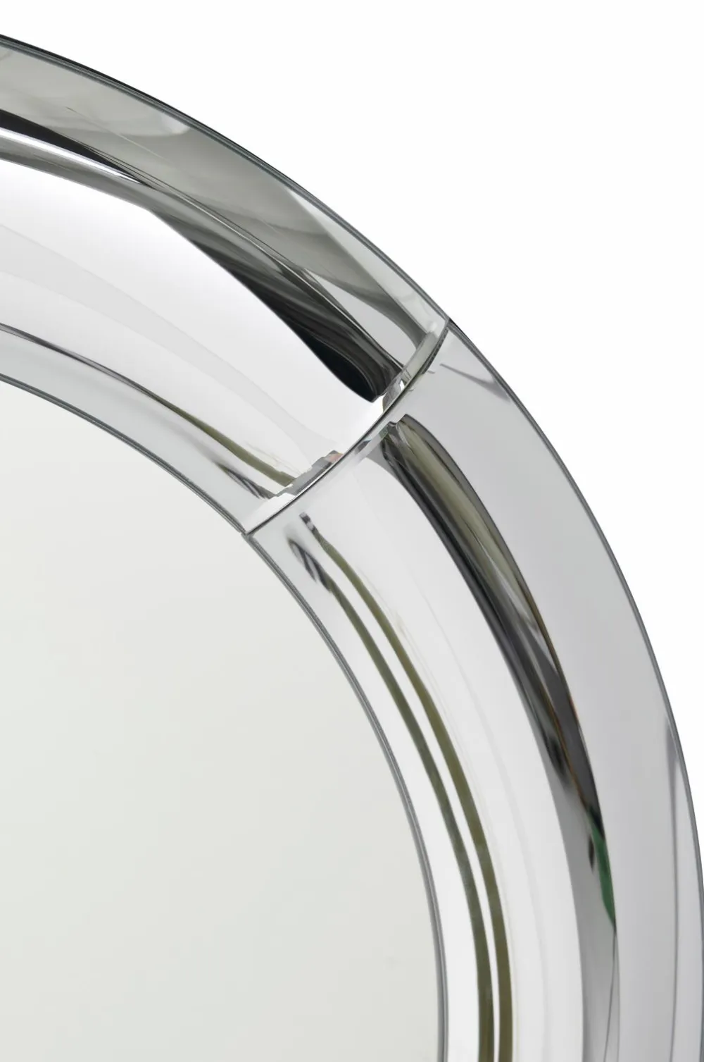 • Rundt spejl med bred ramme i skinnende, sølvfarvet MDF