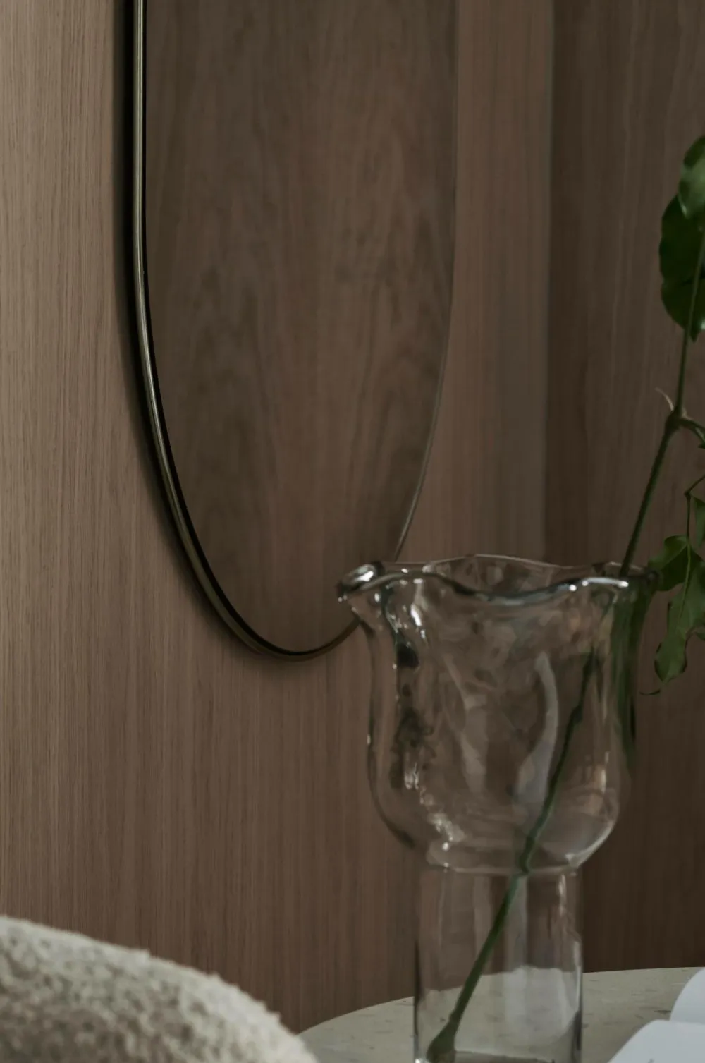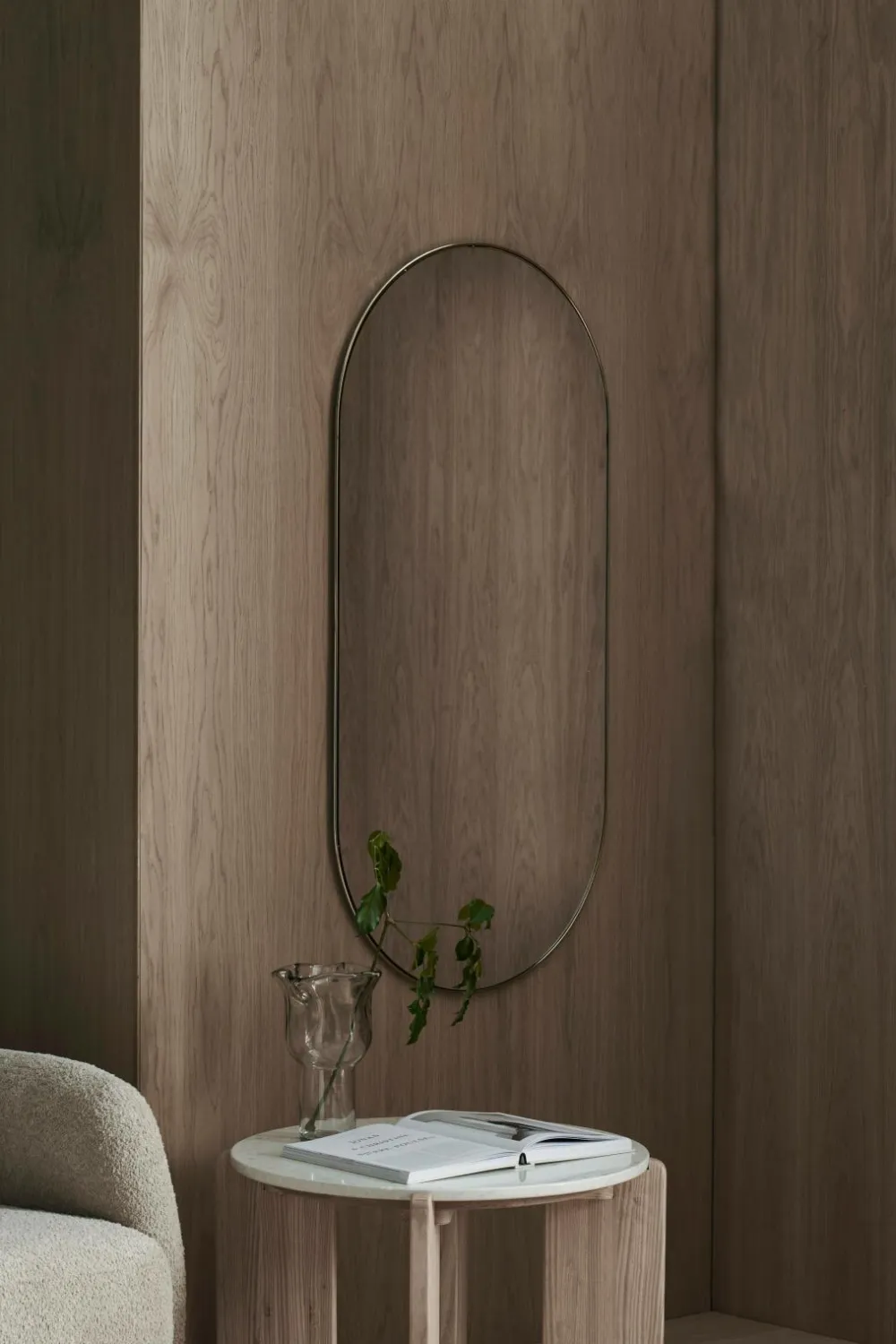 Ovalt spejl med en 6 mm metalramme. Højde 119,5 cm, bredde 59 cm, dybde 1,5 cm. 4 vægbeslag på bagsiden.