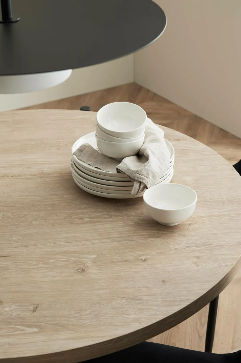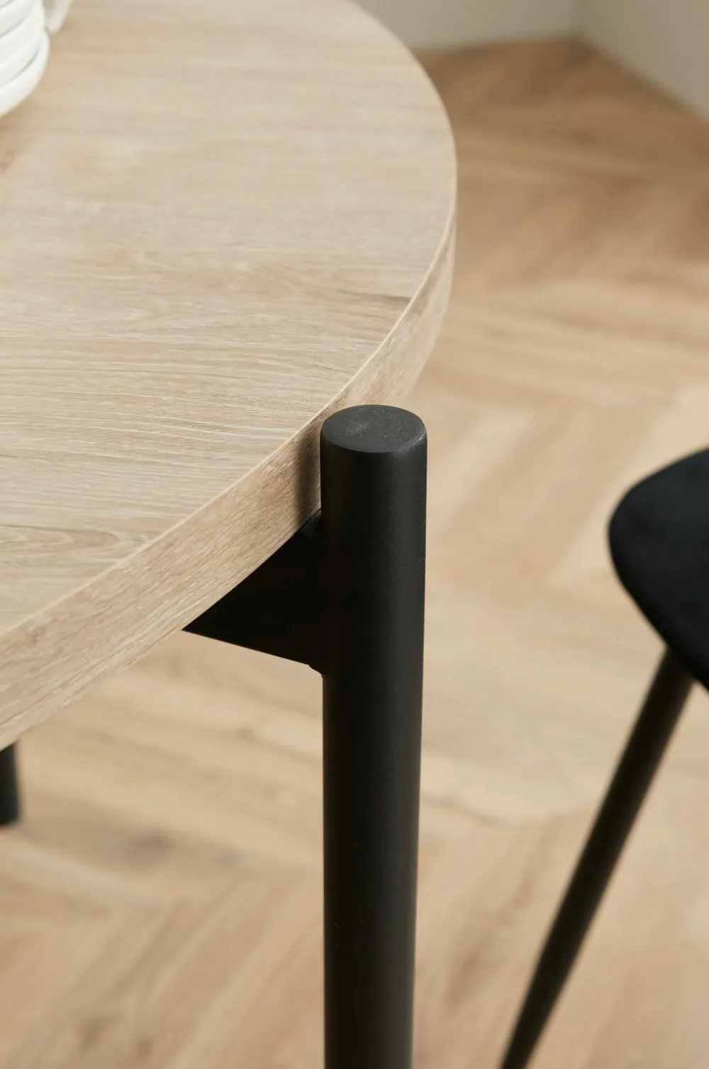 • Spisegruppe med 1 bord og 4 stole. Bordet har pulverlakerede metalben og en bordplade i folieret MDF. Spisesættet omfatter 4 stole med metalben og et sæde med skumfyld og fløjlsbeklædning. Mål på bordet: Højde 75 cm, diameter Ø 110 cm. Mål på stolene: Højde 85 cm, Bredde 44 cm, Dybde 54 cm.