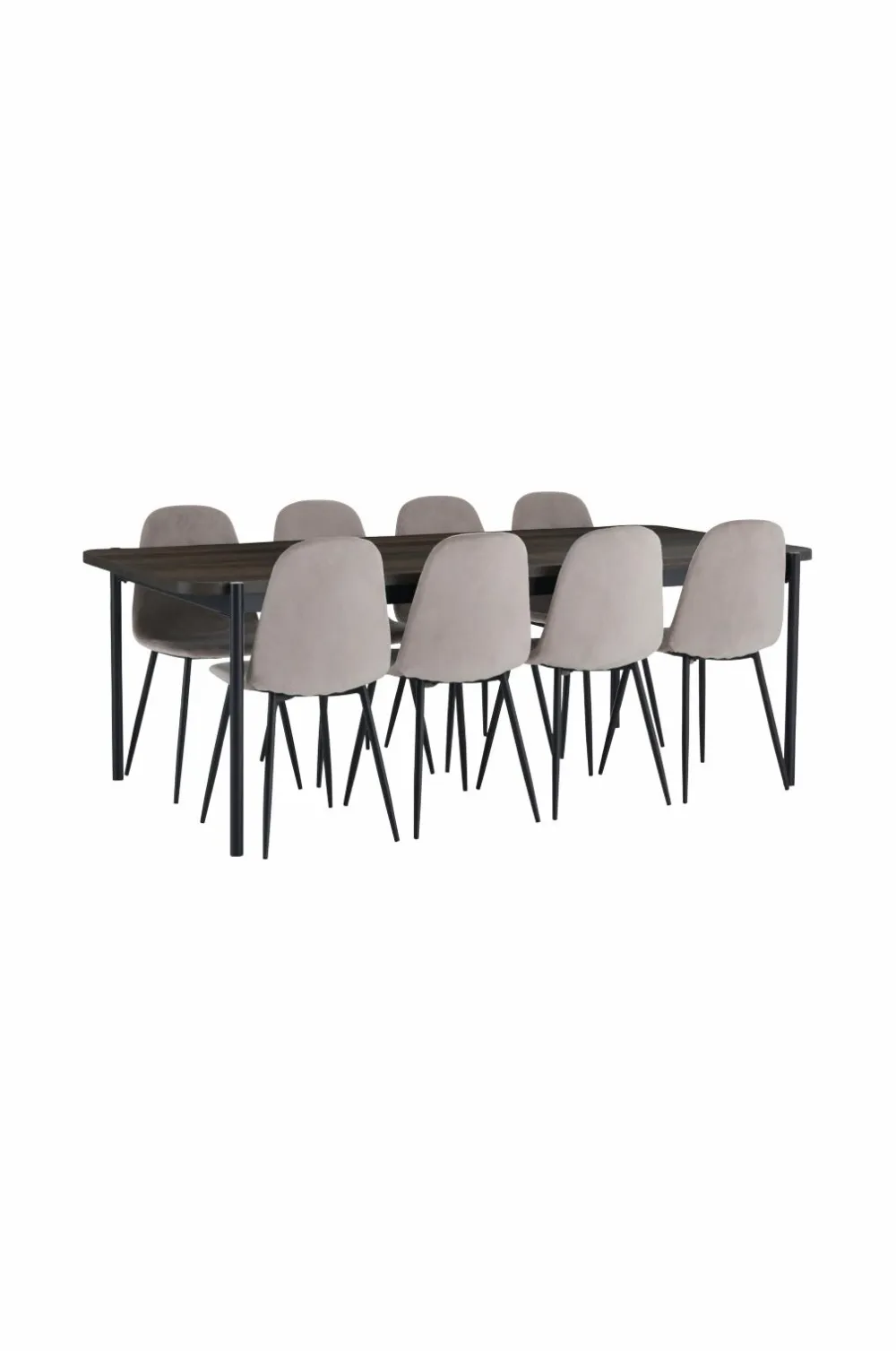 Spisegruppe med bord og otte stole. Bordet har pulverlakerede metalben og en plade i folieret MDF.