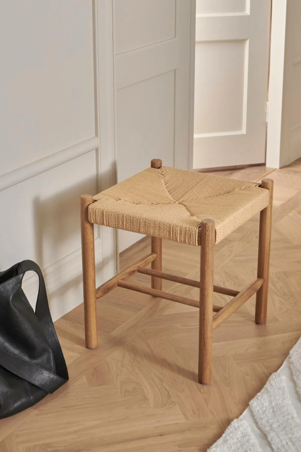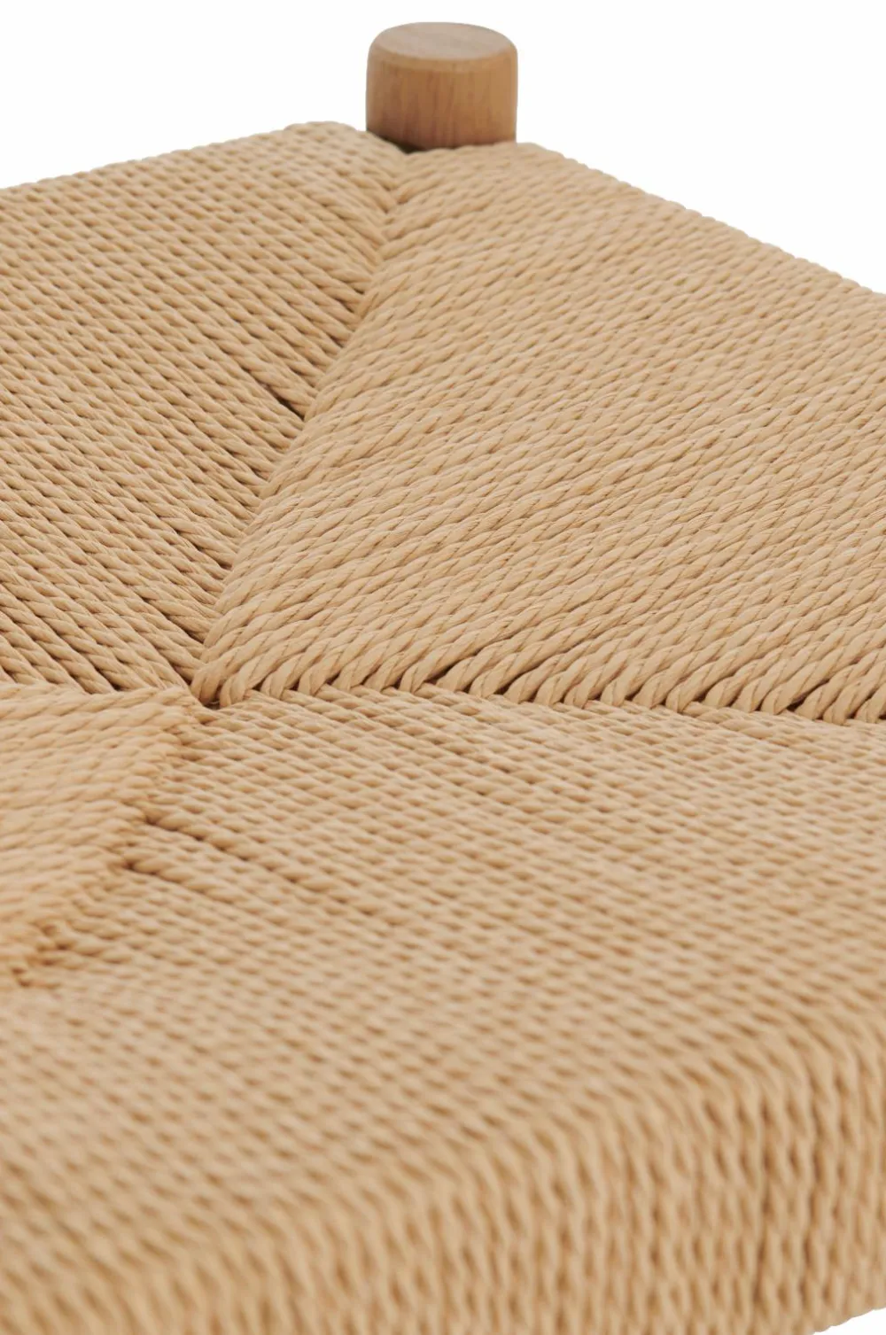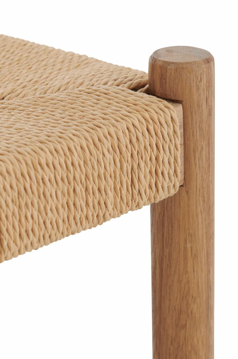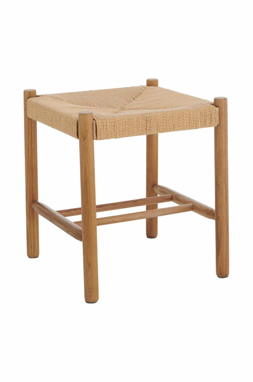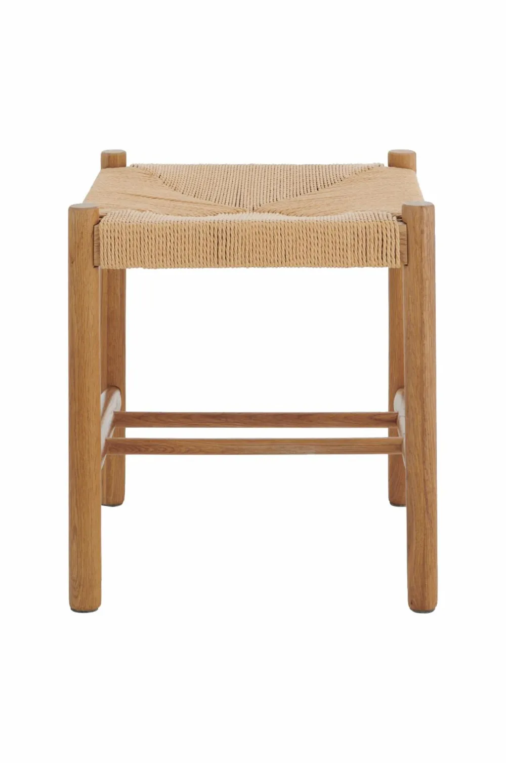 Taburet med ben og stel i massiv eg. Sæde af flettet, vokset papirsreb.