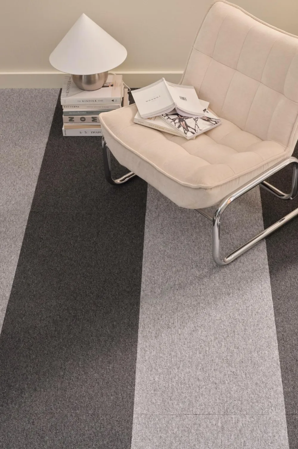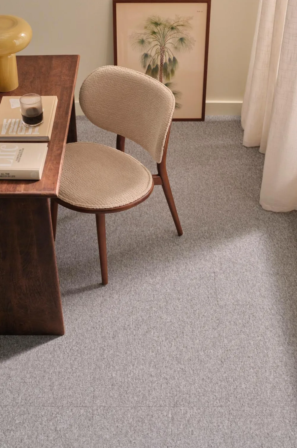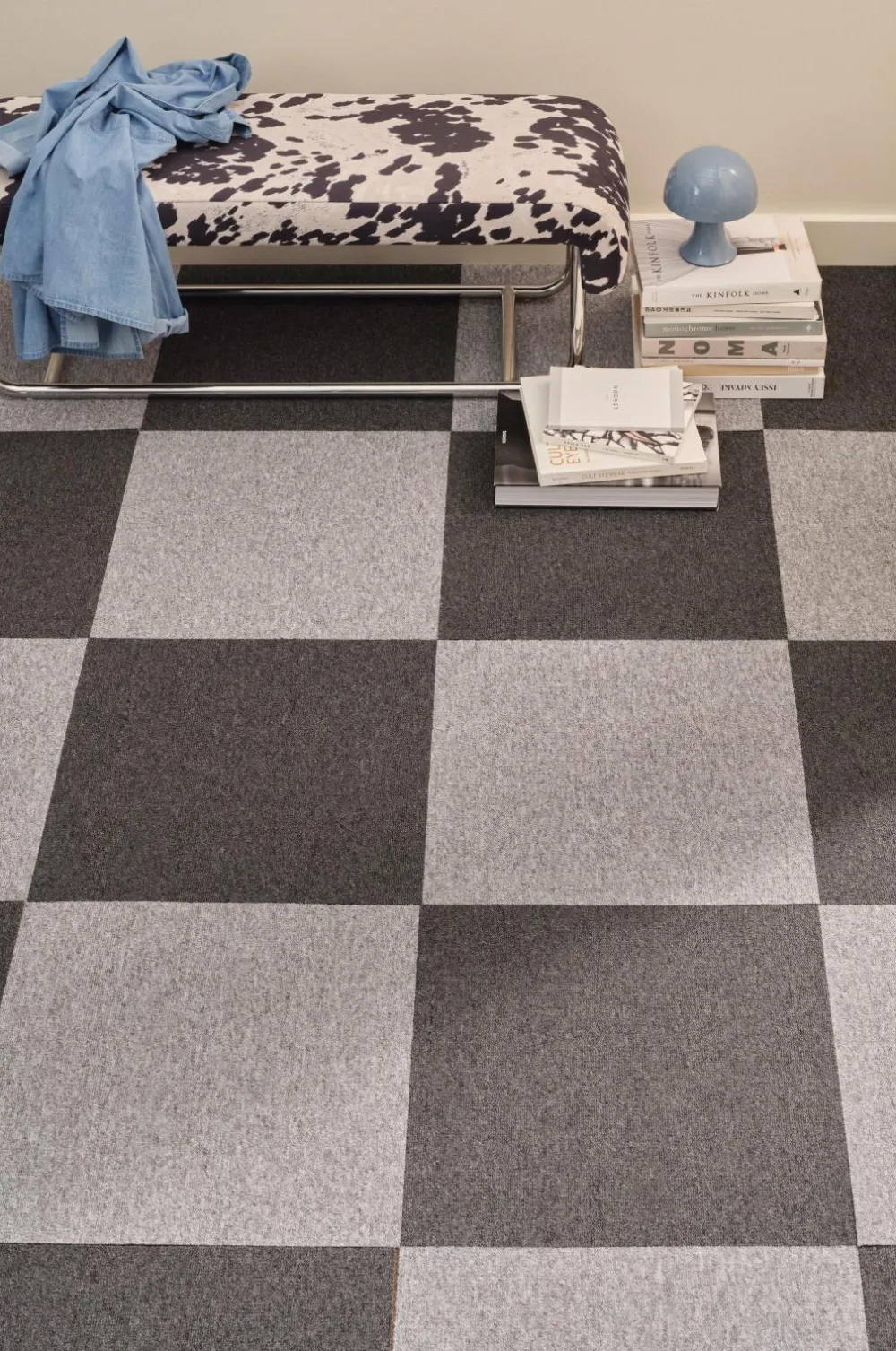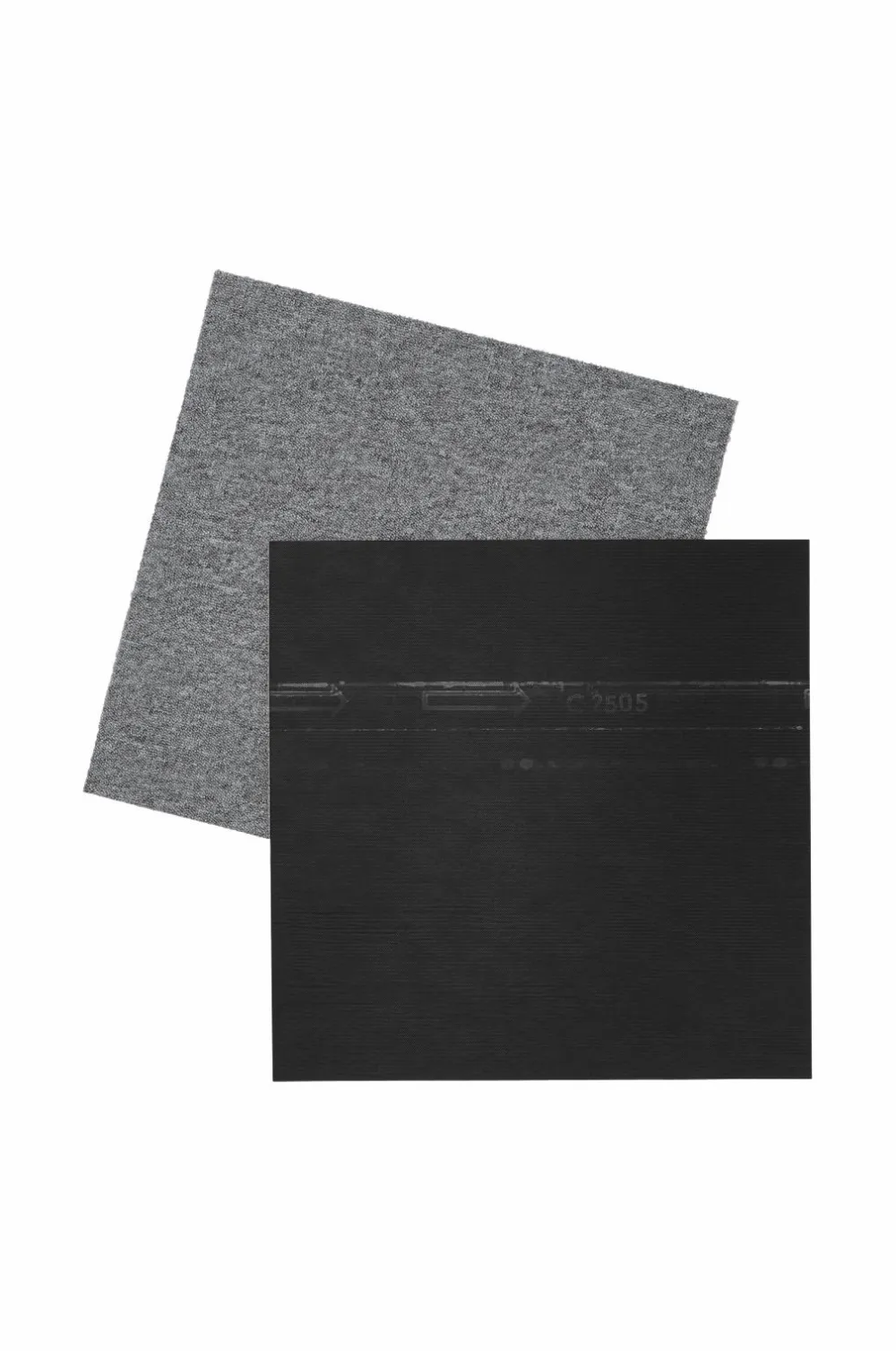 Tekstilgulvfliser lagt som et tæppe med dobbeltklæbende tape rundt om kanterne. For at tilpasse størrelsen skal du skære fliserne til i den rigtige form med en tæppekniv.