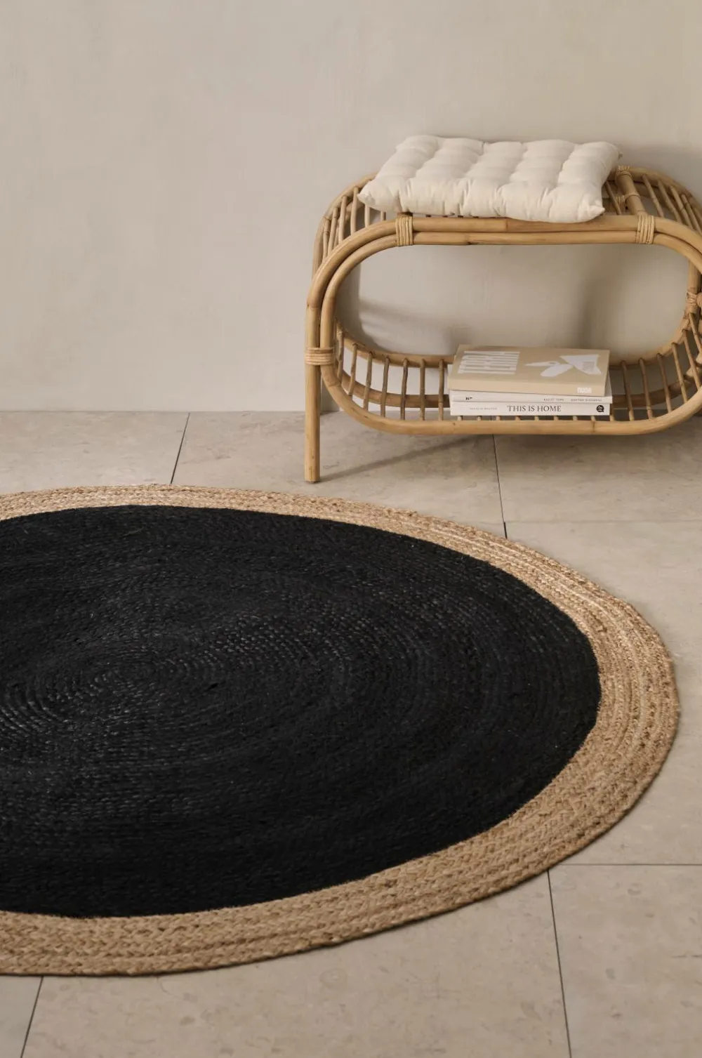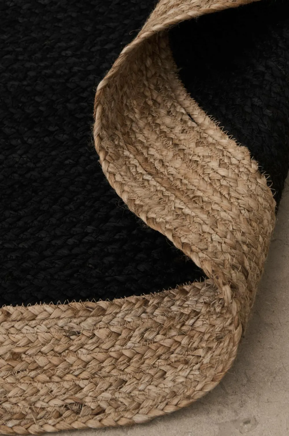Rundt, flettet tæppe af 100% jute. Tæppet findes i to størrelser, Ø 120 og 160 cm.