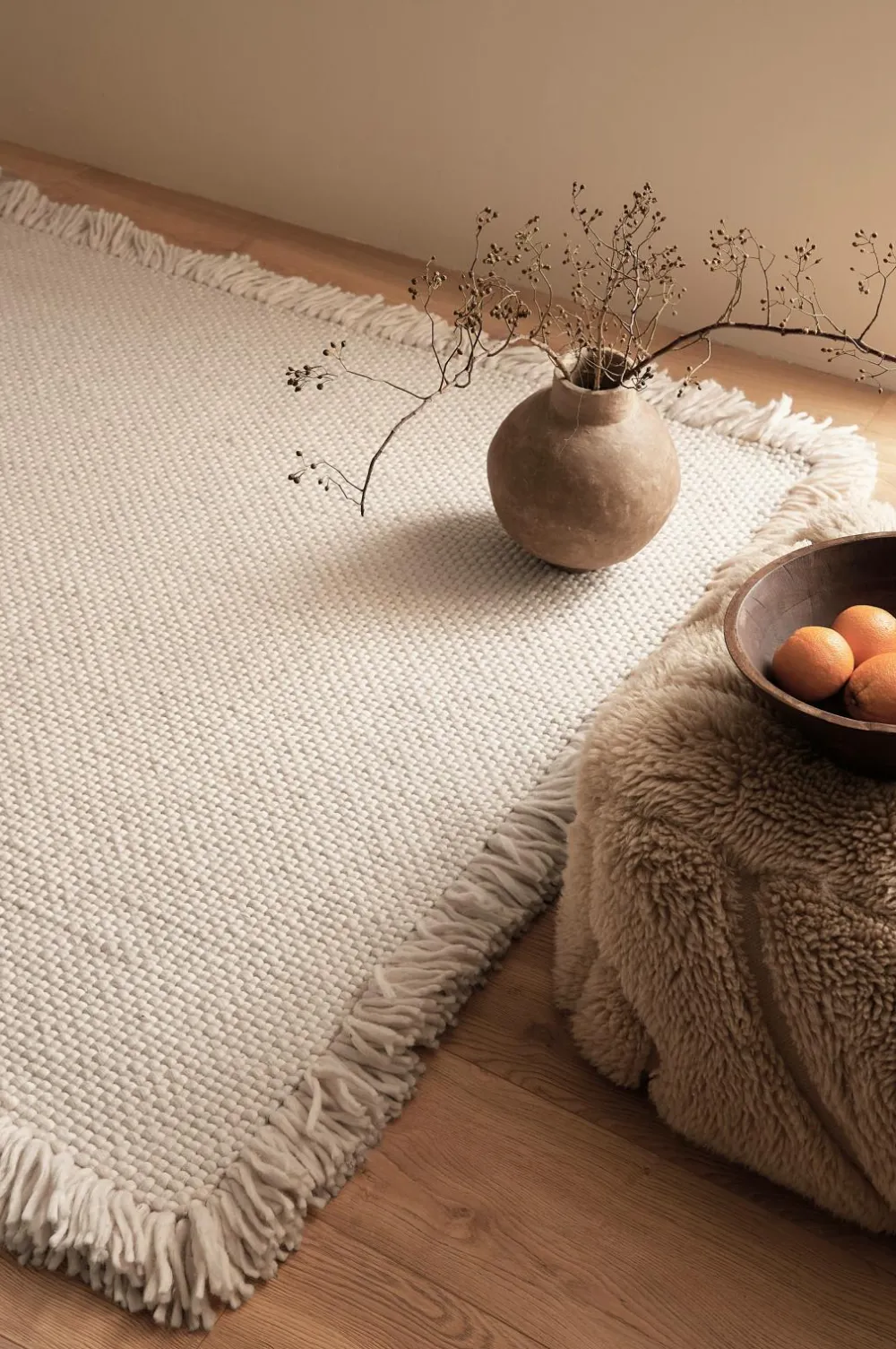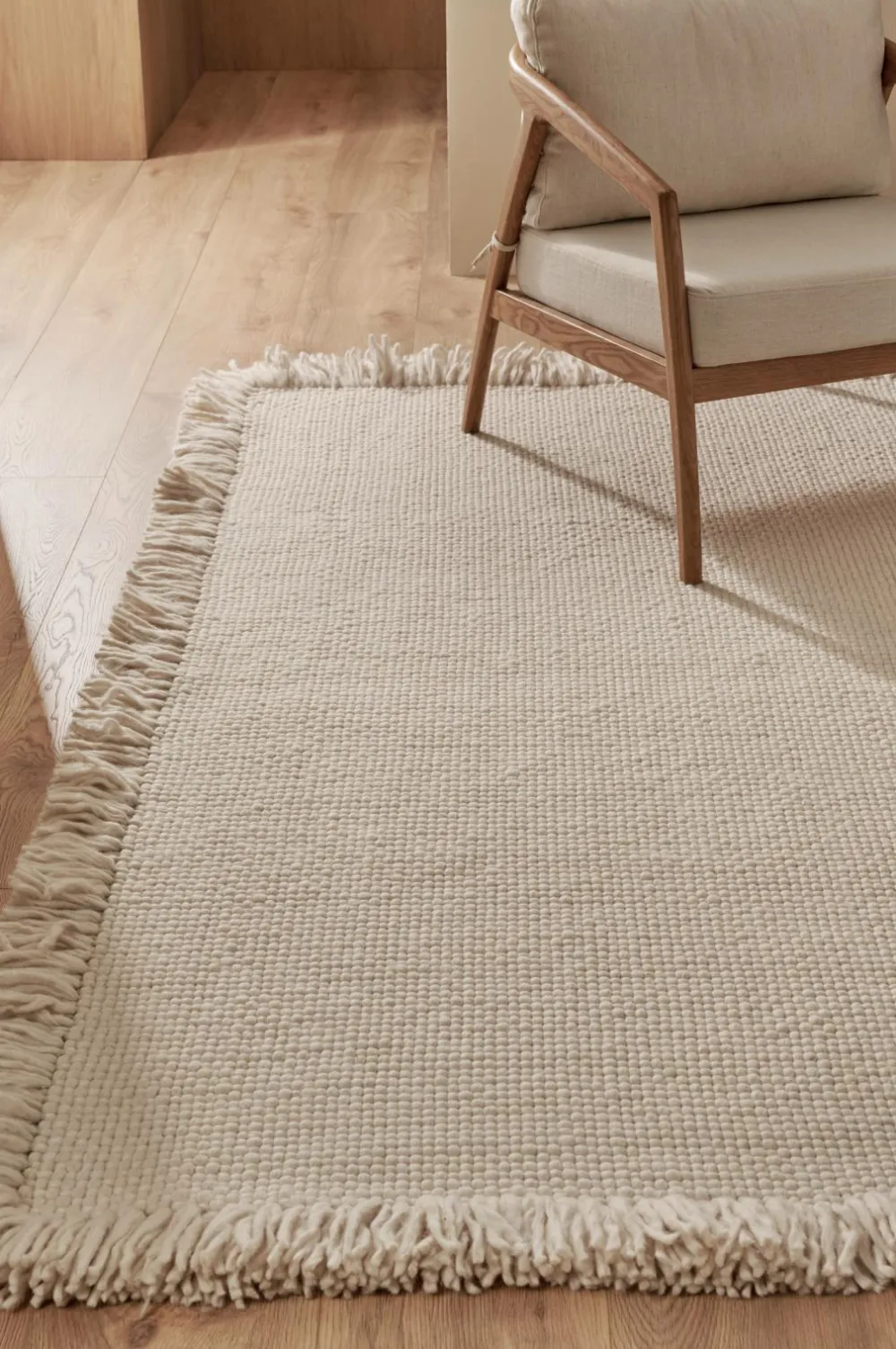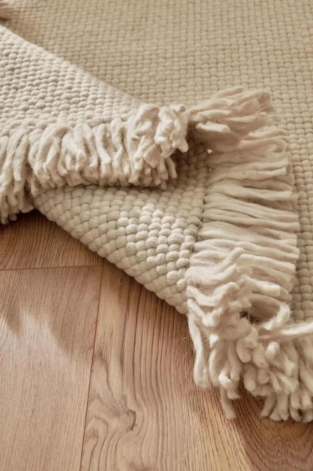 • Håndvævet uldgulvtæppe med klassisk, flettet mønster