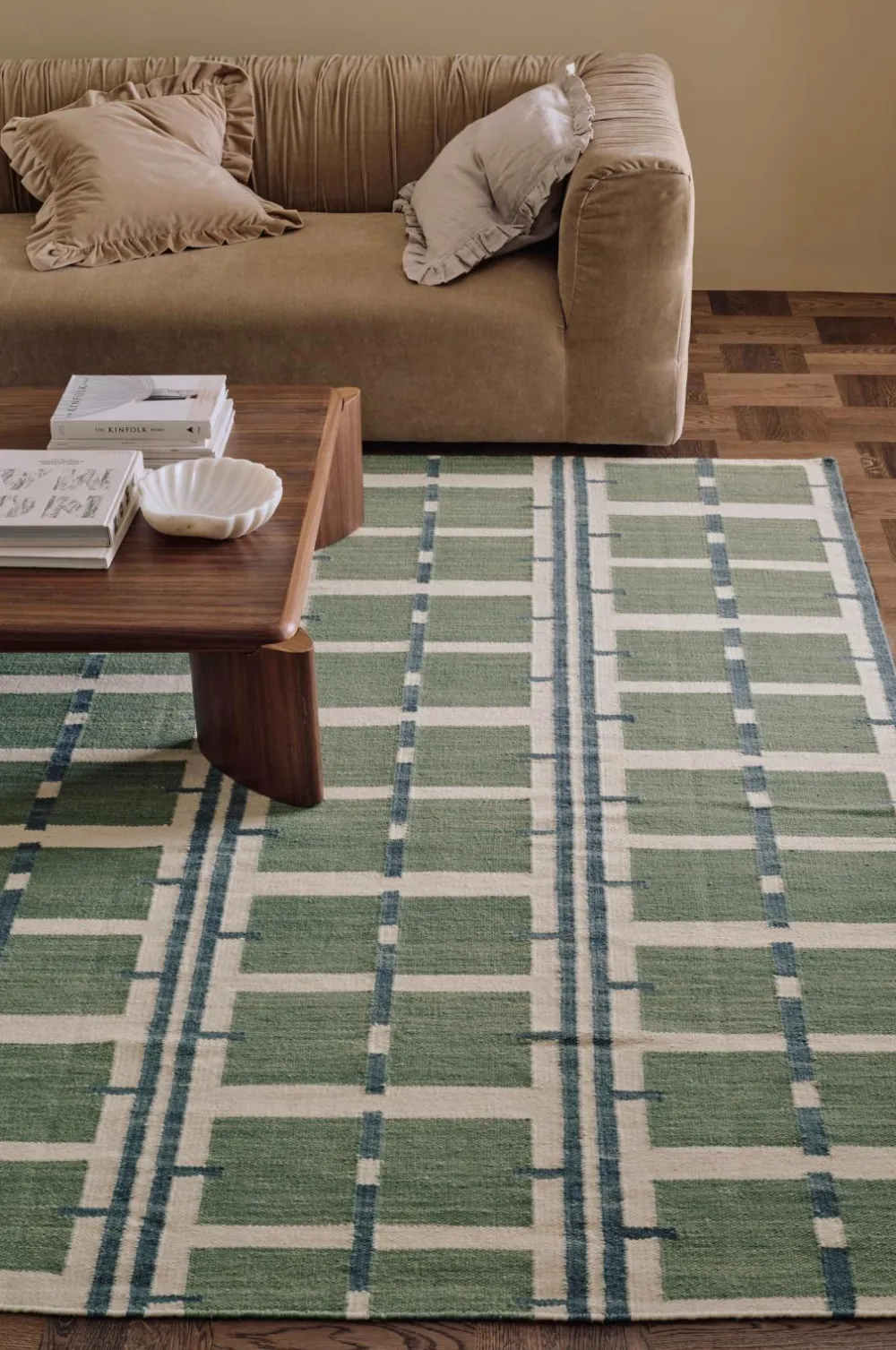 • Håndvævet, glat uldgulvtæppe