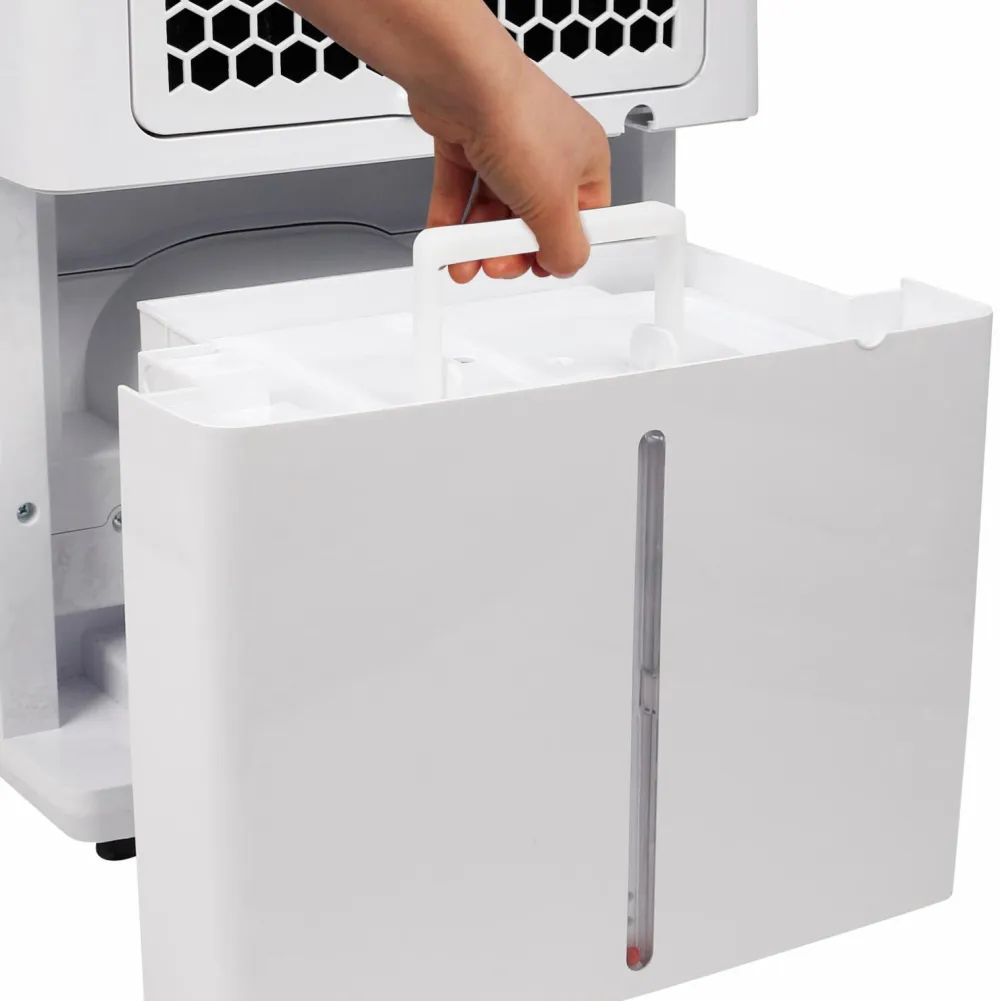 Model med en kapacitet på 25 l pr. dag og en vandtank på 5,5 l. Når vandtanken er fuld, stopper affugteren, og der lyder et signal. Det er muligt at tilslutte en slange til f.eks. et gulvafløb for kontinuerlig tømning.