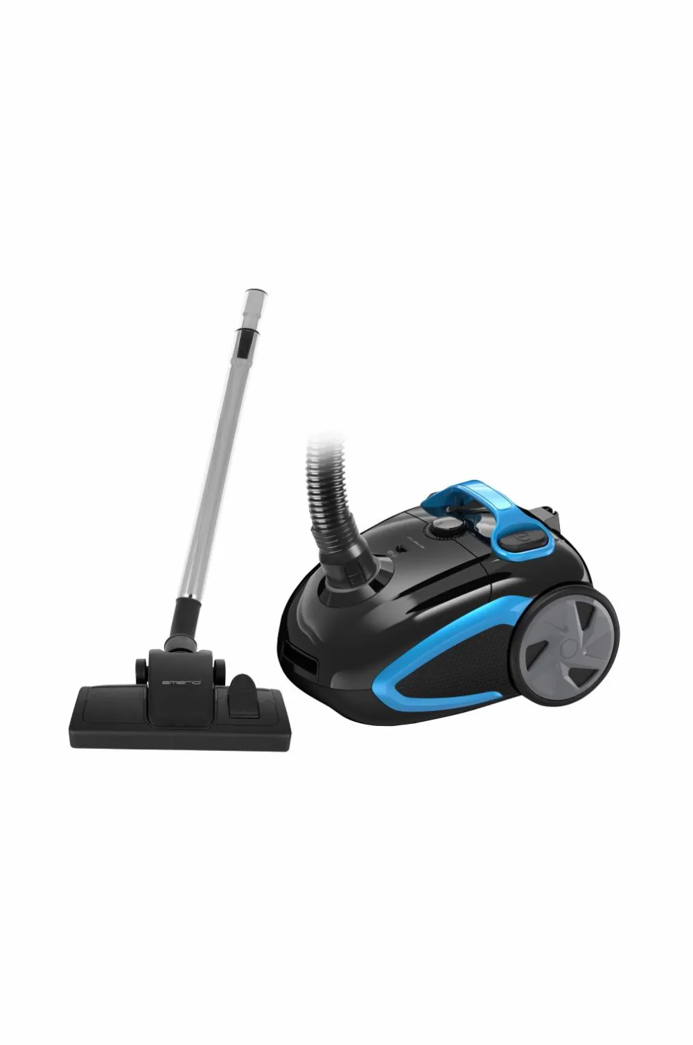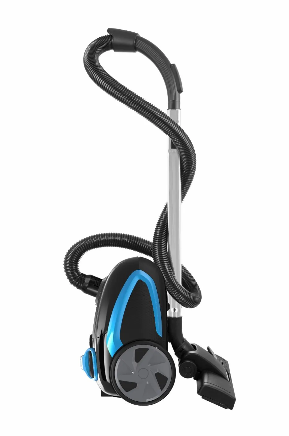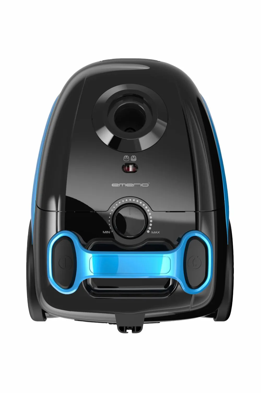 Støvsugeren er sort med detaljer i blåt og kompakt designet. Den har automatisk ledningsindtræk, justerbar sugeevne og en støvopsamlingskapacitet på hele 2,5 liter.