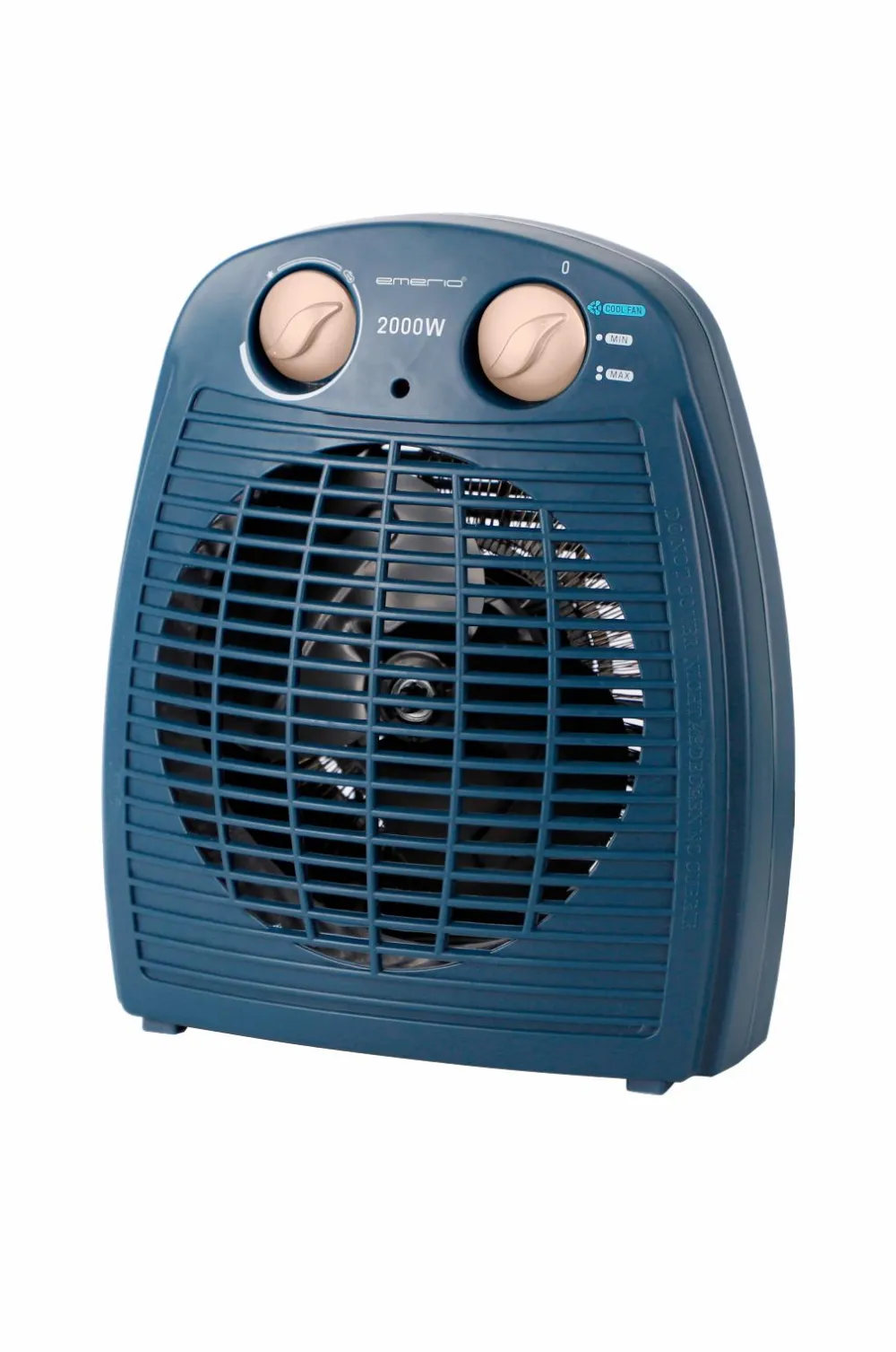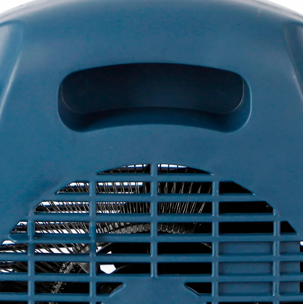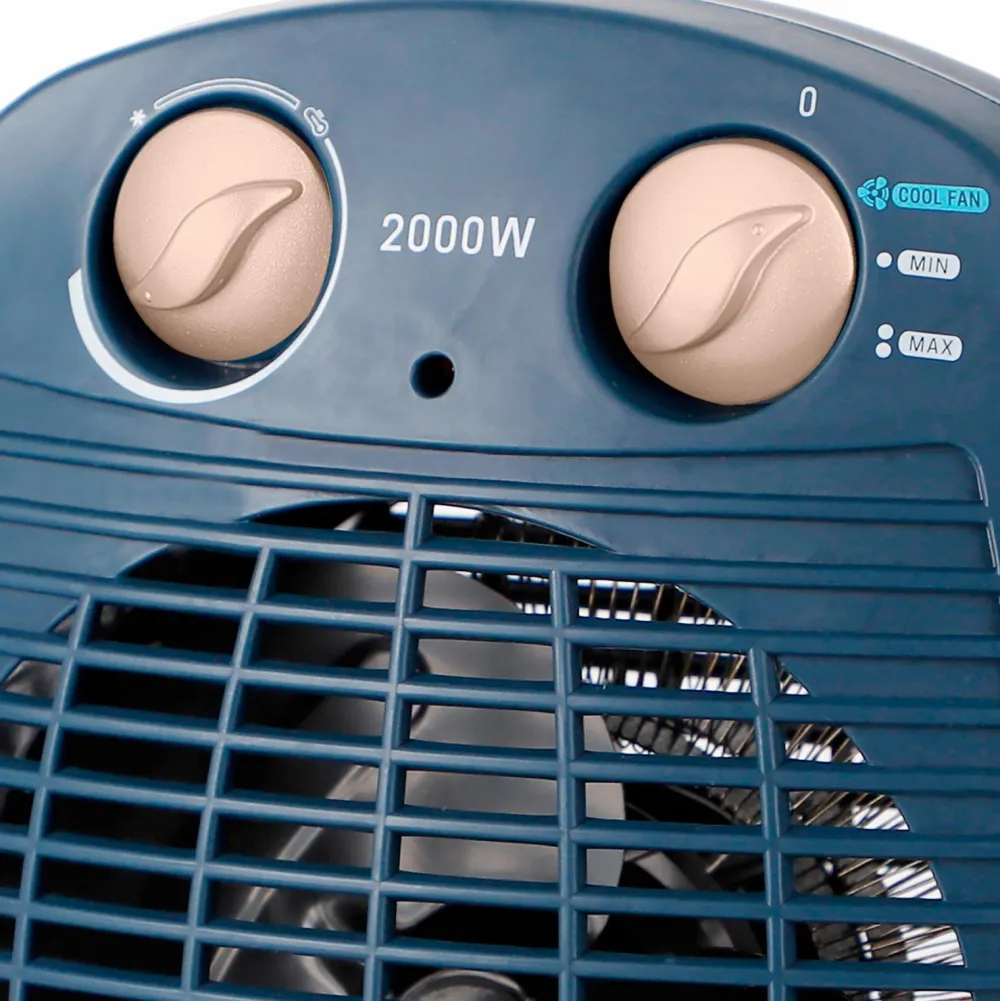 Designet er stilfuldt og moderne i blåt med sølvfarvede betjeningsknapper. Effekten på 2000 W opvarmer hurtigt både større og mindre rum. Indikatorlampen viser, at varmeblæseren kører, og tipbeskyttelsen slukker varmeblæseren, hvis den vælter.