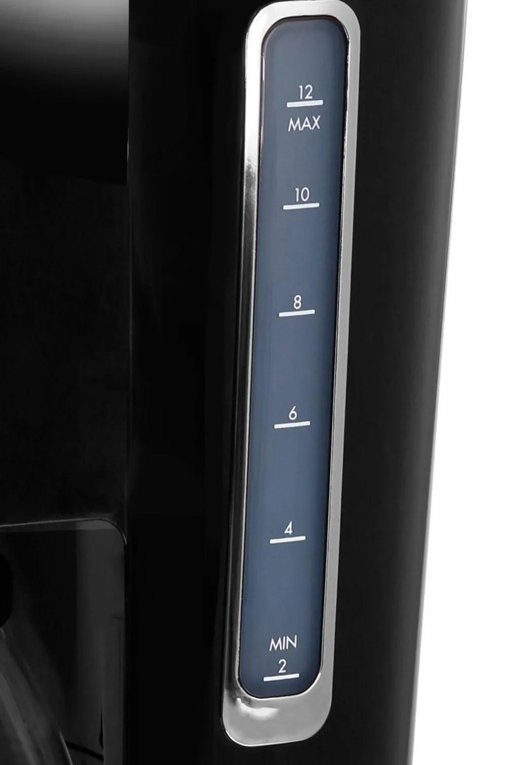 Designet er tidløst i sort og består af en gennemsigtig glaskande med detaljer i rustfrit stål og en vandtank med tydelige vandstandsangivelser. Bryggeren har flere detaljer i rustfrit stål, og låget og håndtaget er lavet af sort, varmebestandigt materiale. Kaffemaskinen har også et medfølgende genanvendeligt filter, drypbeskyttelse og automatisk slukning.