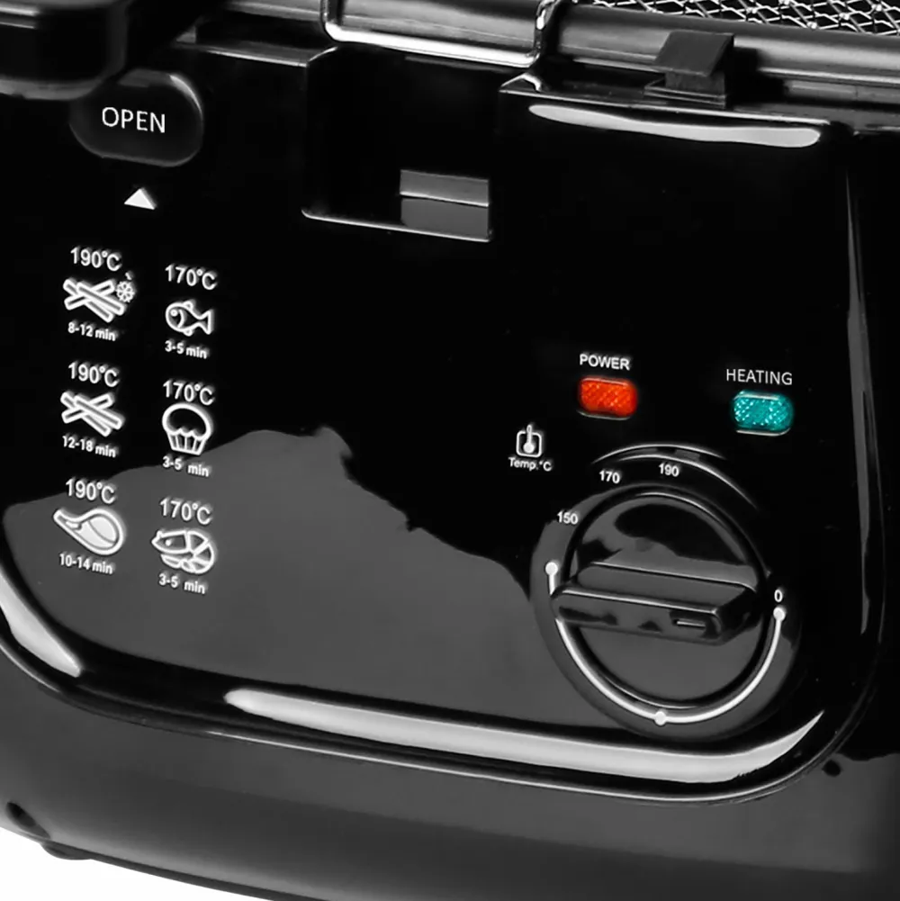 Frituregrydens design er stilfuldt og moderne i sort lak og har et køligt kabinet. Termostaten kan indstilles op til 190 °C, og en indikatorlampe viser, når frituregryden er tændt, og olien har nået den rette temperatur til at begynde at stege.