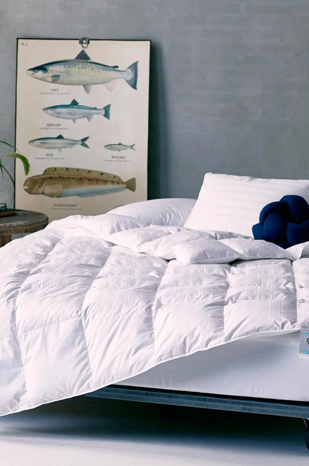 Cecilia er som en fjerlet brise ude på havet. Hun er behageligt sval en sommernat, men kan også varme en kølig efterårsaften. Den bløde dyne tilpasser sig efter din kropstemperatur og er fyldt med den fineste muskusdun. Cecilia findes som sval, medium og varm. Lige som vindene på havet. Denne dyne har vi fyldt lige tilpas for at passe til dig, som fryser nogle gange. 90% europæisk hvid muskusdun. Bæreevne 10. Syet i tern med mellemvægge. Blødt, tæt stof i fineste bomuldscambric/twill. Farve: Hvidstribet overside/Hvid underside. Paspolering og broderi i hvid. Str. 150×210 cm