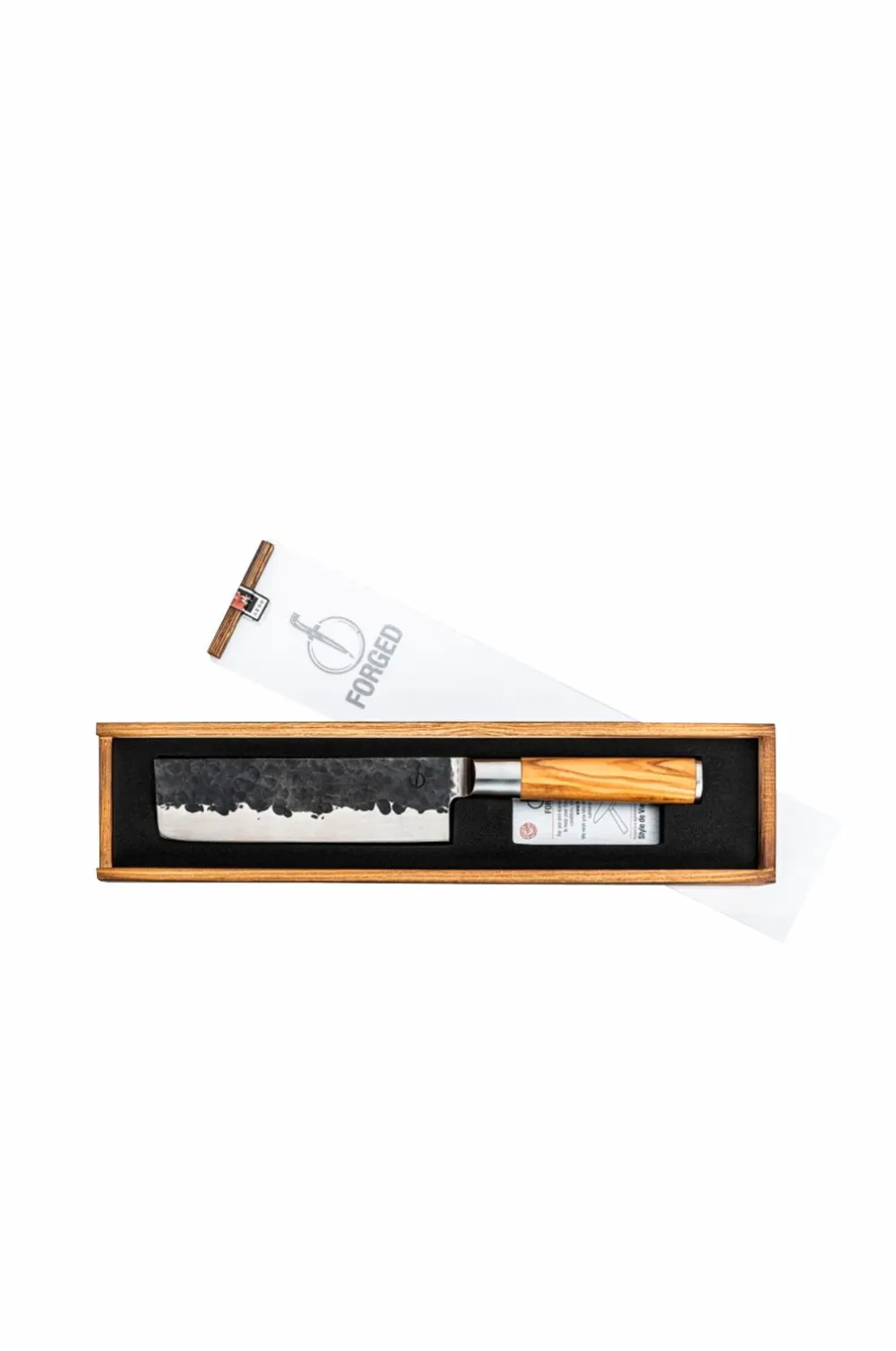Smedet olivenkniv, også kendt som nakiri eller japansk grøntsagskniv, er et must til at skære og hakke grøntsager og krydderurter. De smedede olivenknive er lavet af japansk 440c-stål med en hårdhed på 58 rockwell. Alle smedede knive er håndsmedede, har en bladtykkelse på 2 mm og en skærevinkel på 18 grader. Leveres i en luksuriøs æske. Vi giver 10 års garanti.