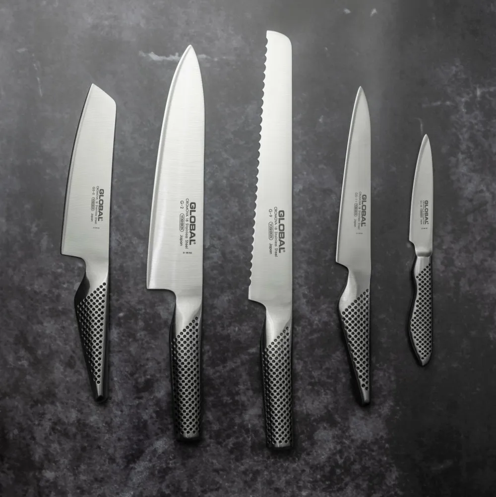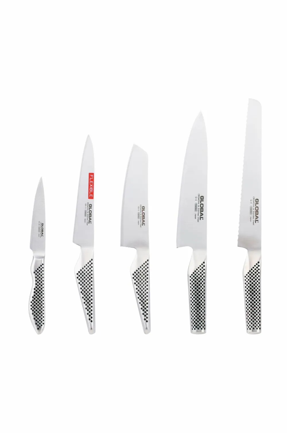 Et perfekt basissæt af køkkenknive. Sættet består af kokkekniven G-2, brødkniven G-9, grøntsagshakkeren GS-5, universalkniven GS-11 og skrællekniven GS-38. Med disse fem knive kan du klare de fleste opgaver i køkkenet, lige fra at skære brød og hakke grøntsager til at trimme kød og pille løg.