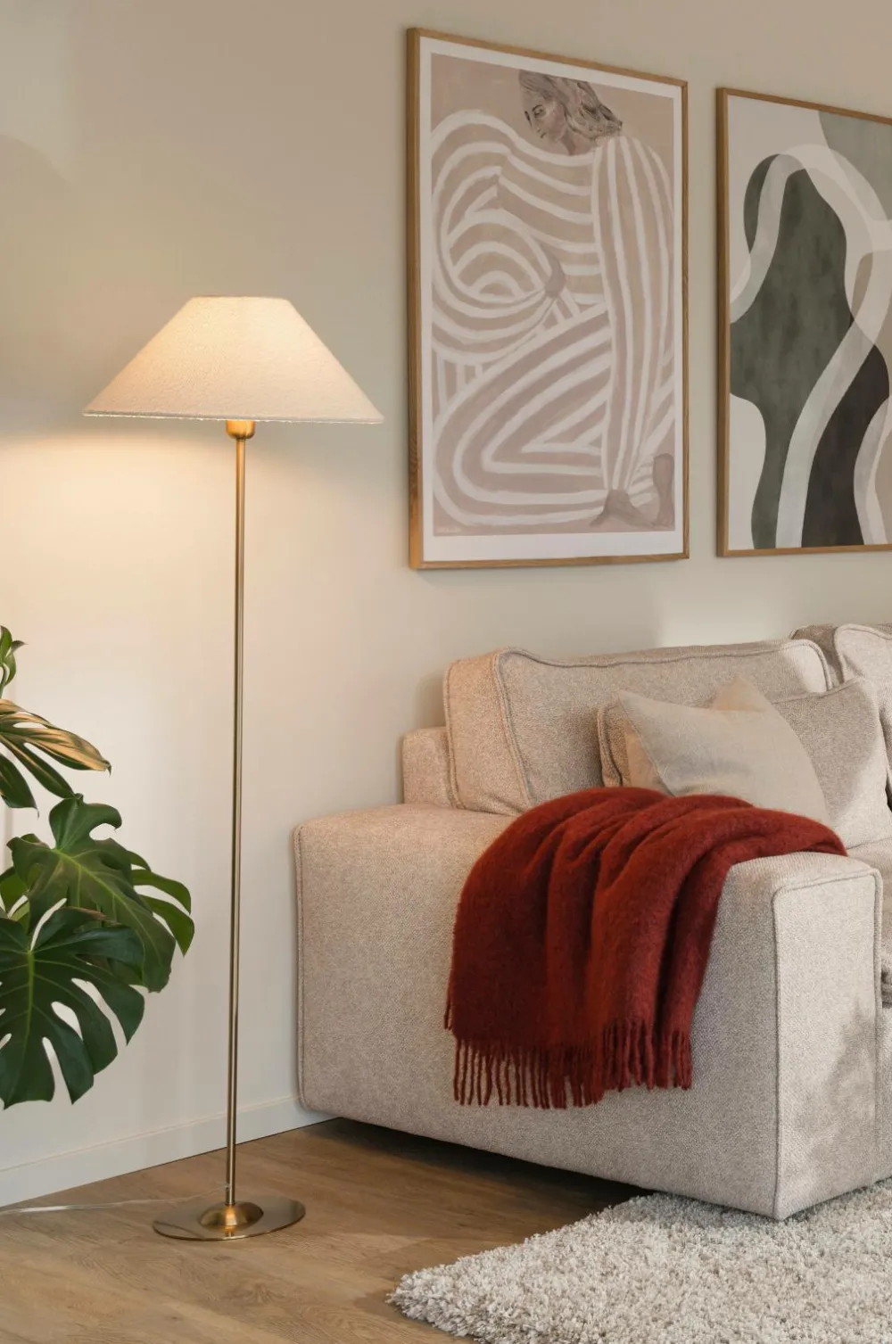 Iris’ smukke tekstilskærm er håndlavet af bouclé-stof. Skærmen har et topdæksel i matchende tekstil, og inden i skærmen er der en hvid blændingsskærm af plast. Skærmen har en e27-ringmontering, hvilket betyder, at lampeskærmen er fastgjort til en lampefod med en ring.
