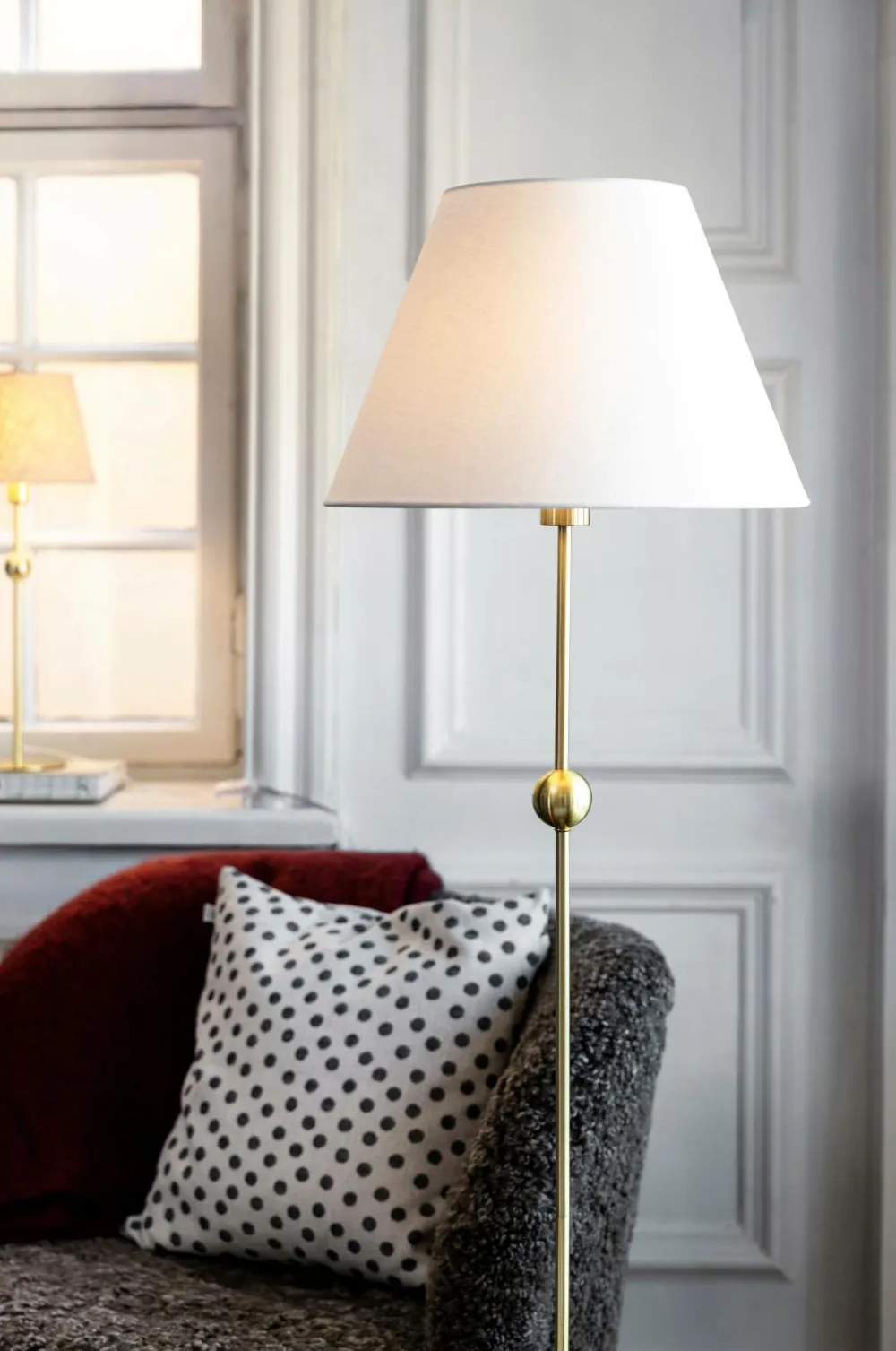 Sigrid er en håndlavet lampeskærm med stof bestående af en blanding af bomuld og hør. På indersiden af skærmen er et blændingsskjold lavet af plastik. Skærmen har en E27-bærering til fastgørelse på gevindfatning.