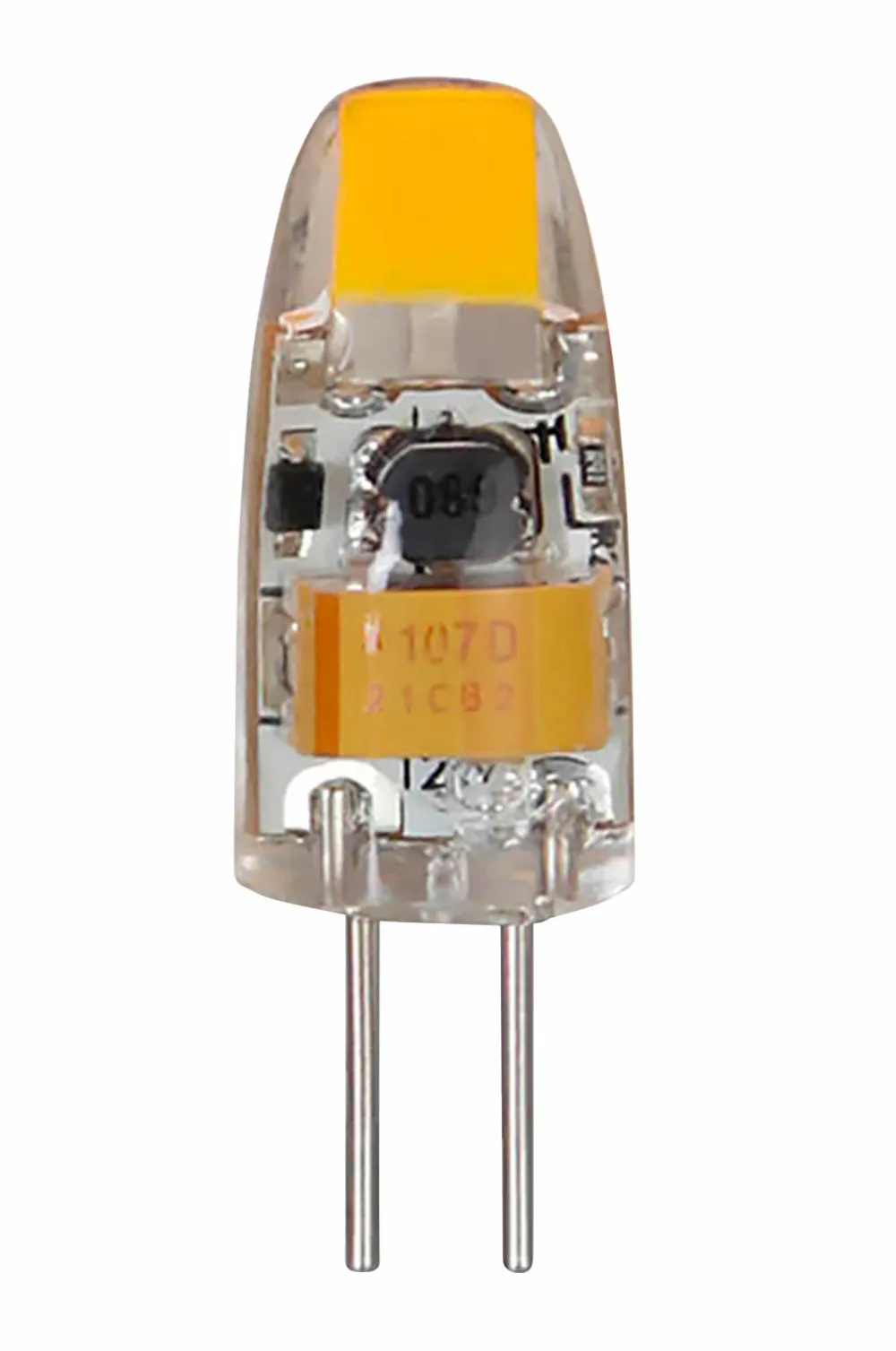 LED-pære G4 Klar. Kan dæmpes. Maks. 1,1 W (=15 W) (2800 K, 100 lm). Pæren giver et varmt hvidt lys og den er CE-mærket. Bredde 1 cm og højde 3 cm. Levetid 25.000 t. Materiale: Plast.