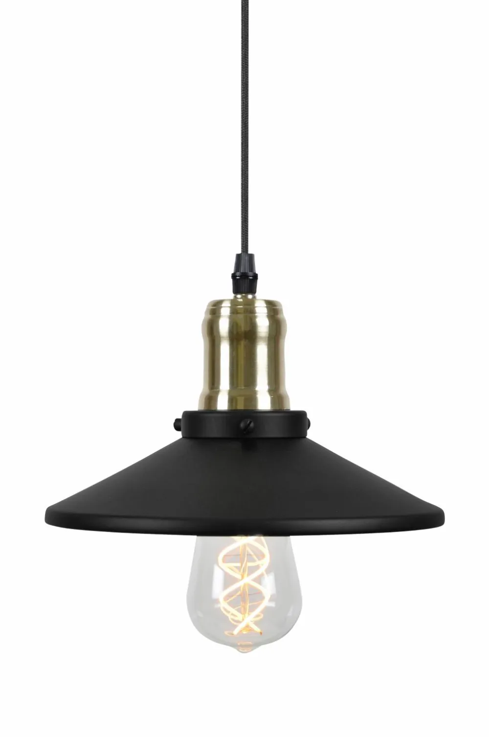 Lille smuk pendel, der er let at placere, med århundredeskiftefornemmelse i matsort metal med detaljer i børstet messing. Sort 3,5 m tekstilledning med afbryder og almindeligt stik.
