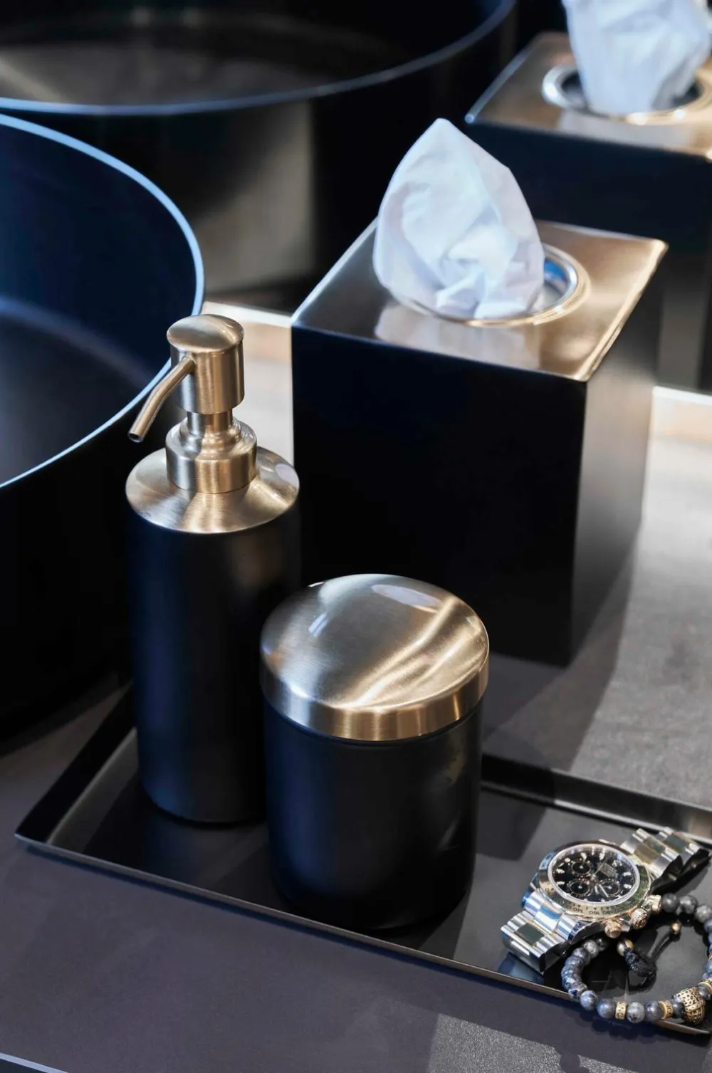 Gio er en utrolig stilren og elegant badeværelsesserie med præcis de ting, du gerne vil have på badeværelset. Den smukke kombination af mørke og gyldne toner giver tilbehøret et sofistikeret udtryk. Den udsøgte æske med låg er perfekt til opbevaring af badeværelsesartikler eller smykker. Skab en hotelagtig atmosfære på dit badeværelse med badeværelsesserien fra halvor bakke. Sort metalæske med låg i mat guld. 8×10,5 cm. Indgraveret halvor bakke-logo på undersiden. Pakket i en udsøgt halvor bakke-æske. Badeværelsesserien gio indeholder: sæbedispenser, tandbørsteglas, æske med låg, papirholder, bakke og vasketøjskurv.