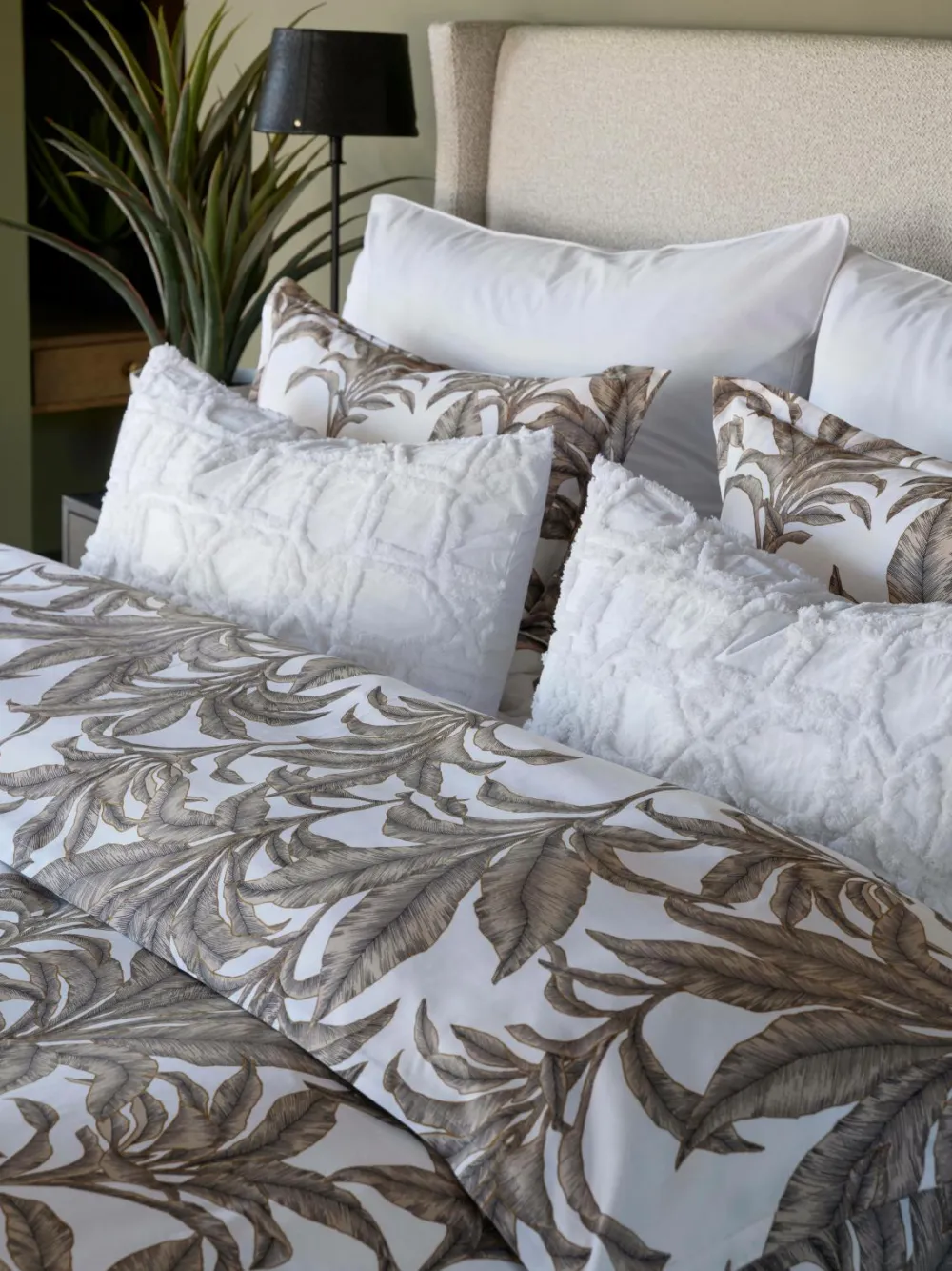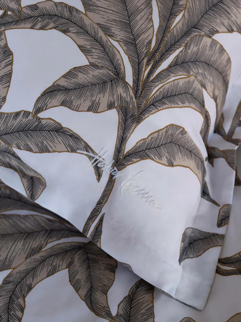 Babylonstoren er en historisk gård og vinproducent i Western Cape-provinsen, der er kendt for sin smukke og velholdte have og selvfølgelig sine lækre vine, der er fremstillet med omhu og dygtighed. Palmemønsteret i dette sengetøj fra Halvor Bakke giver associationer til varmere klimaer, og det grafiske løv giver en markant mønstret kontrast til den mørke baggrund. Kvaliteten er som altid en eksklusiv og smuk satin, der forstærker dybden i designet og gør det helt fantastisk. – 100% bomuldssatin Tc 400. – Øko-Tex-certificeret. – 3 cm Oxford-ramme på pudebetræk og 2 cm Oxford-ramme på dynebetræk. – Lynlås i bunden af dynebetræk og pudebetræk. – Pakket i en smuk gaveæske. – Sengesættet består af 1 dynebetræk og 1 pudebetræk i størrelse 60×63.