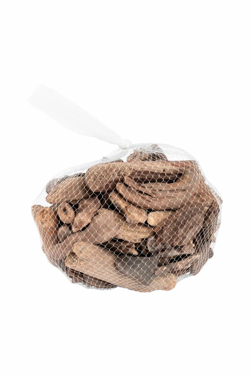 Dekorer med små stykker mangotræ i lanterner, bakker eller på bordet for at skabe en naturlig og hyggelig atmosfære. Netpose med løse mangotræstykker til dekoration. Naturlig farve og størrelse er b17xl17 cm