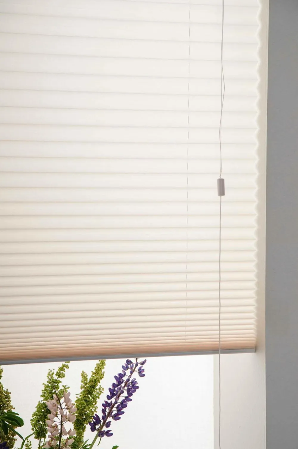 Frithængende plisségardin. Til lodrette vinduer. Reguleres med træksnor med bremse. Let at montere med drejebeslag på væg eller i loft. Beslag medfølger. Længde 160 cm.