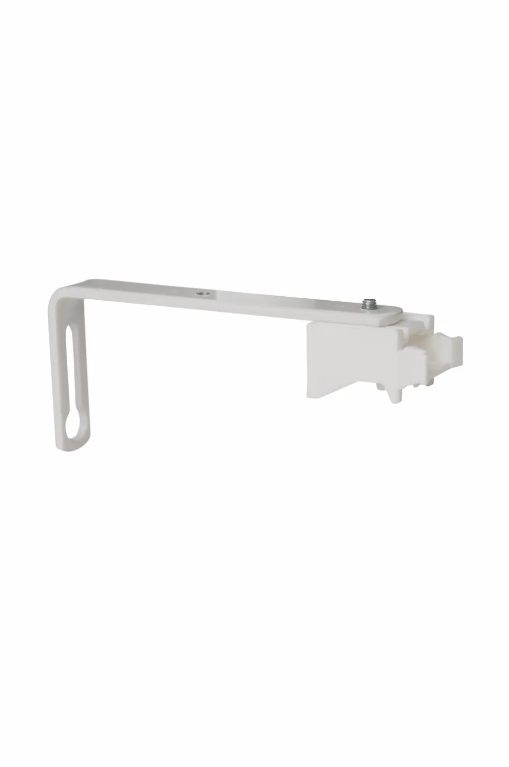 Enkel klikmontering på vinkelbeslag for at montere gardinskinnen Alex på væg eller i loft. Vinklen gør, at beslaget kommer et stykke ud fra væggen, så gardinet kan hænge flot, selvom du har en vindueskarm, der rager lidt ud. 12 cm. Sælges i 1-pak.