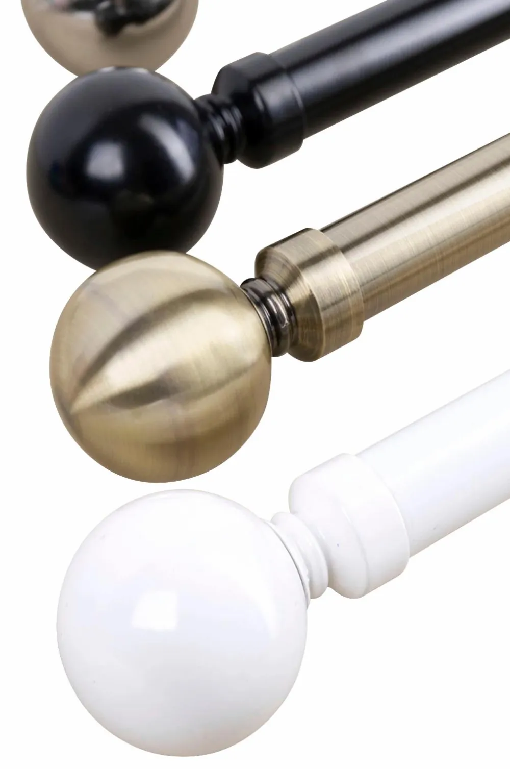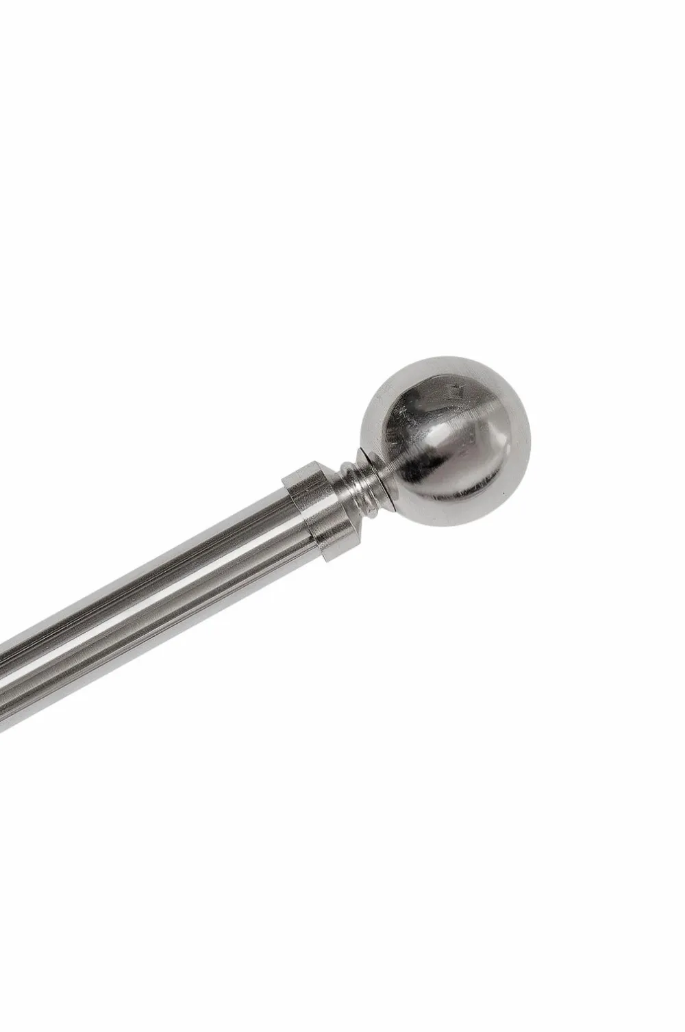 Komplet gardinstang i metal (25/28 mm) med kugleformede finials. Sættet indeholder justerbare stænger (110-200 cm), 2 finials og 3 justerbare vægbeslag (7-9 cm).