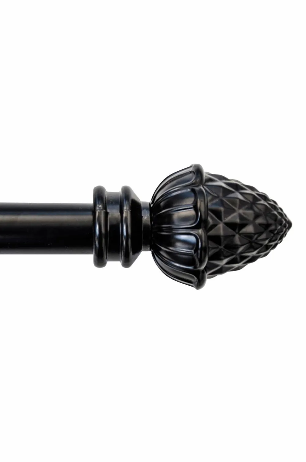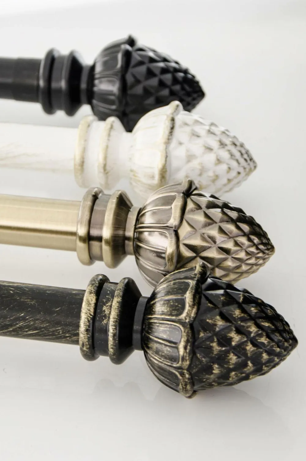 Komplet klassisk gardinstang i metal, 25/28 mm. Sættet indeholder justerbare stænger 130-240 cm, 2 endeknopper og 3 justerbare vægbeslag (9-14 cm). Knoppens længde 9 cm.