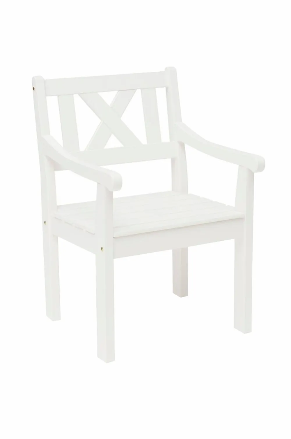 En klassisk lænestol i hvidlakeret, mærket fyrretræ.