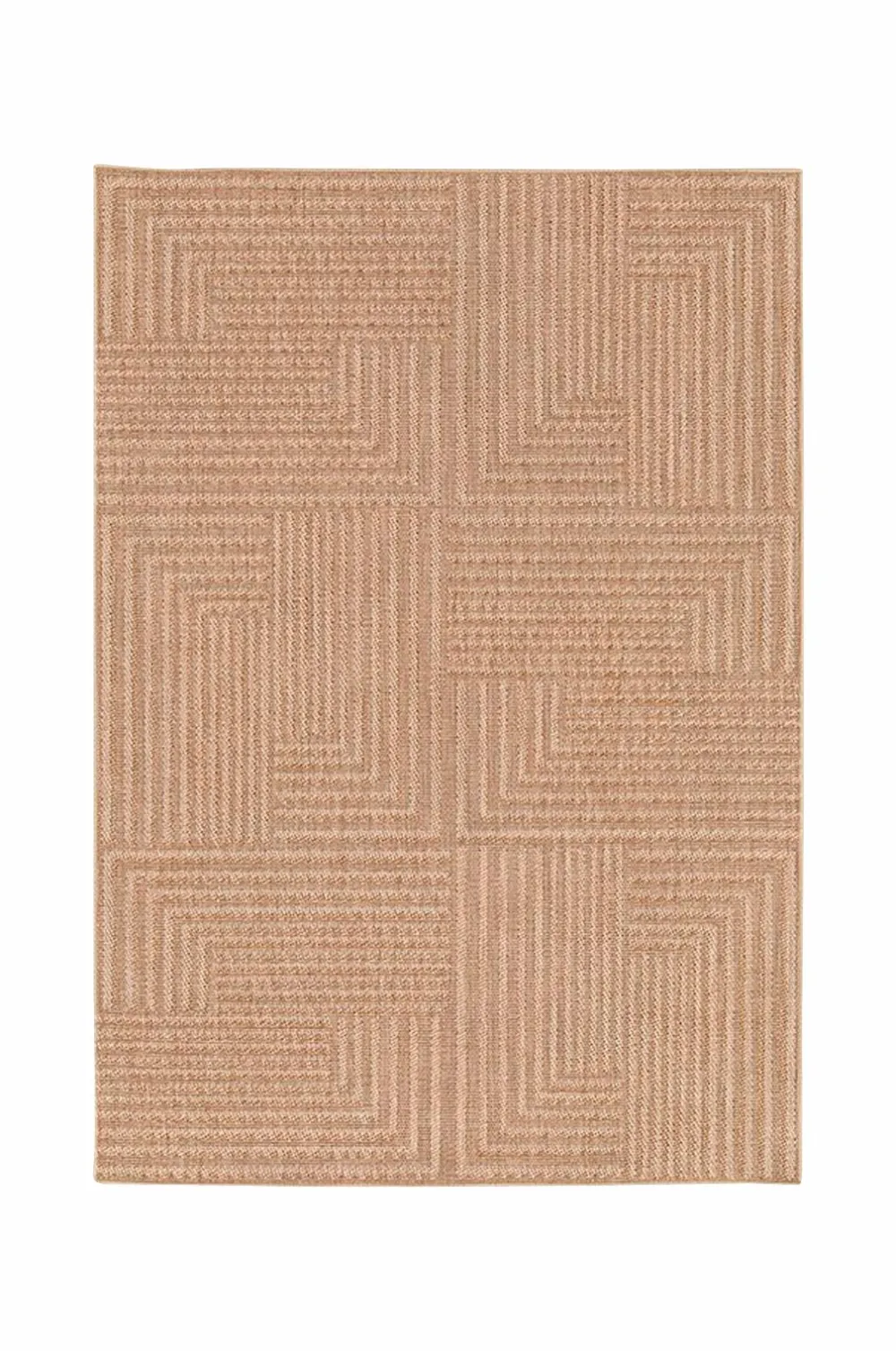 Den tykke flade vævning giver tæppet et tidløst sisal-look med naturlige farver, hvilket gør det perfekt til både udendørs og indendørs miljøer.