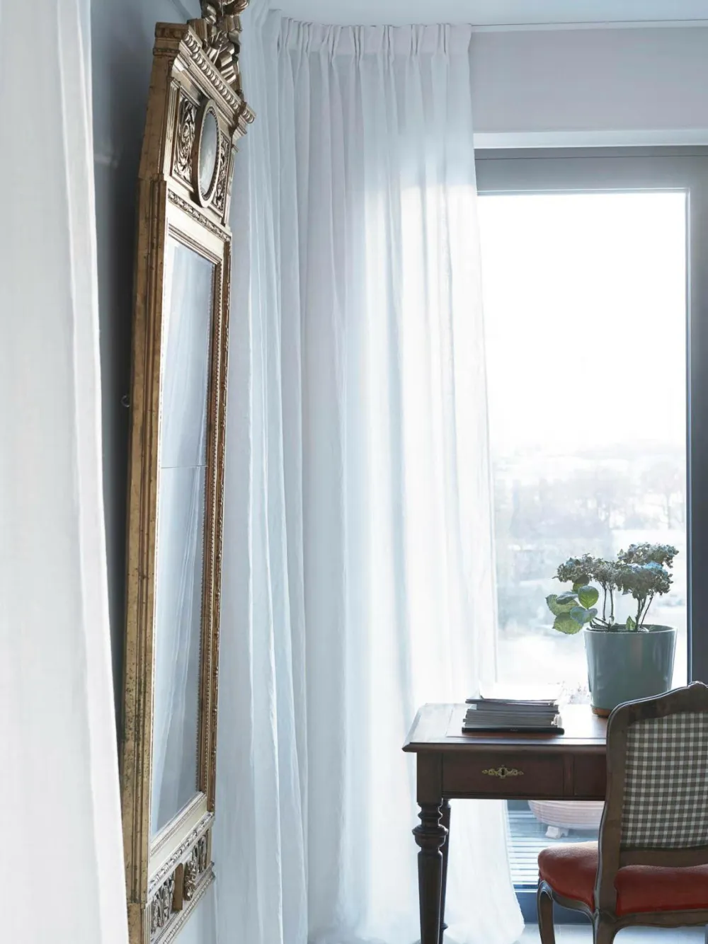 Sunshine i fint vævet, attraktivt rent linned er blødt behandlet for en behagelig følelse. Giver et afslappet indtryk og er let at pleje. Sunshine behøver ikke at blive strøget – behold rynkerne for en livlig fornemmelse. Gardin med overskriftsbånd og kanal. Skånsom vask 40°C, krympning 2-4%.