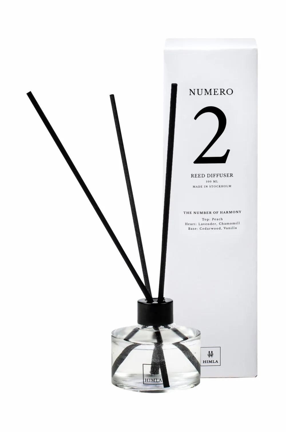 Himlas duftserie numero er en duftserie, der er inspireret af grafisk design og dufte, der vækker minder. Numero i reed diffusers findes i tre karakteristiske dufte. Sivsprederne består af en lille flaske i gennemsigtigt glas med duftolie og sorte pinde, der hjælper med at sprede duften i rummet. Numero sivspredere indeholder kun naturlige ingredienser; en base af en vegetabilsk olieblanding og duftolie. Brug færre pinde i flasken til et lille rum, eller når du vil have en svagere duft. Duftolien holder i 3-6 måneder. Himla’s numero 2 – the number of harmony – med topnoter af sød fersken, bløde mellemnoter af lavendel og kamille og en varm base af cedertræ og vanilje skabes en perfekt balance af ro og harmoni. 0.