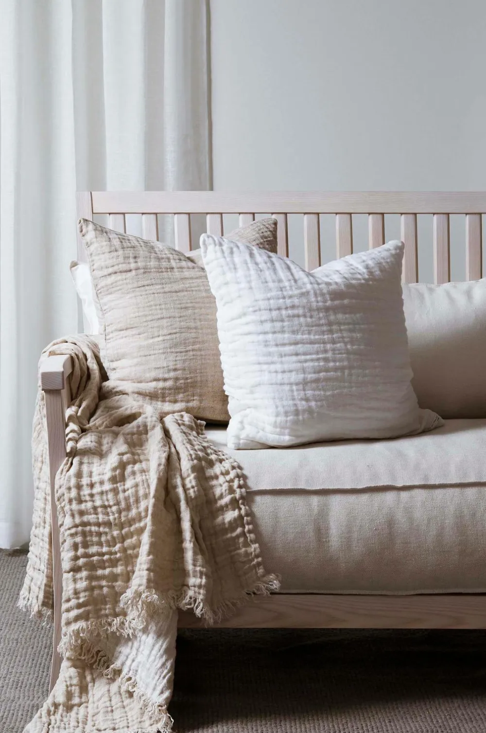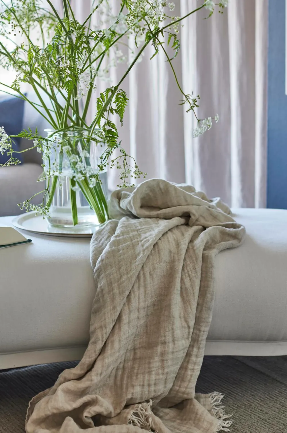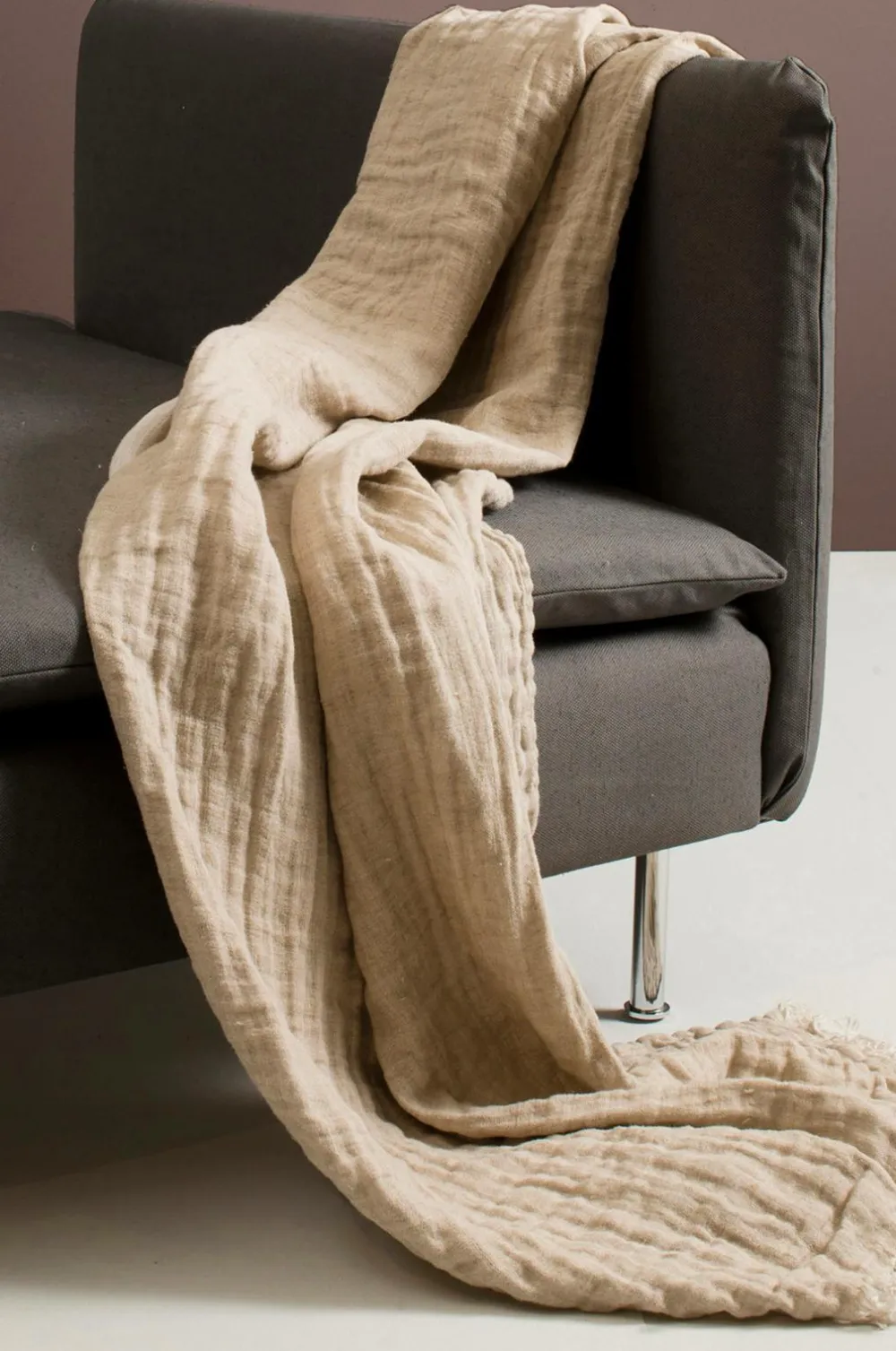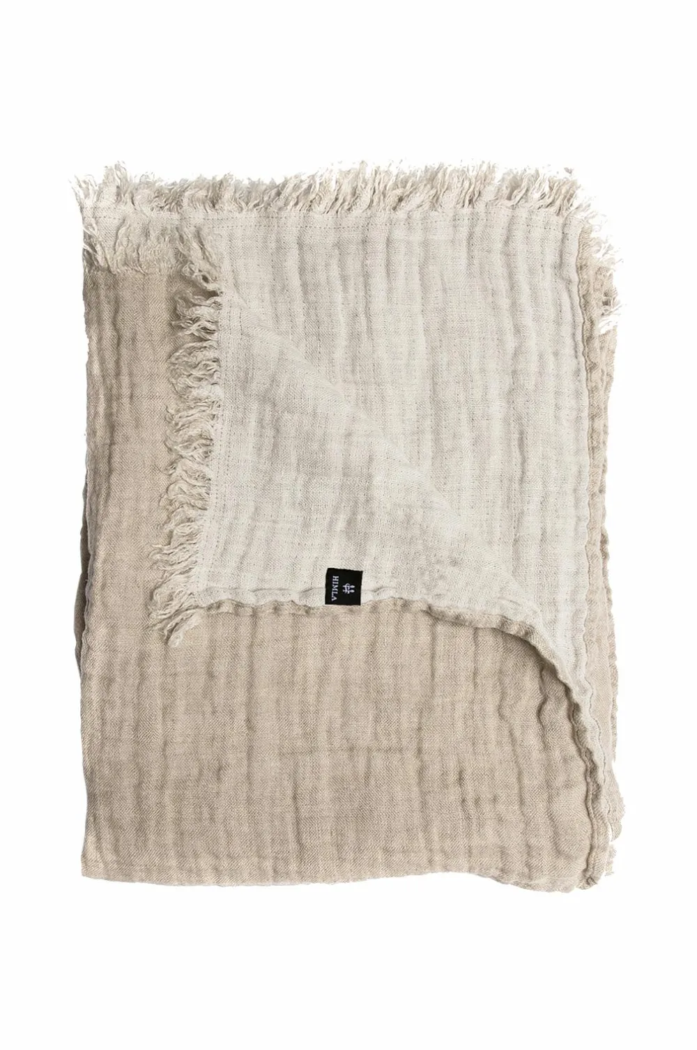 Hannelin er et tæppe i dobbeltvævet hør, der er vasket for at få et krøllet look. Plaiden er kantet langs de lange sider og har frynser på de korte sider. Maskinvask 40°C skåneprogram, tørretumbling ved lav varme, vaskes separat. Kan krympe 1-2%.