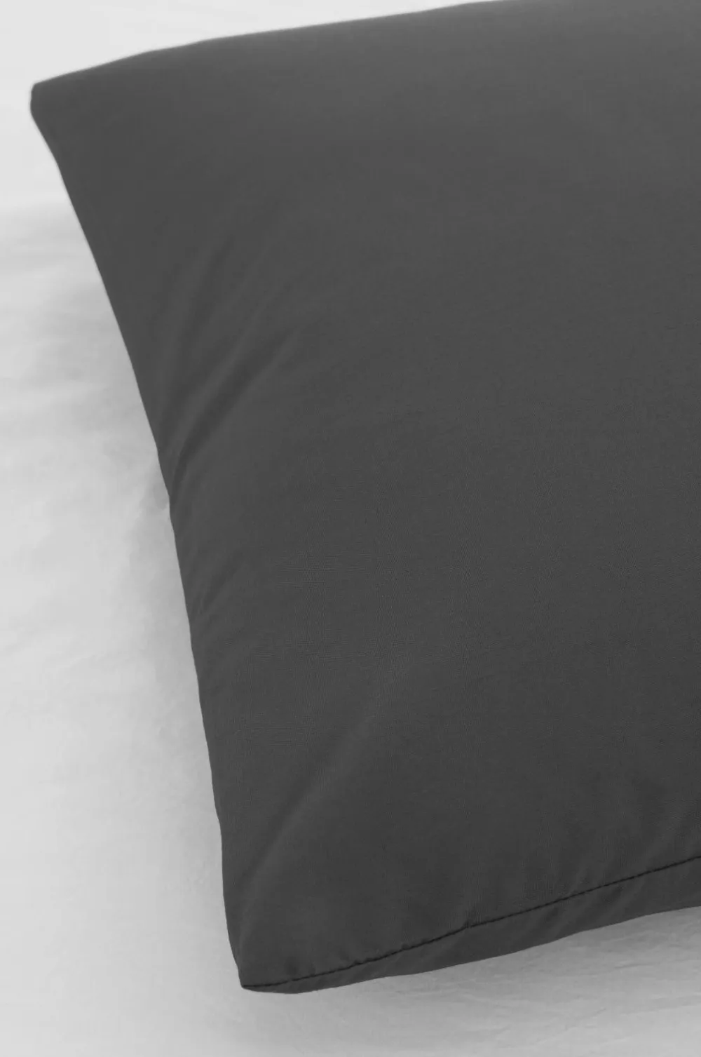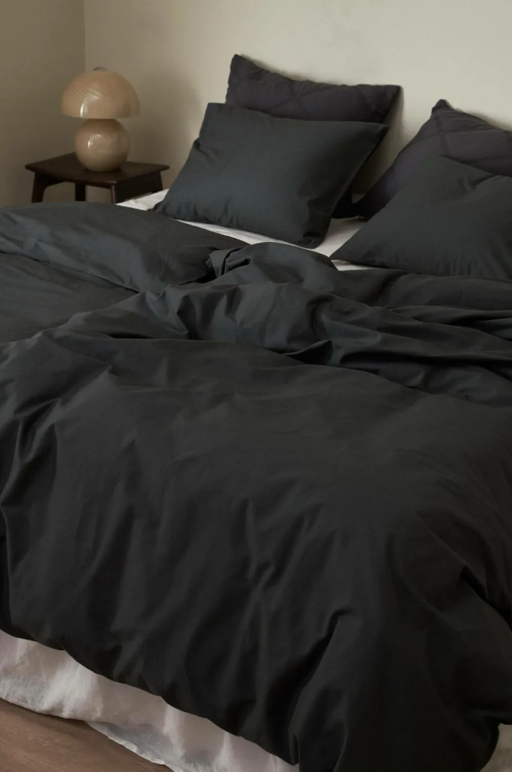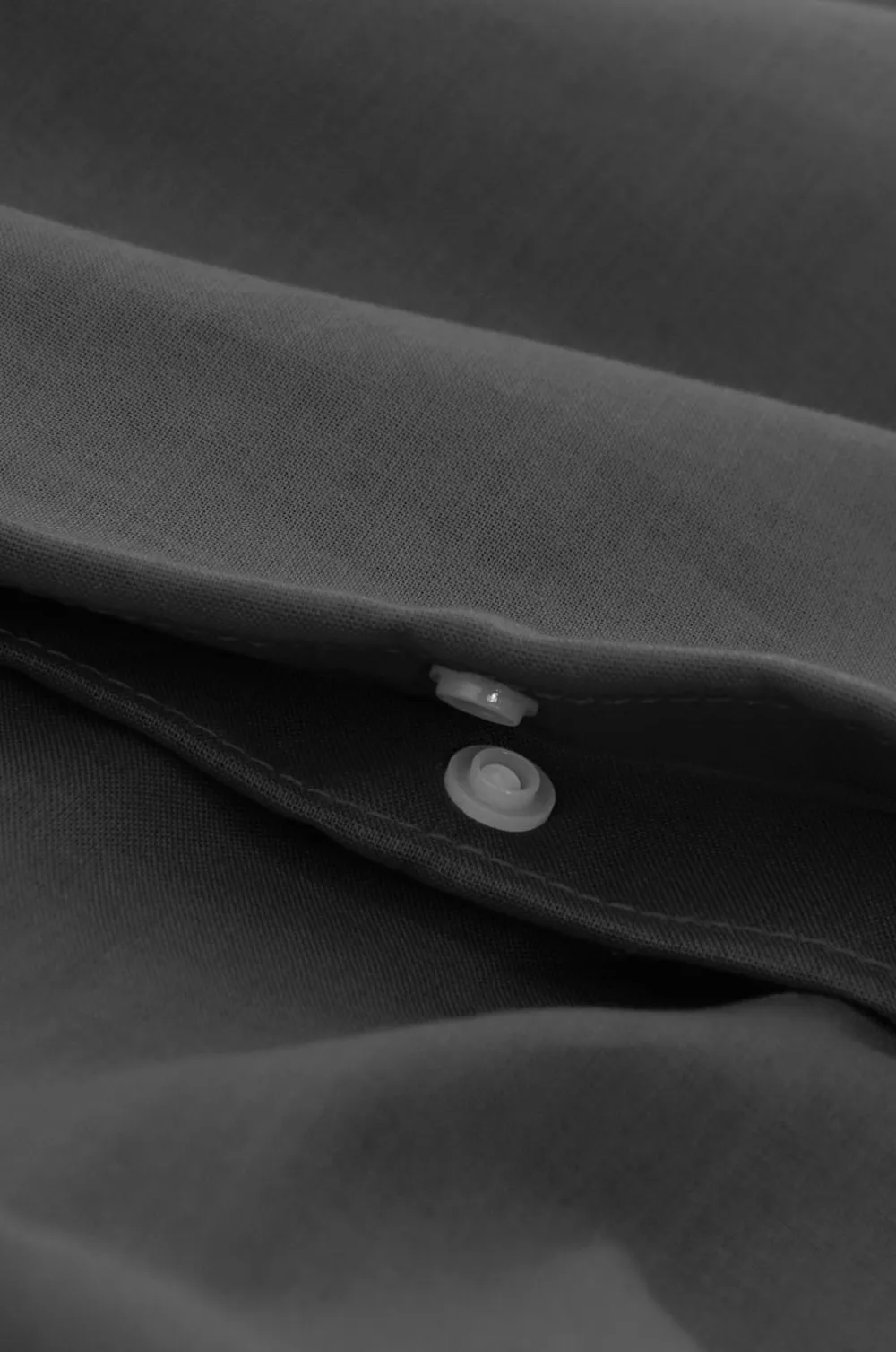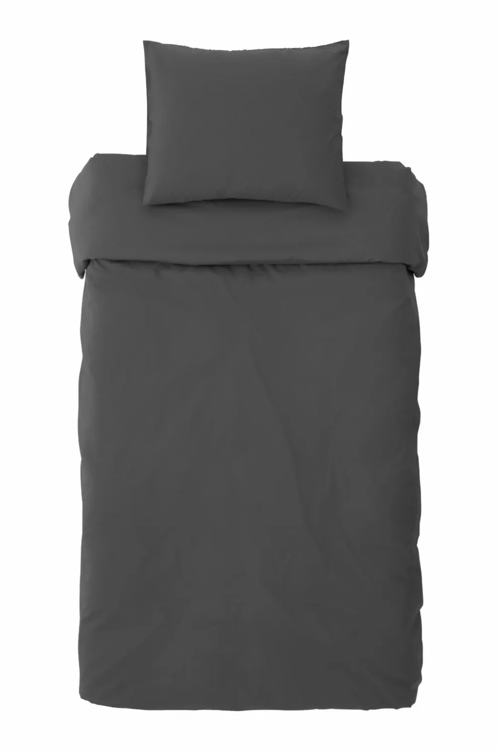 Ensfarvet sengesæt i blød, vasket bomuld. Trådtæthed 144 TC. Dynebetræk med huller i siden til brug ved opredning.