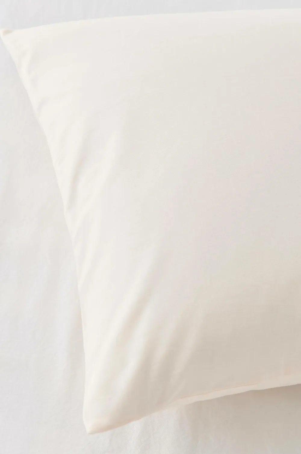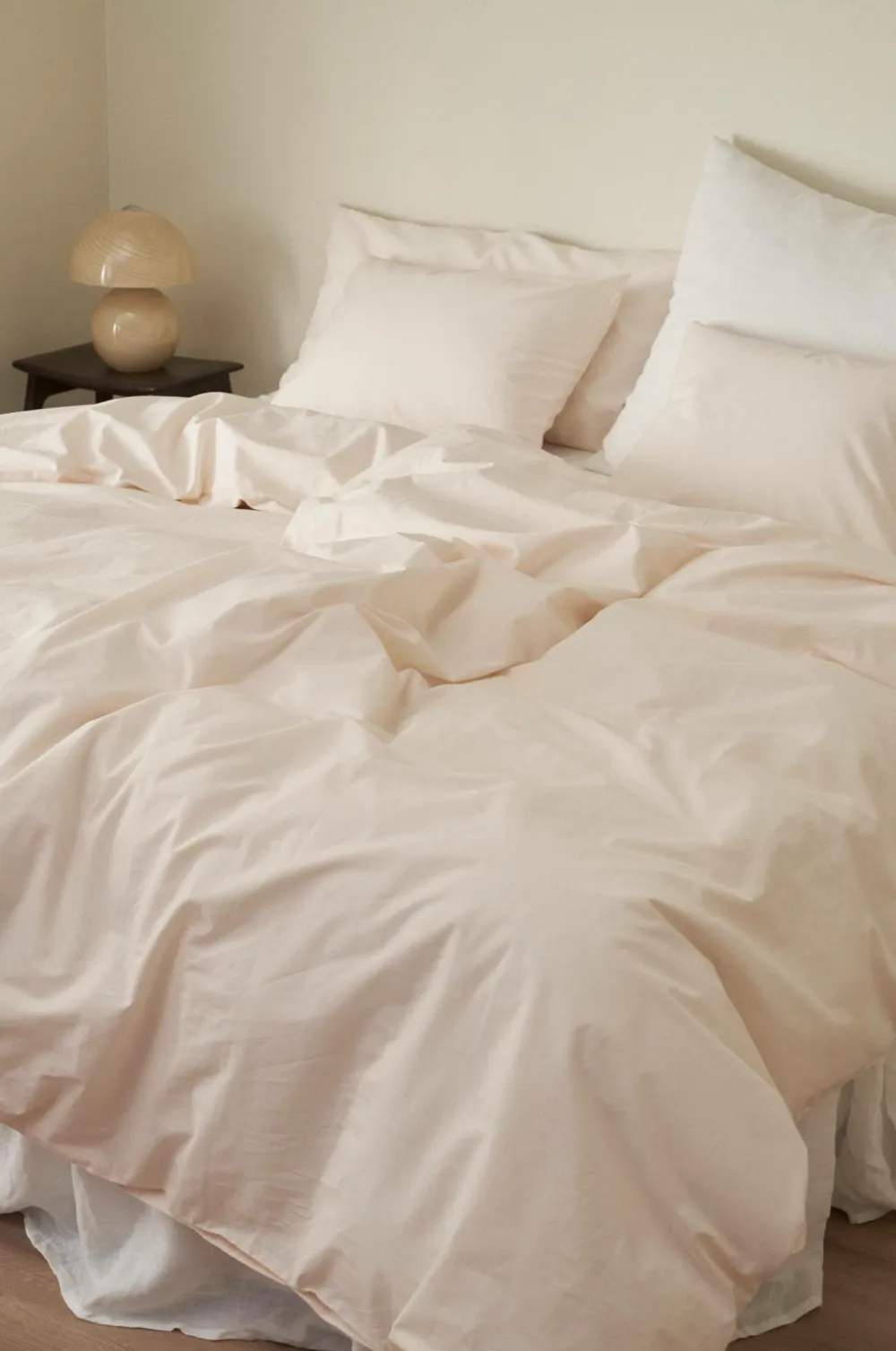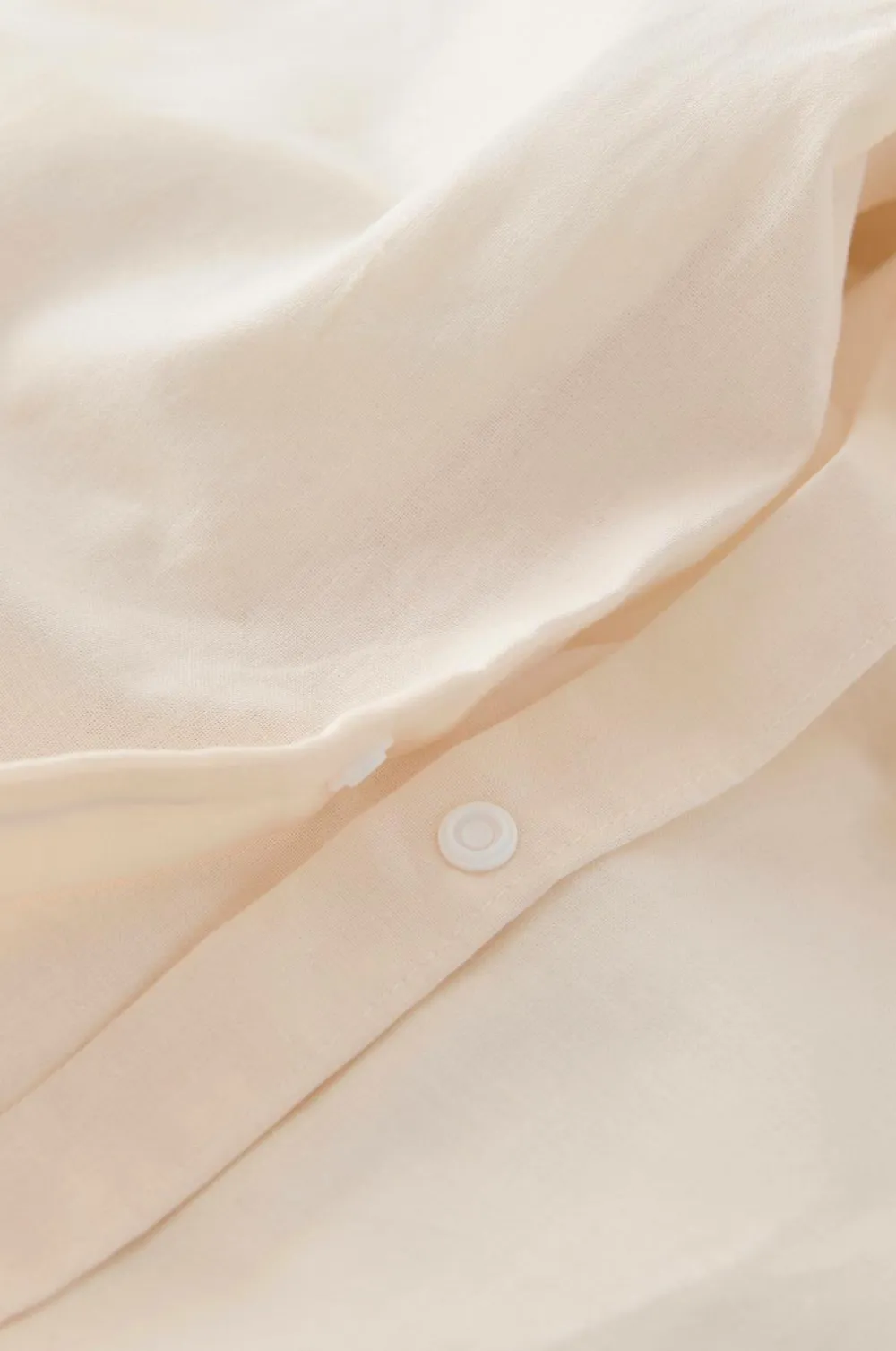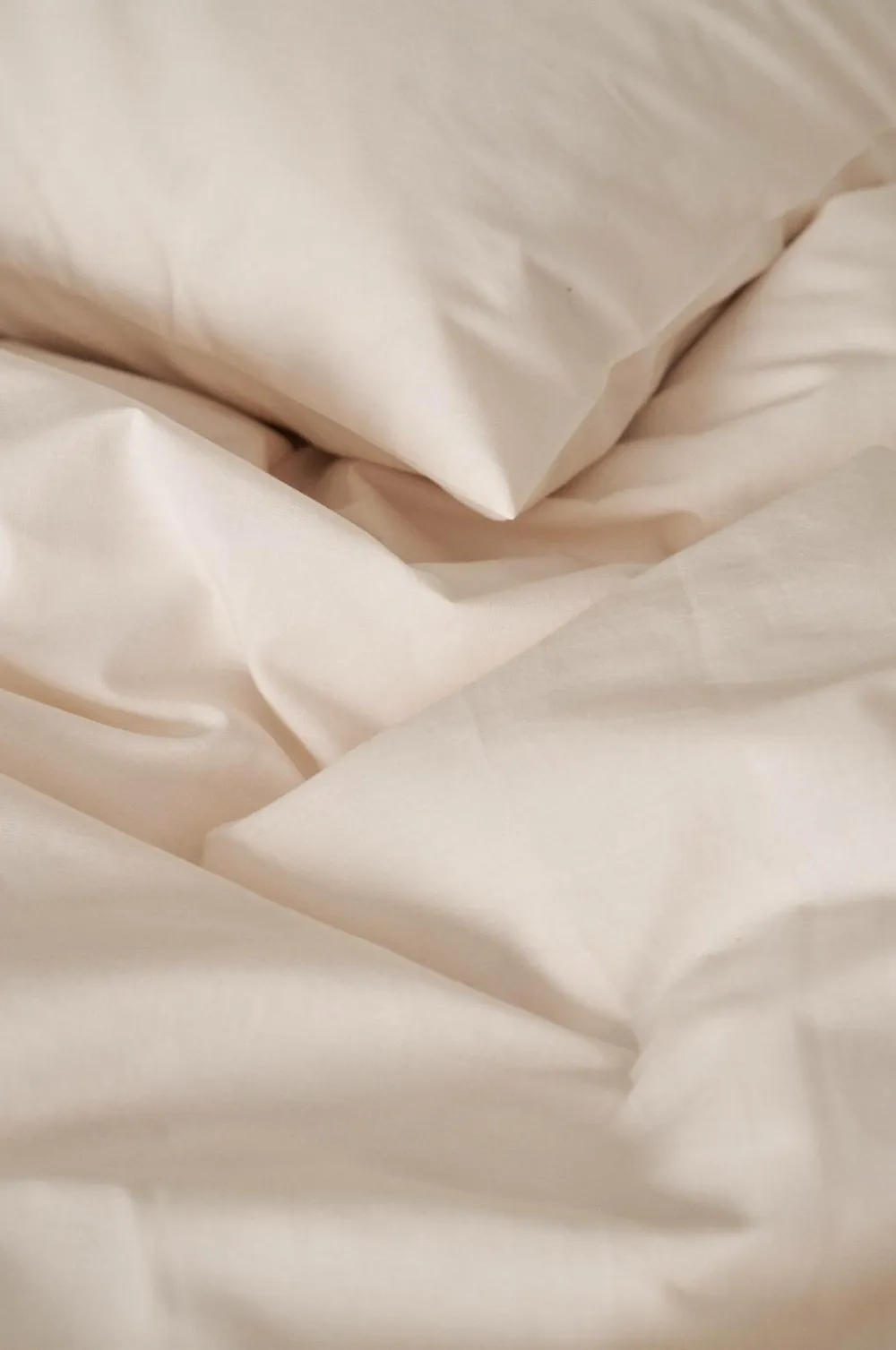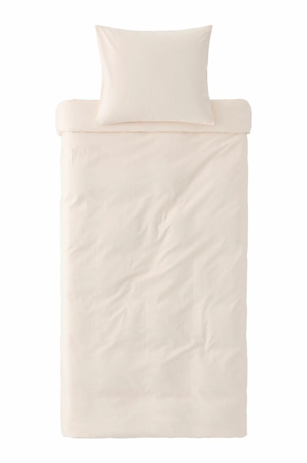 Ensfarvet sengesæt i blød, vasket bomuld. Trådtæthed 144 TC. Dynebetræk med huller i siden til brug ved opredning.