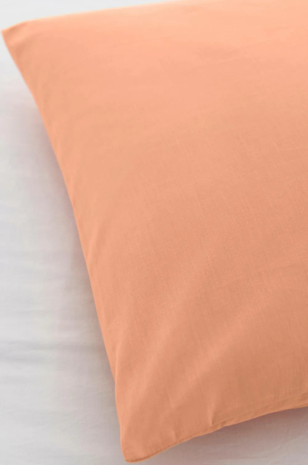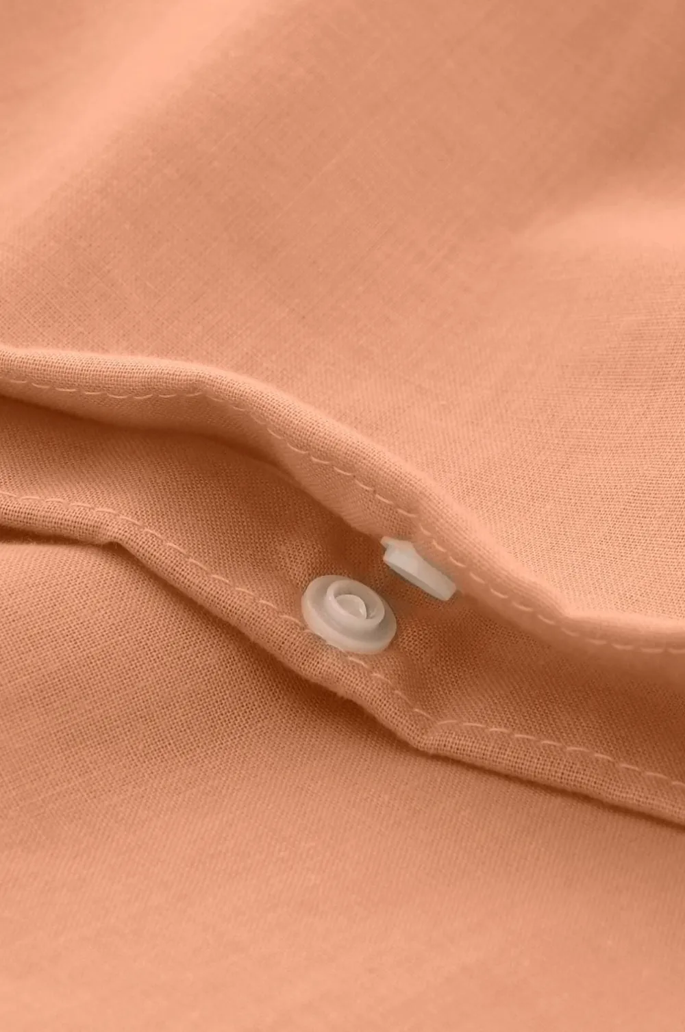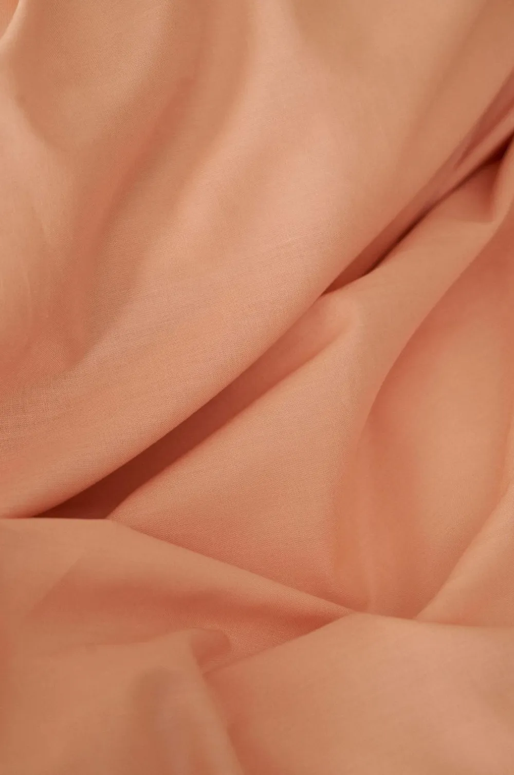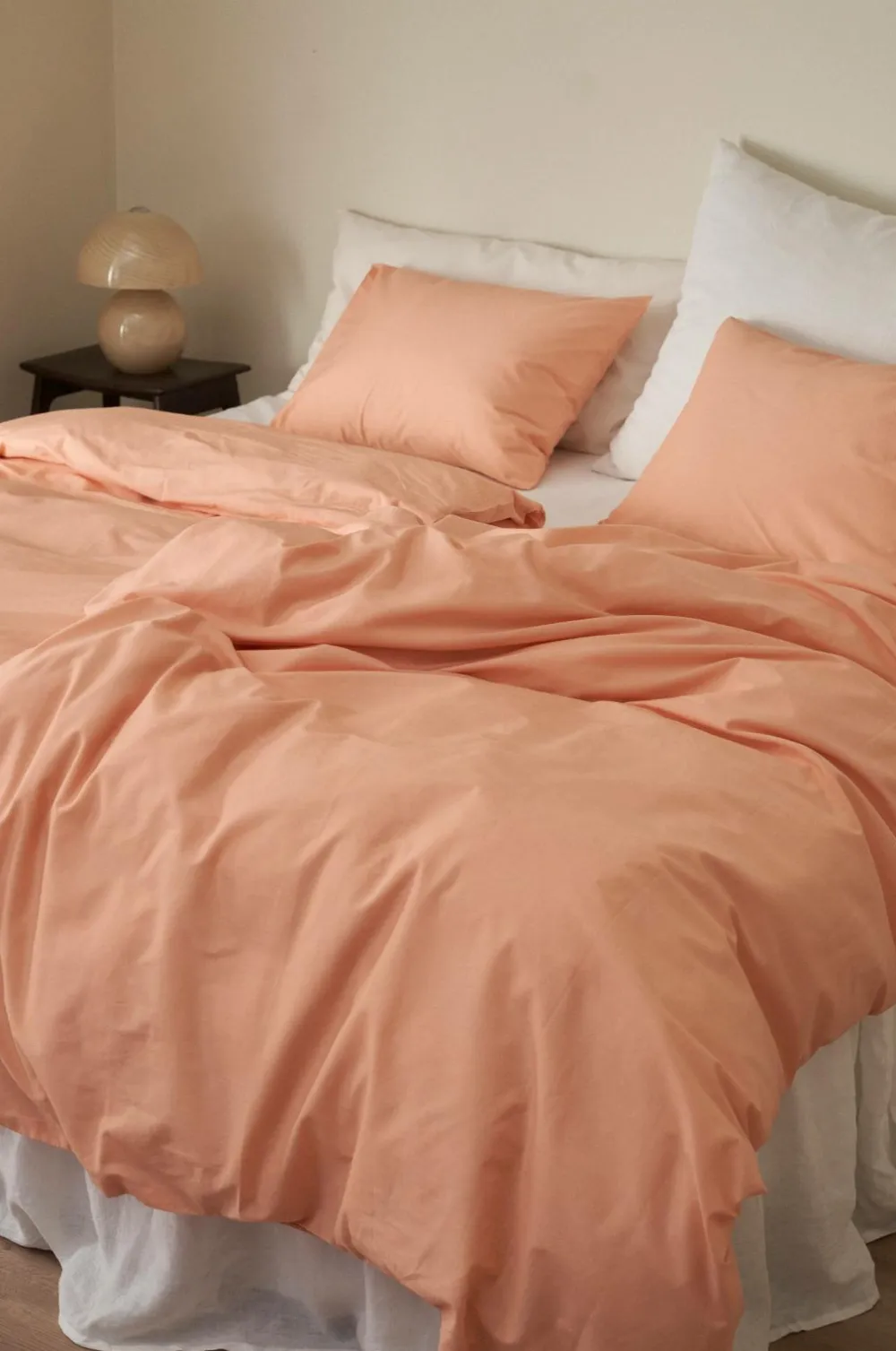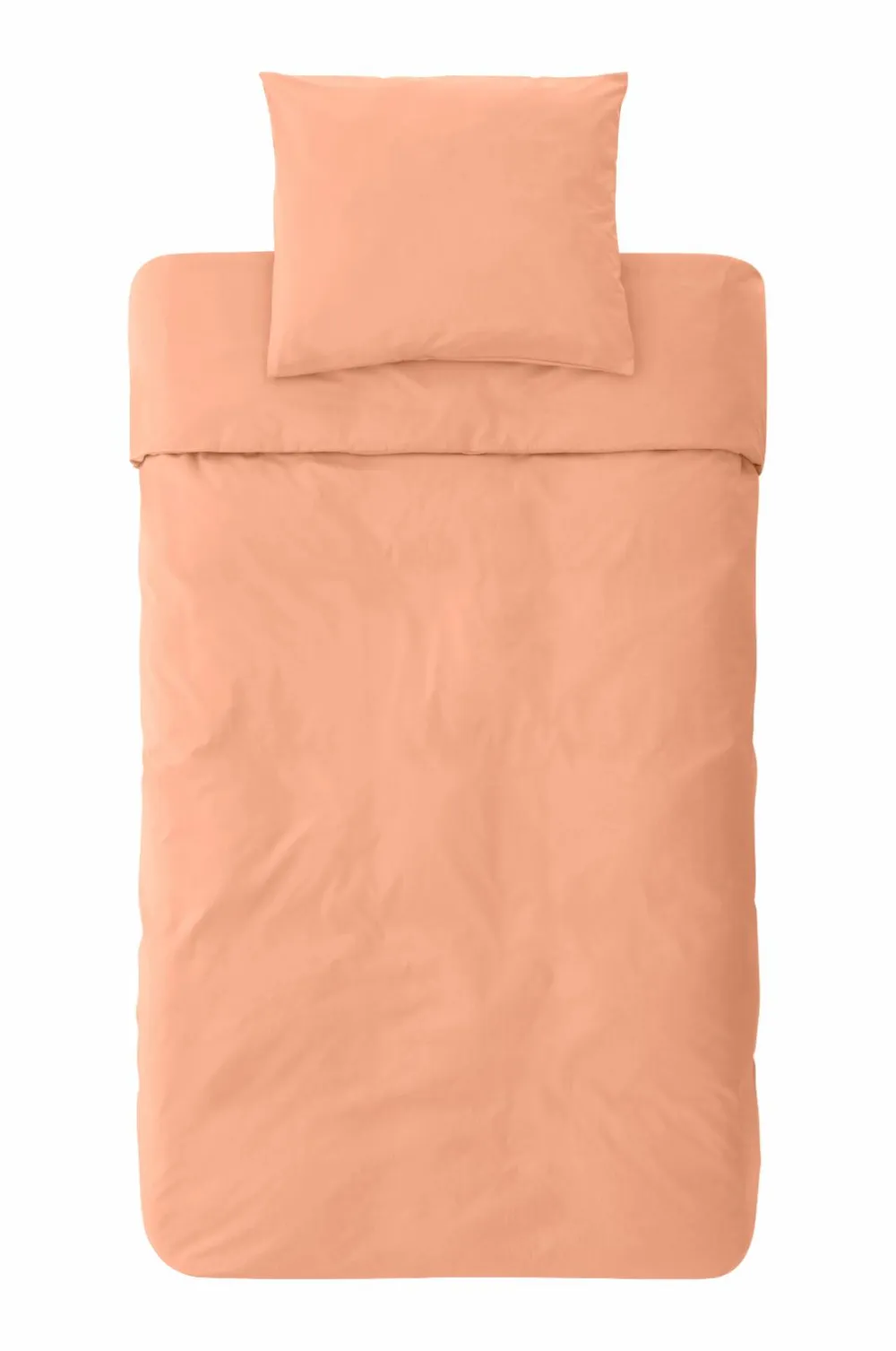 Ensfarvet sengesæt i blød, vasket bomuld. Trådtæthed 144 TC. Dynebetræk med huller i siden til brug ved opredning.