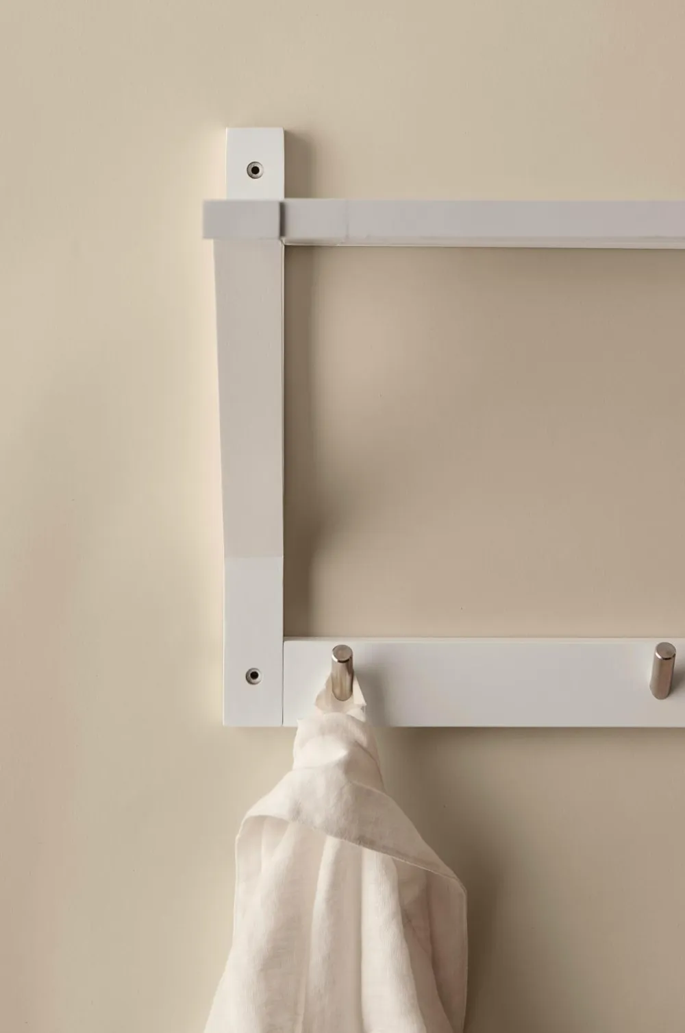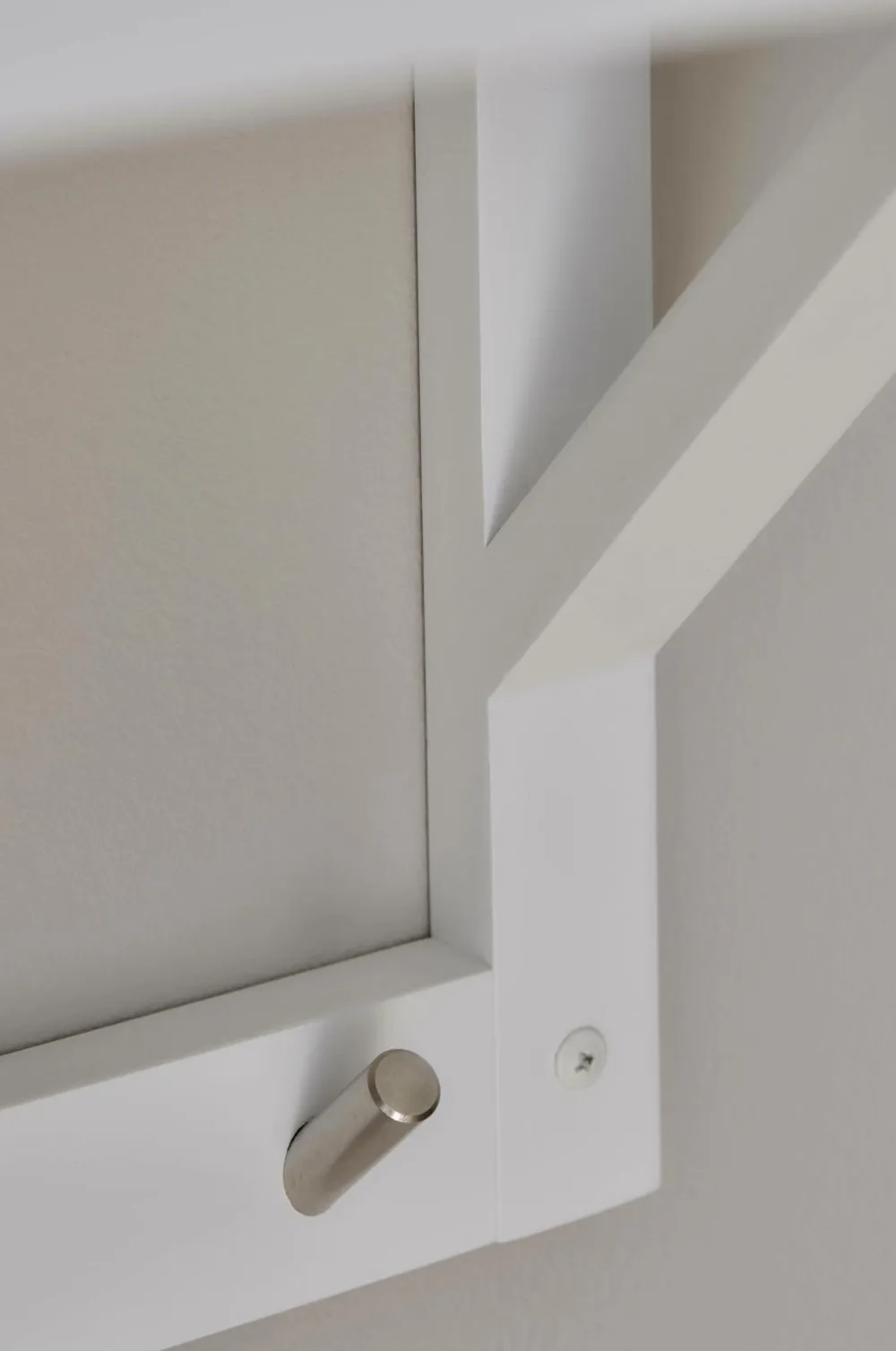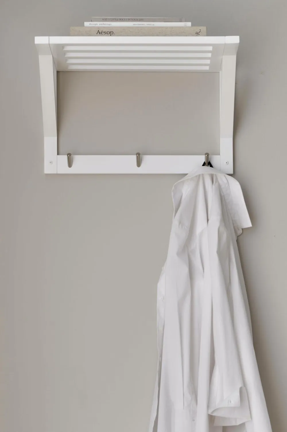 Hattehylde af malet birk med 3 knager af metal. Monteres på væggen. Længde 50 cm. Højde 34 cm. Dybde 32 cm. Lev. usamlet.