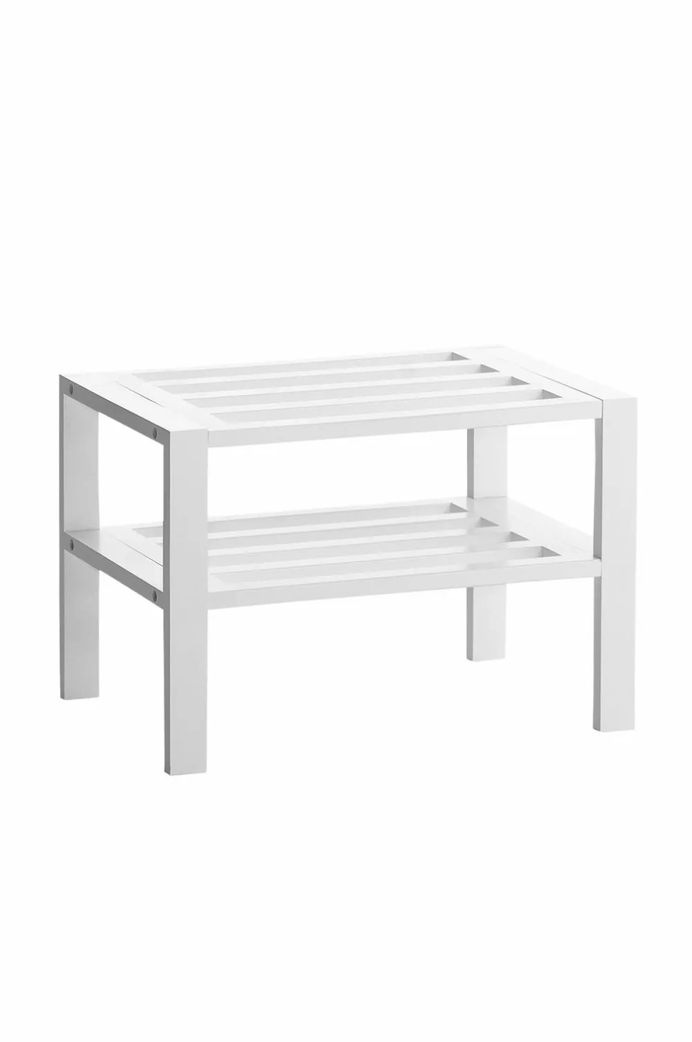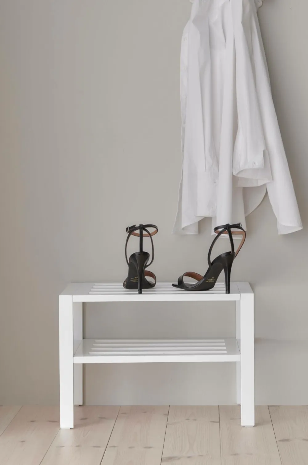 Skoreol af malet birk med 2 hylder. Højde 34 cm. Bredde 50 cm. Dybde 34 cm. Højde mellem hylderne 14 cm. Lev. usamlet.