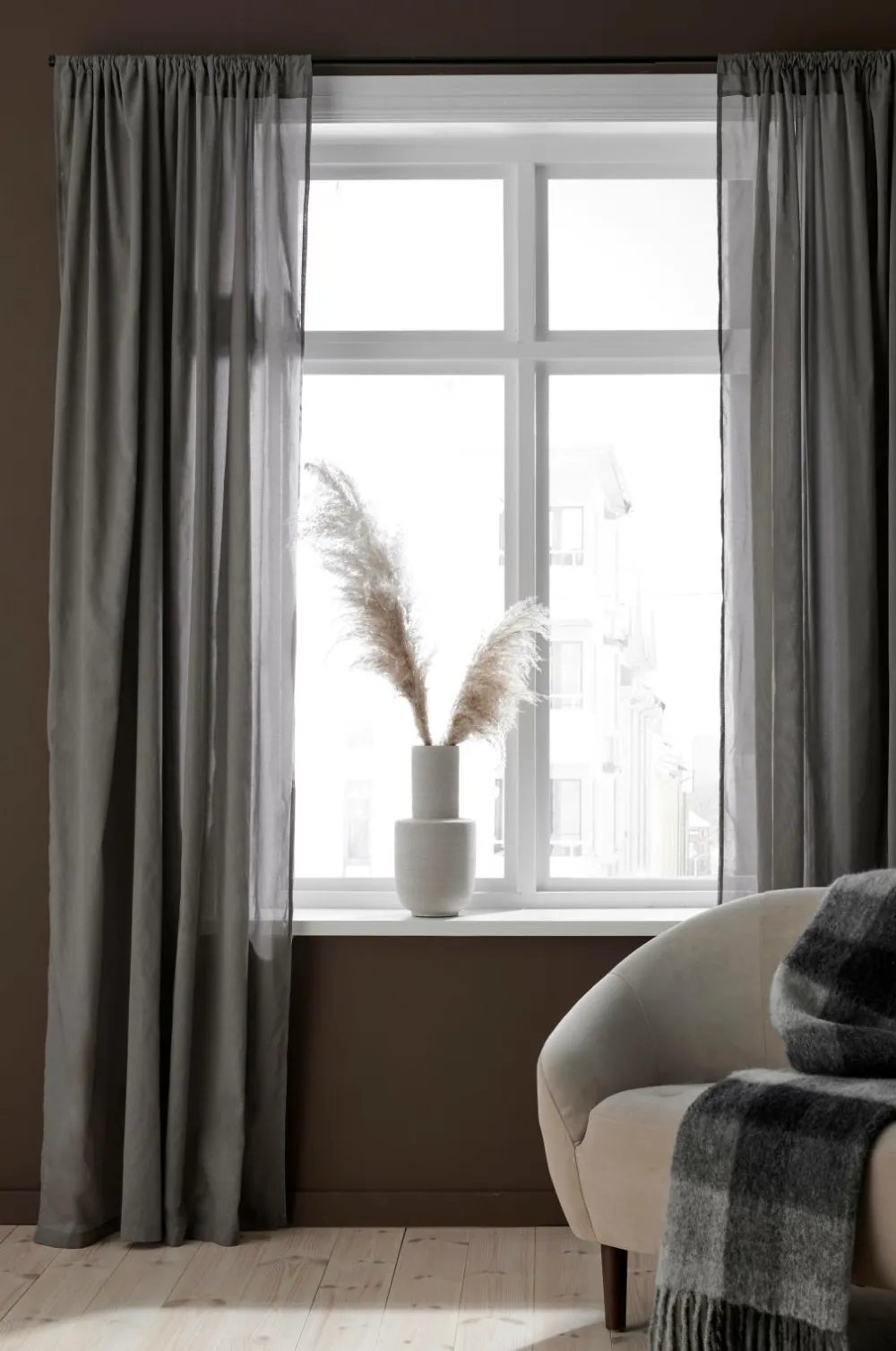 To gardiner i luftig voile af bomuld. Syet løbegang foroven. Bredde 145 cm. Tre længder: 160, 220 og 250 cm.