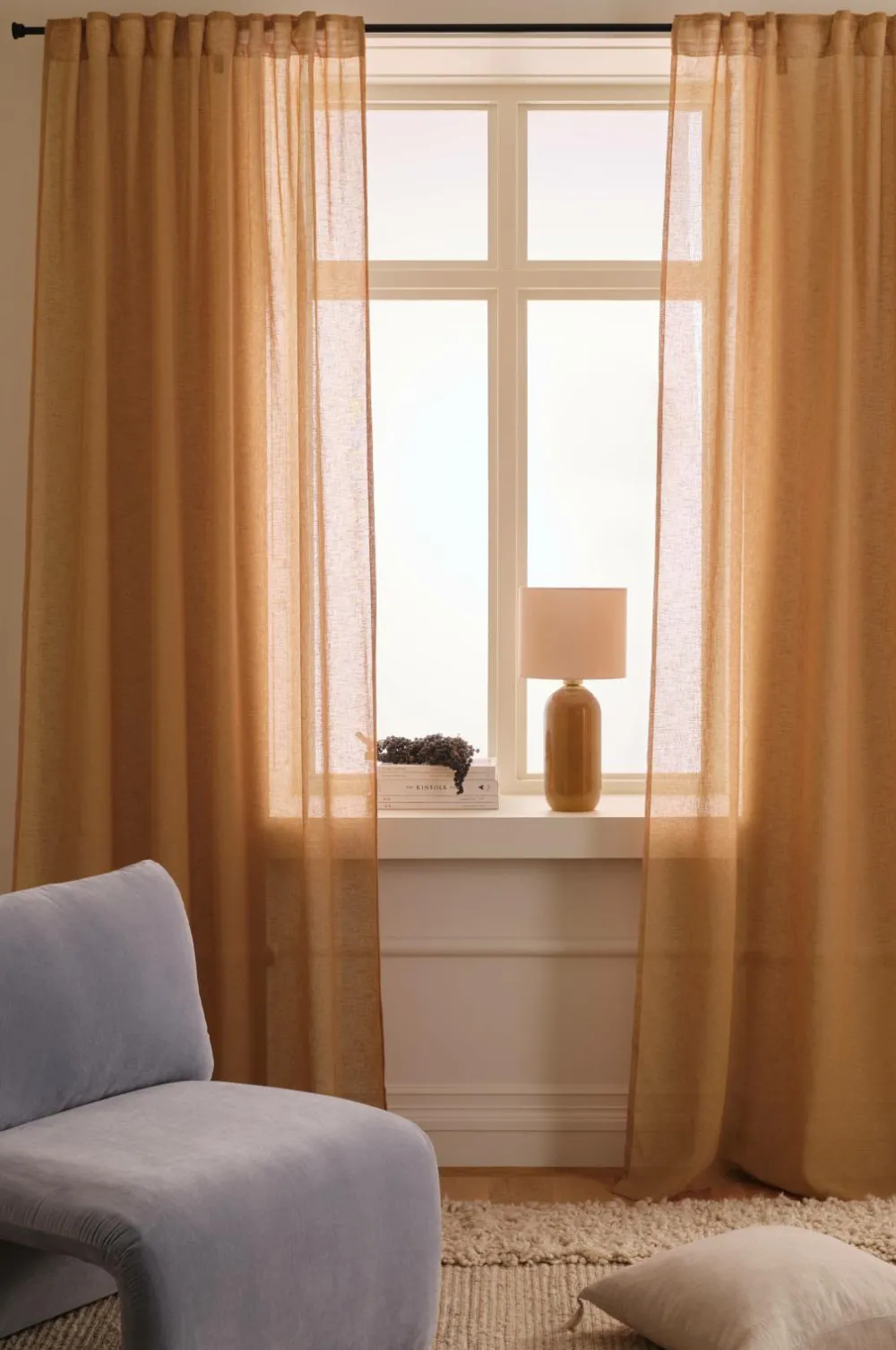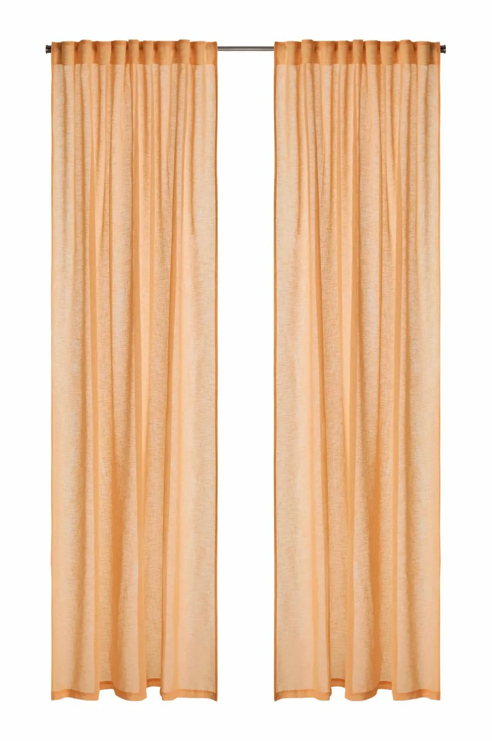 To multibåndsgardiner i løst vævet hørlook i blød, genindvundet polyester. Multibåndet gør, at du enten kan hænge gardinerne direkte på en gardinstang gennem de skjulte stropper eller anvende ringe, nålekroge eller fingerkroge. Snoren i rynkebåndet gør, at du let kan skabe ensartede, flotte læg.