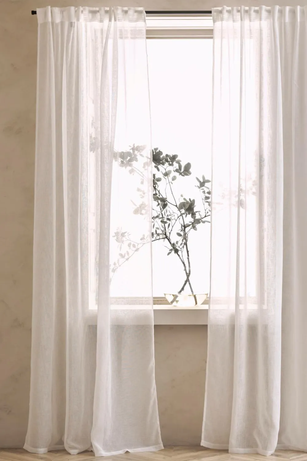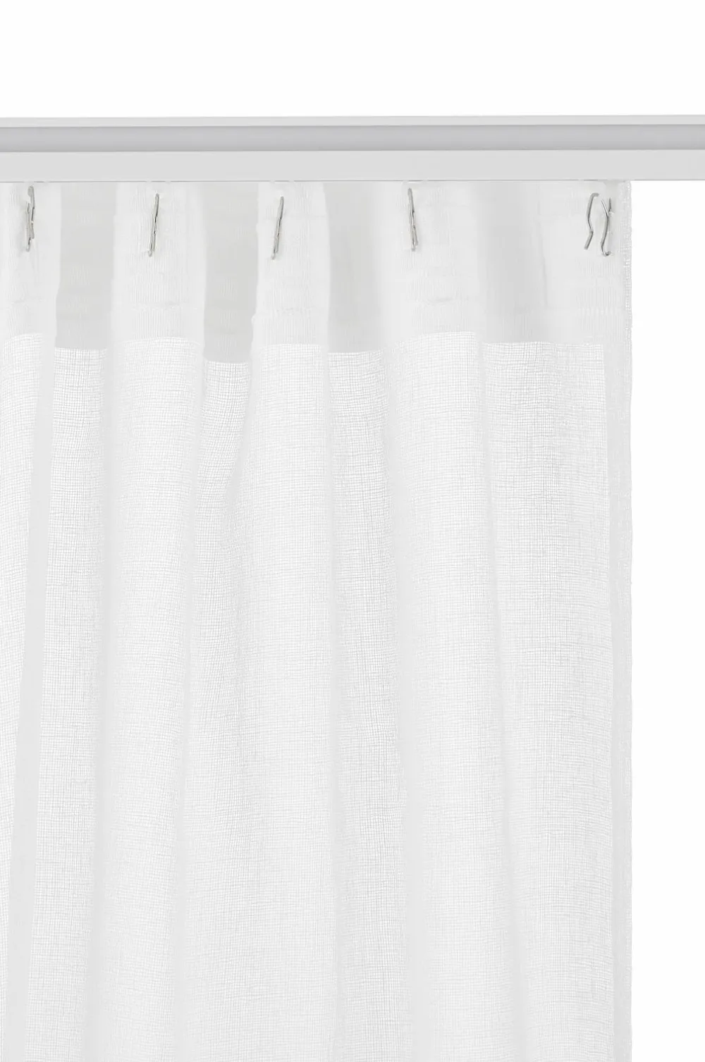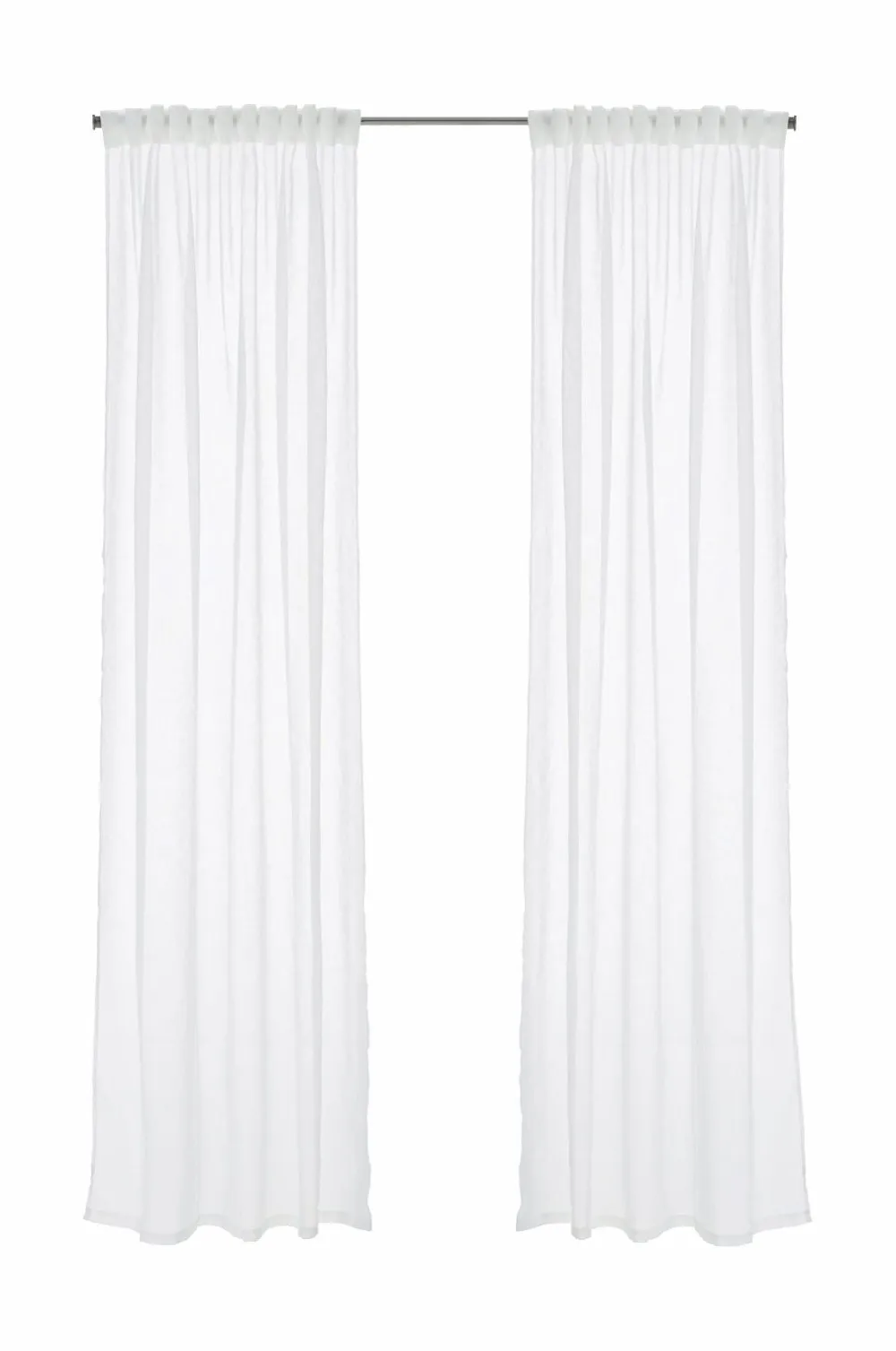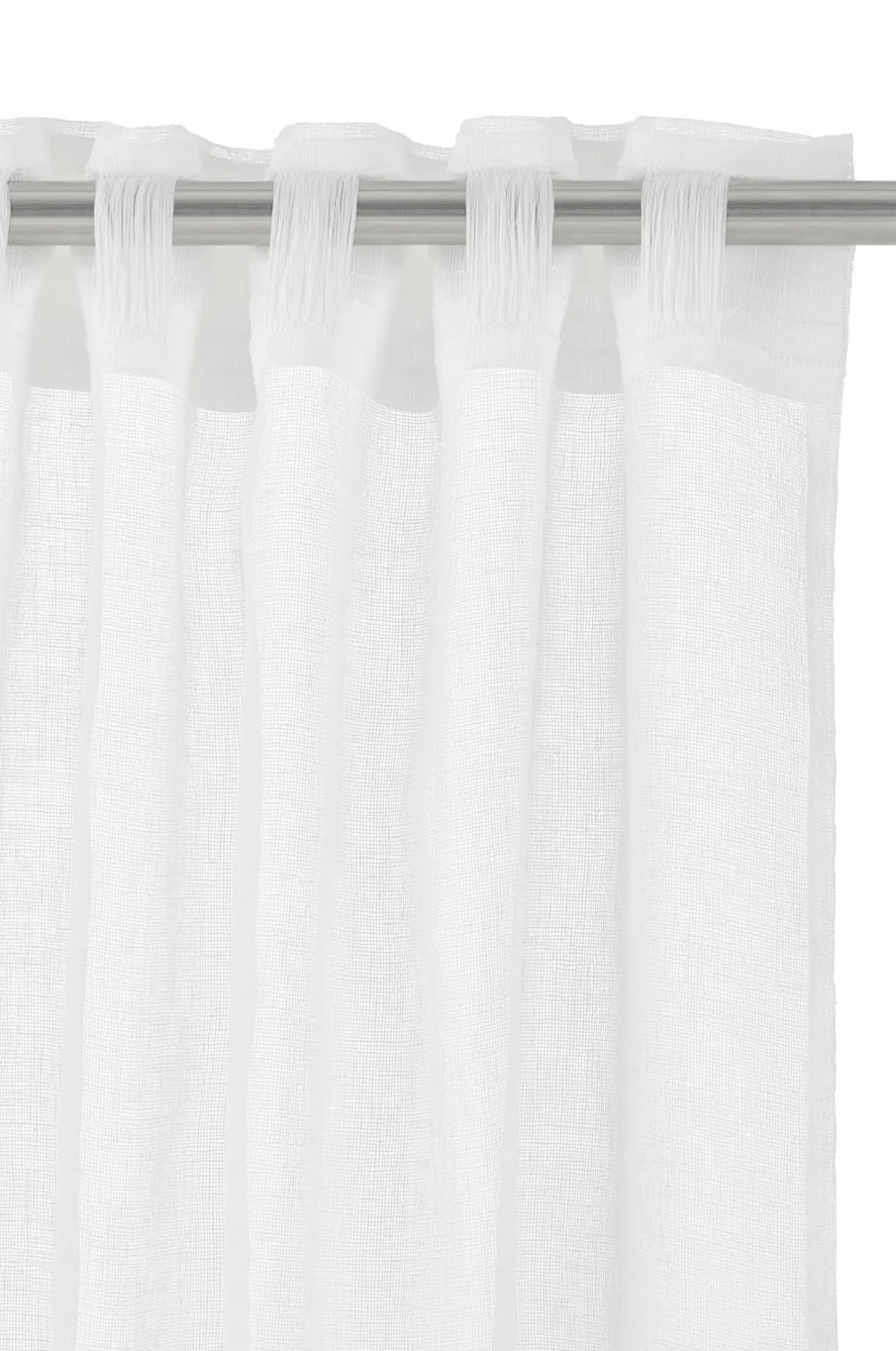 To multibåndsgardiner i løst vævet hørlook i blød, genindvundet polyester. Multibåndet gør, at du enten kan hænge gardinerne direkte på en gardinstang gennem de skjulte stropper eller anvende ringe, nålekroge eller fingerkroge. Snoren i rynkebåndet gør, at du let kan skabe ensartede, flotte læg.