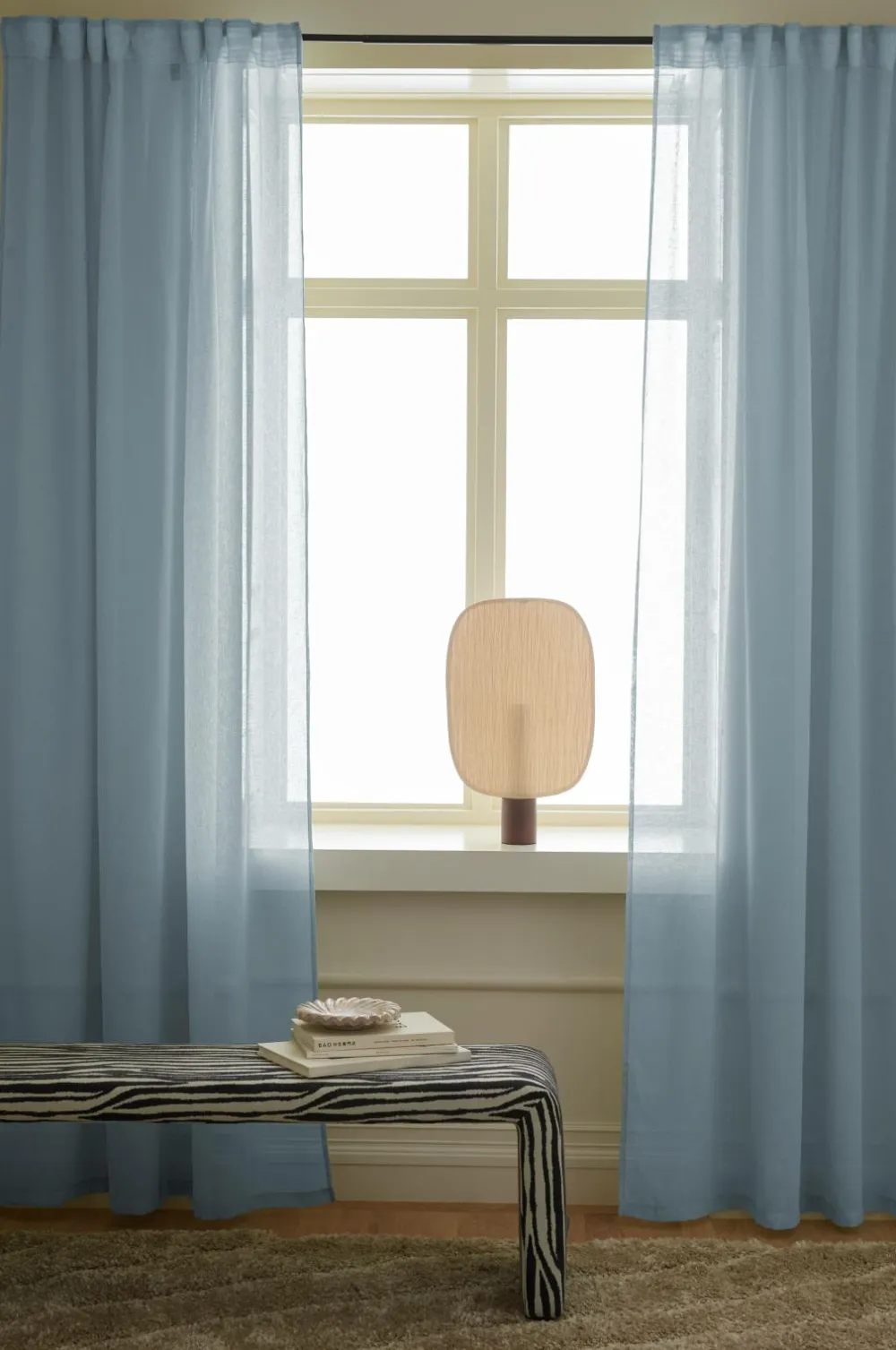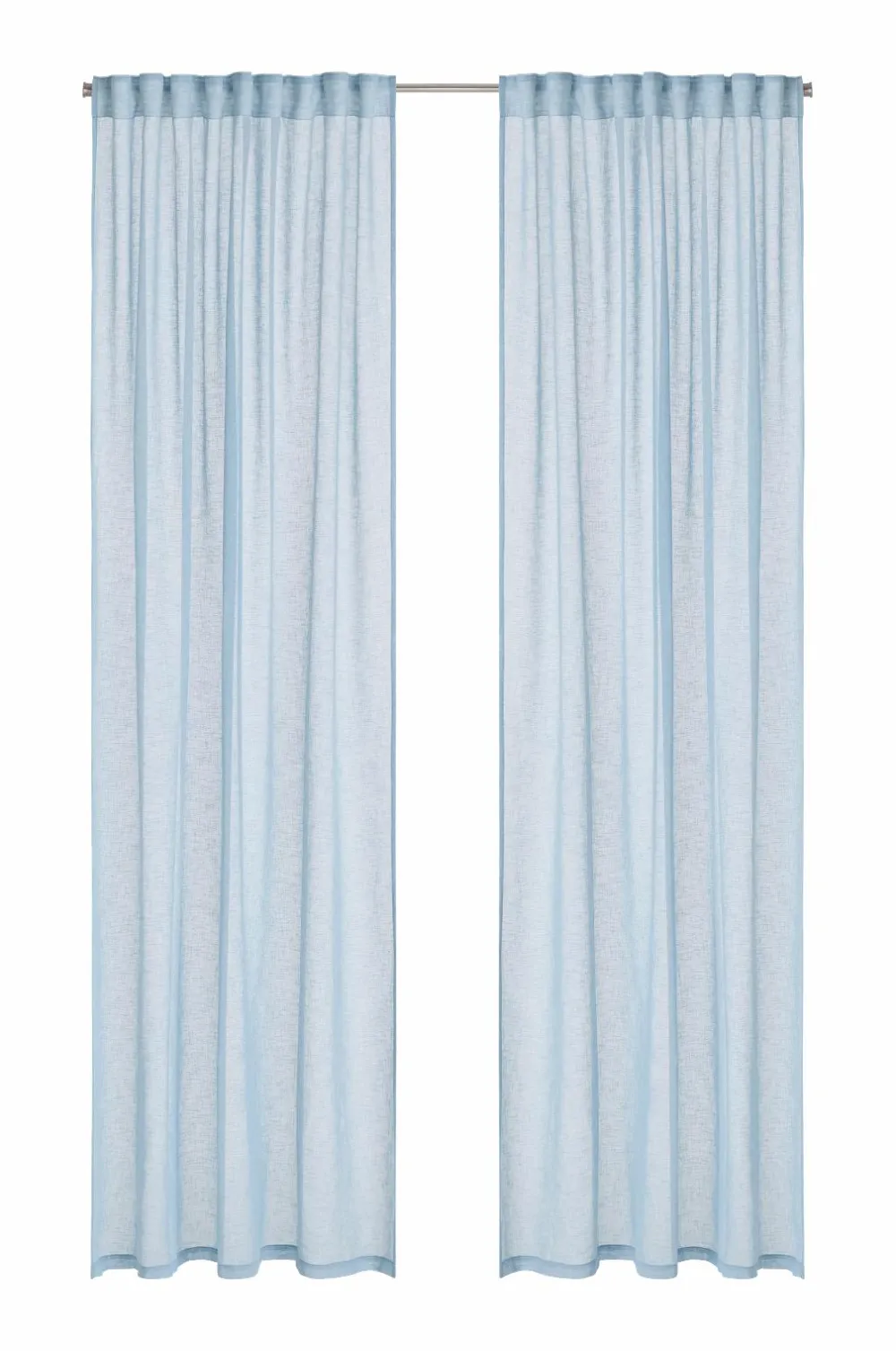 To multibåndsgardiner i løst vævet hørlook i blød, genindvundet polyester. Multibåndet gør, at du enten kan hænge gardinerne direkte på en gardinstang gennem de skjulte stropper eller anvende ringe, nålekroge eller fingerkroge. Snoren i rynkebåndet gør, at du let kan skabe ensartede, flotte læg.
