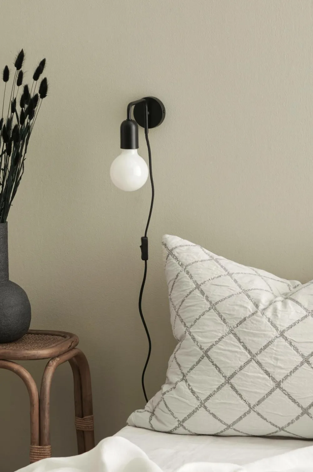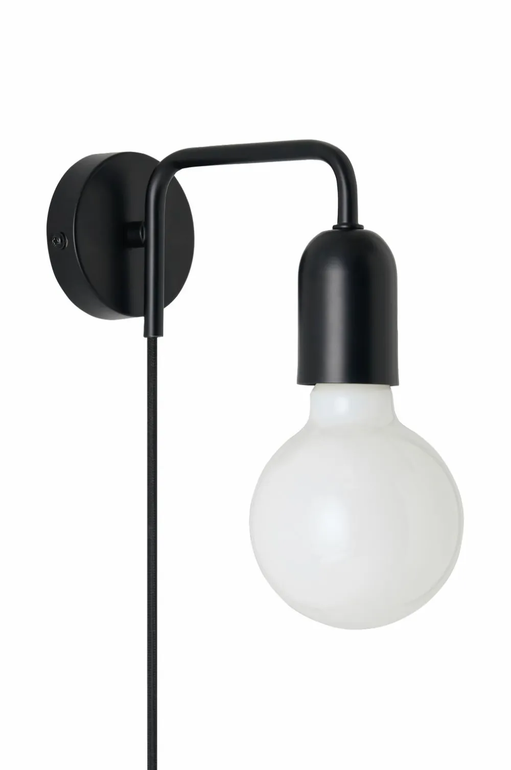 En væglampe i moderne design som også er egnet som sengelampe. Af metal. Stofledning med strømafbryder. Diameter på vægbeslag 8 cm.