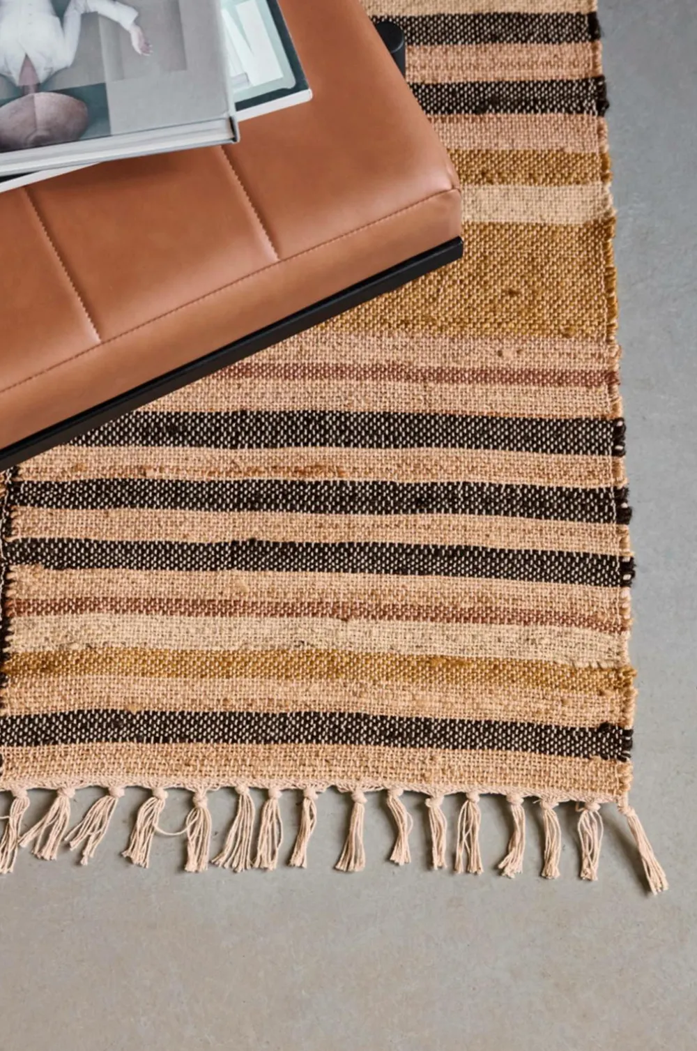 Dette tæppe er håndlavet af en blanding af jute og bomuld og har et fantastisk flerfarvet mønster i varme nuancer, som giver dit hjem et moderne og hyggeligt præg. De frynsede kanter giver et ekstra lag af stil, så det passer perfekt til din stue, under spisebordet eller i en rummelig gang. Perfekt til opholdsrum. Skab varme og charme i din indretning med dette smukke tæppe.