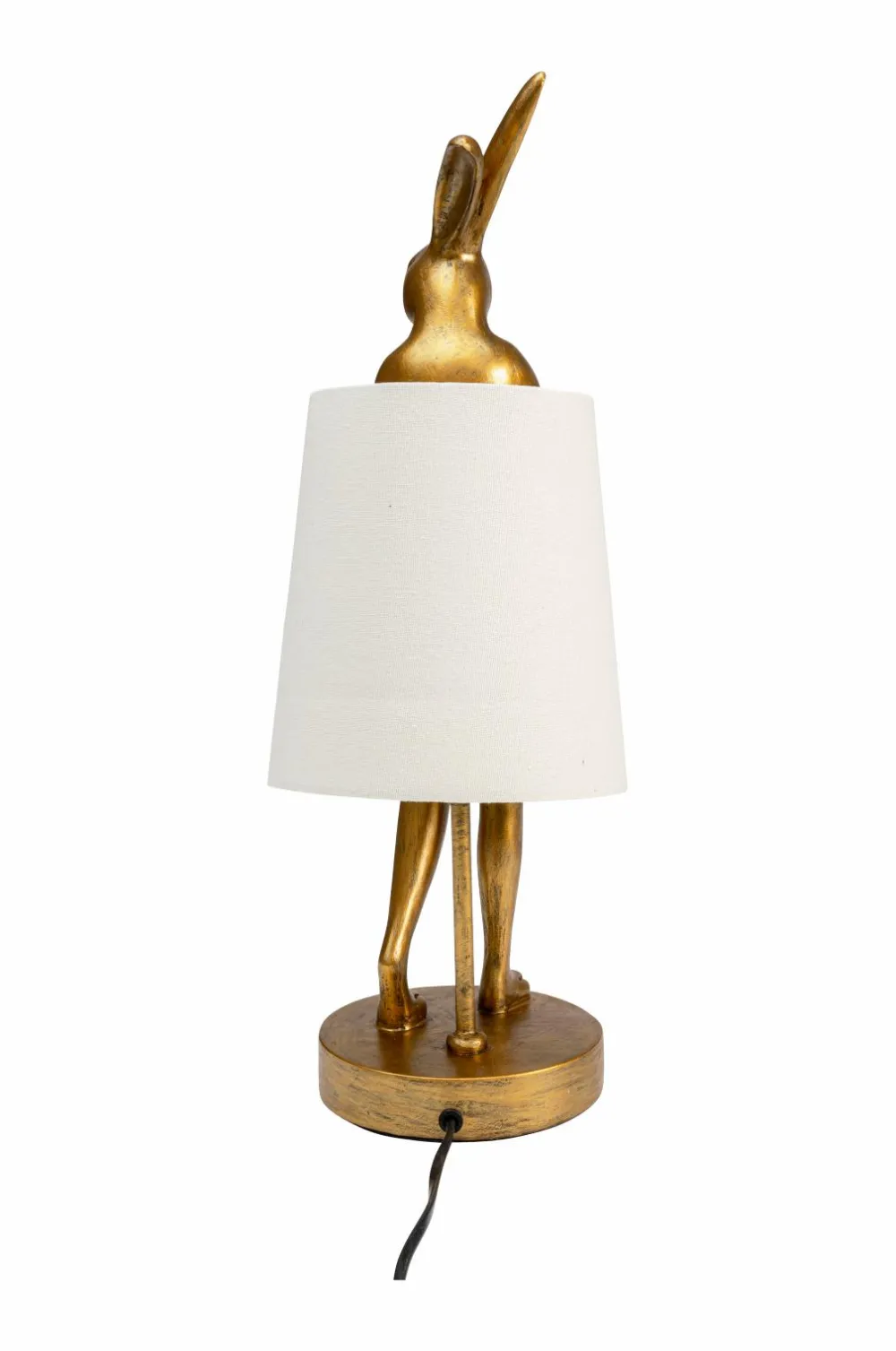 Med denne bordlampe på 50 x 17 x 20 cm (hxbxd) kan du skabe helt særlige højdepunkter i din stue eller dit soveværelse. Den dekorative guldfarvede kaninfigur af kunststen og den hvide skærm gør denne lampe til et ægte designerstykke.