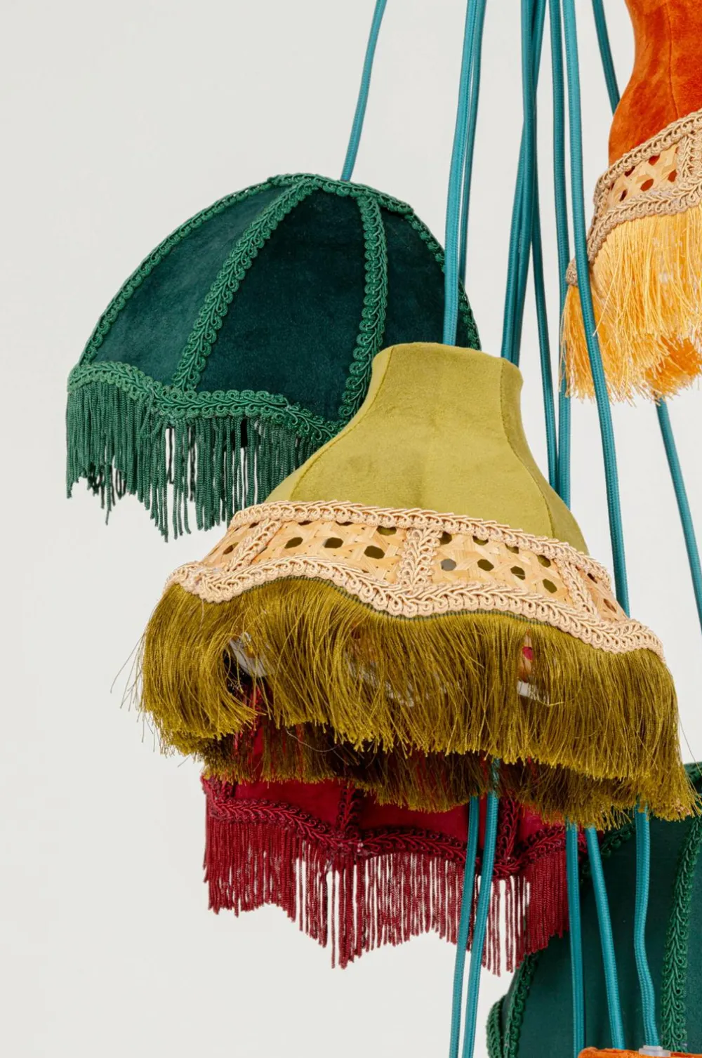 Et lysende ensemble fuld af nostalgi og raffinement: Denne overdådige pendel med ti individuelt designede skærme forfører med delikate frynser, silkeagtigt stof og kærlige detaljer. Dæmpede farvenuancer i harmonisk samspil giver designet en rolig, hyggelig aura – perfekt til stemningsfulde lysøer over spisebordet, i stuen eller som et romantisk højdepunkt i soveværelset. Kombinationen af blødt glimmer og vintage-accenter giver varme og personlighed til ethvert rum. Særligt udtryksfuld i indretninger med fløjl, træ eller mønstrede tekstiler. En lyskilde, der gør mere end bare at lyse – den fortæller historier.
